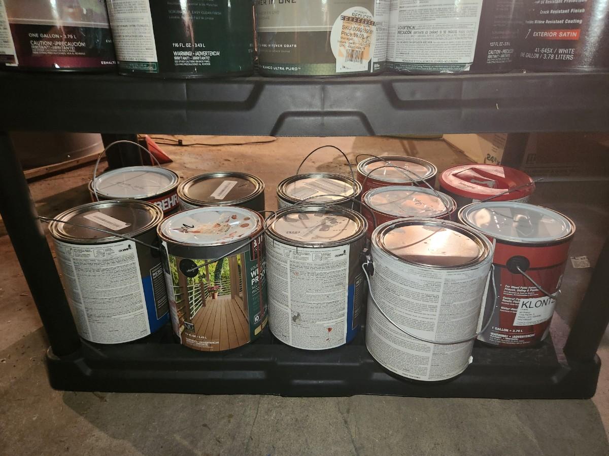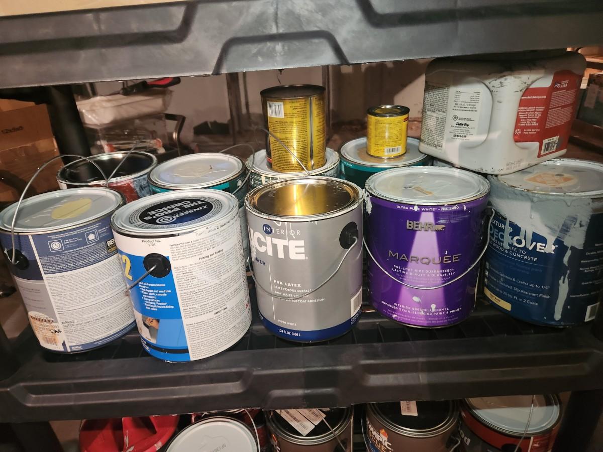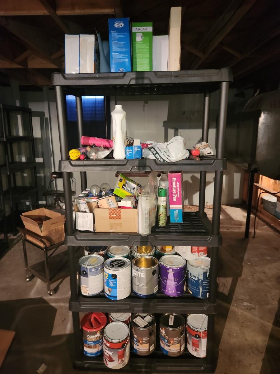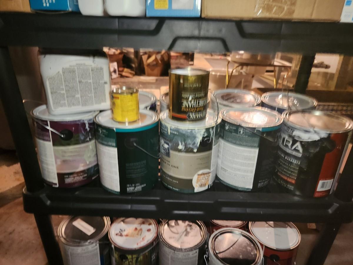 Includes the shelving unit and some of the items included in the lot are quite a few gallons of paint, a wide variety of light bulbs, paint rollers, scrapers, painting trays, a garden hose, and humidifier air filters.
