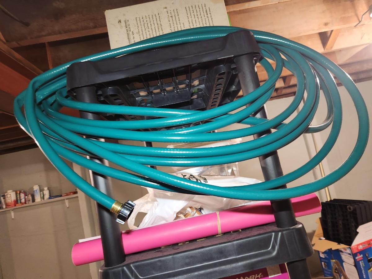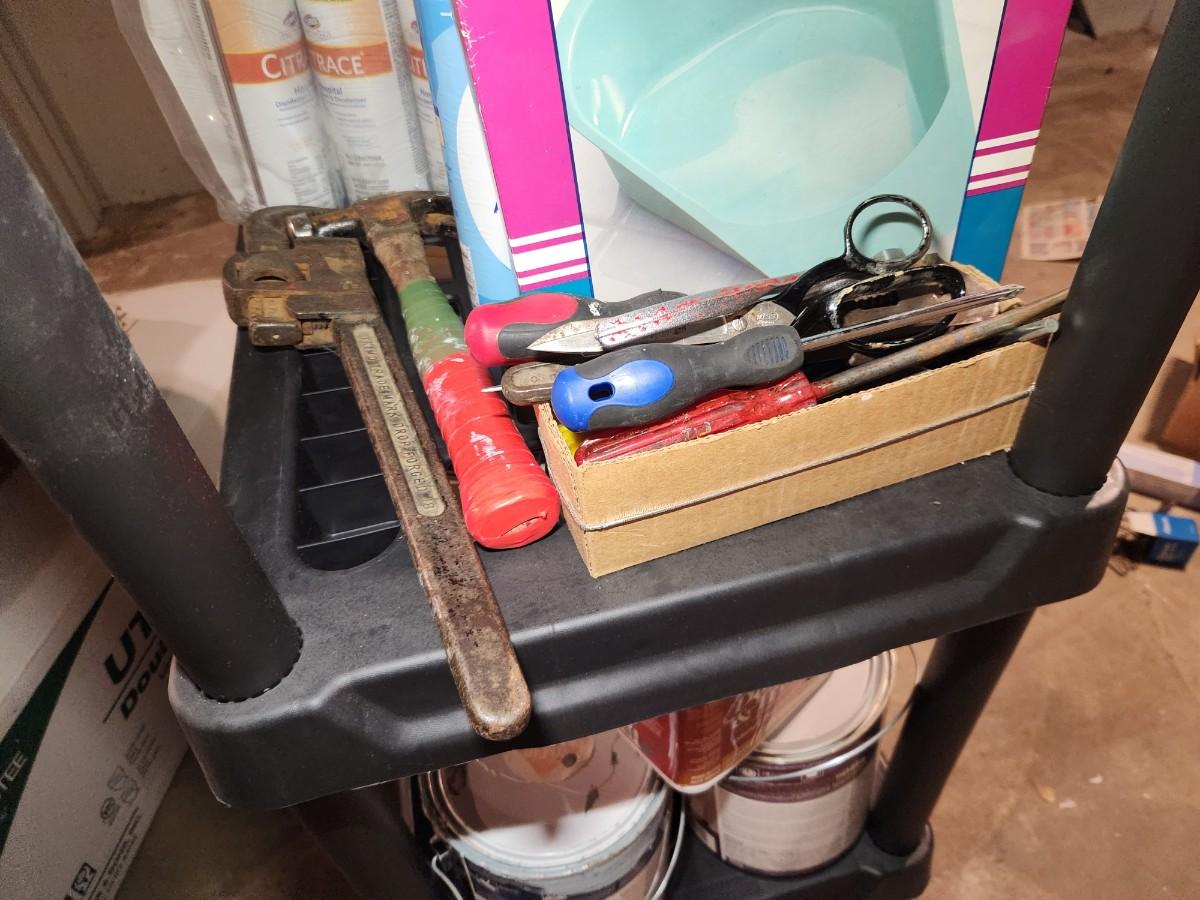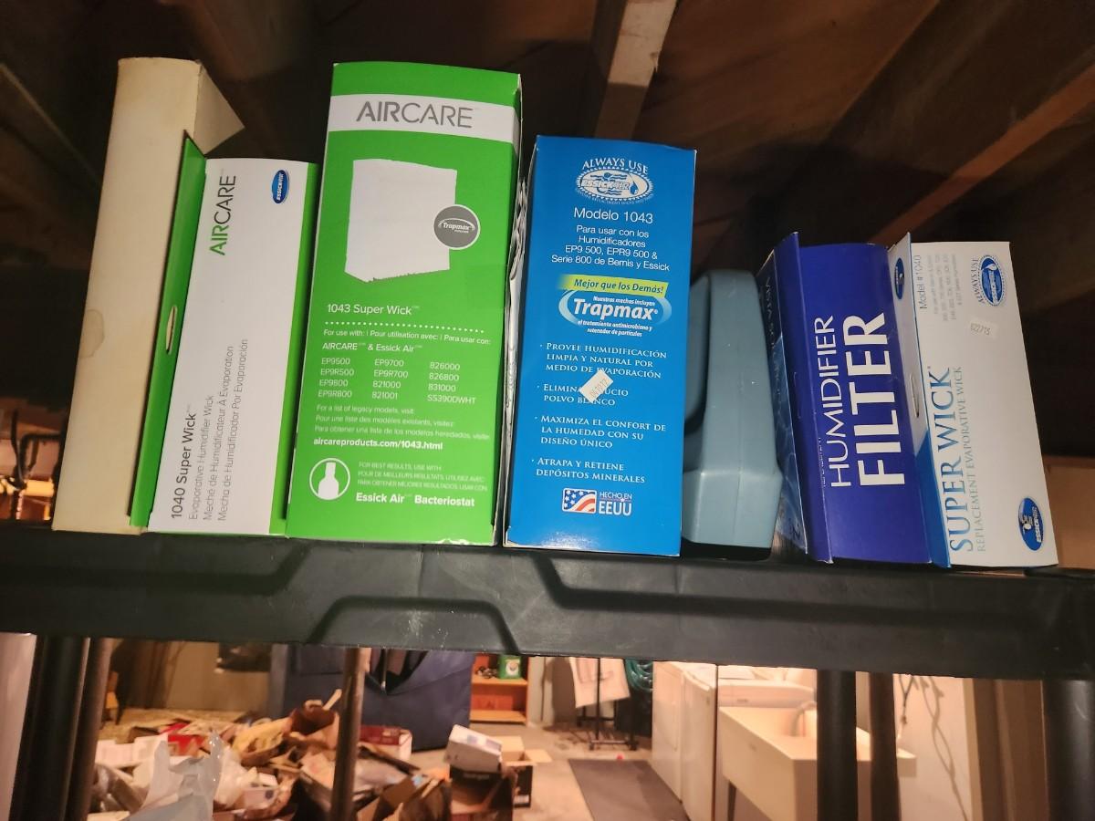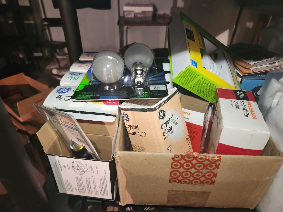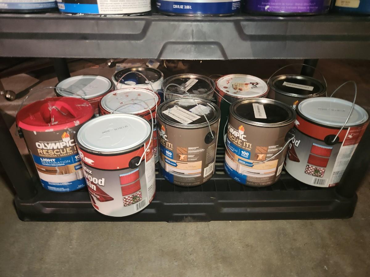 Includes the shelving unit and some of the items included in the lot are quite a few gallons of paint, a wide variety of light bulbs, paint rollers, scrapers, painting trays, a garden hose, and humidifier air filters.
