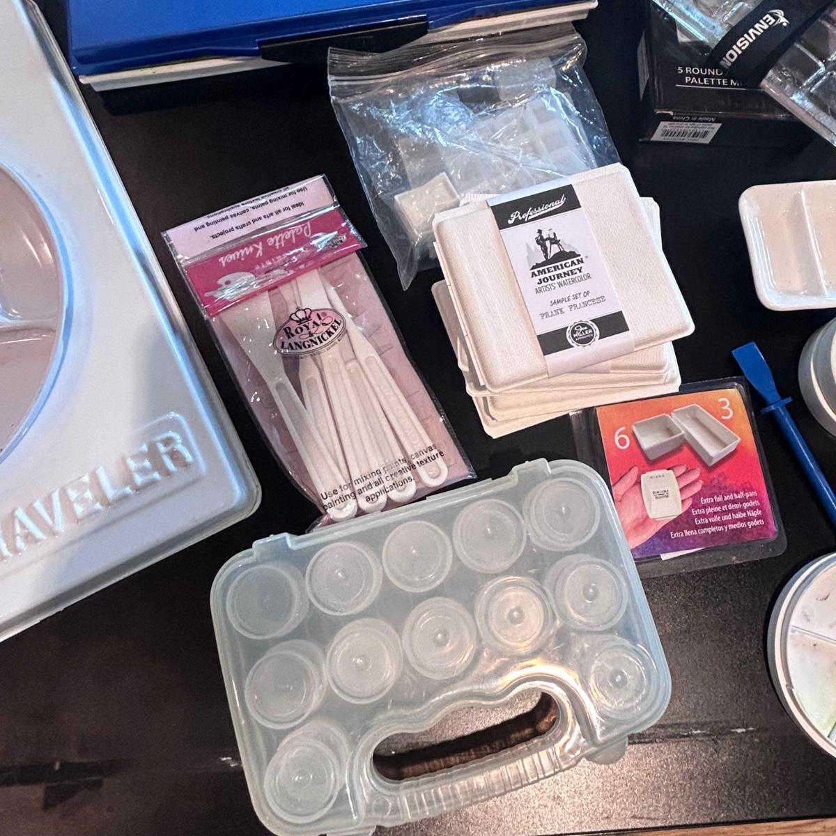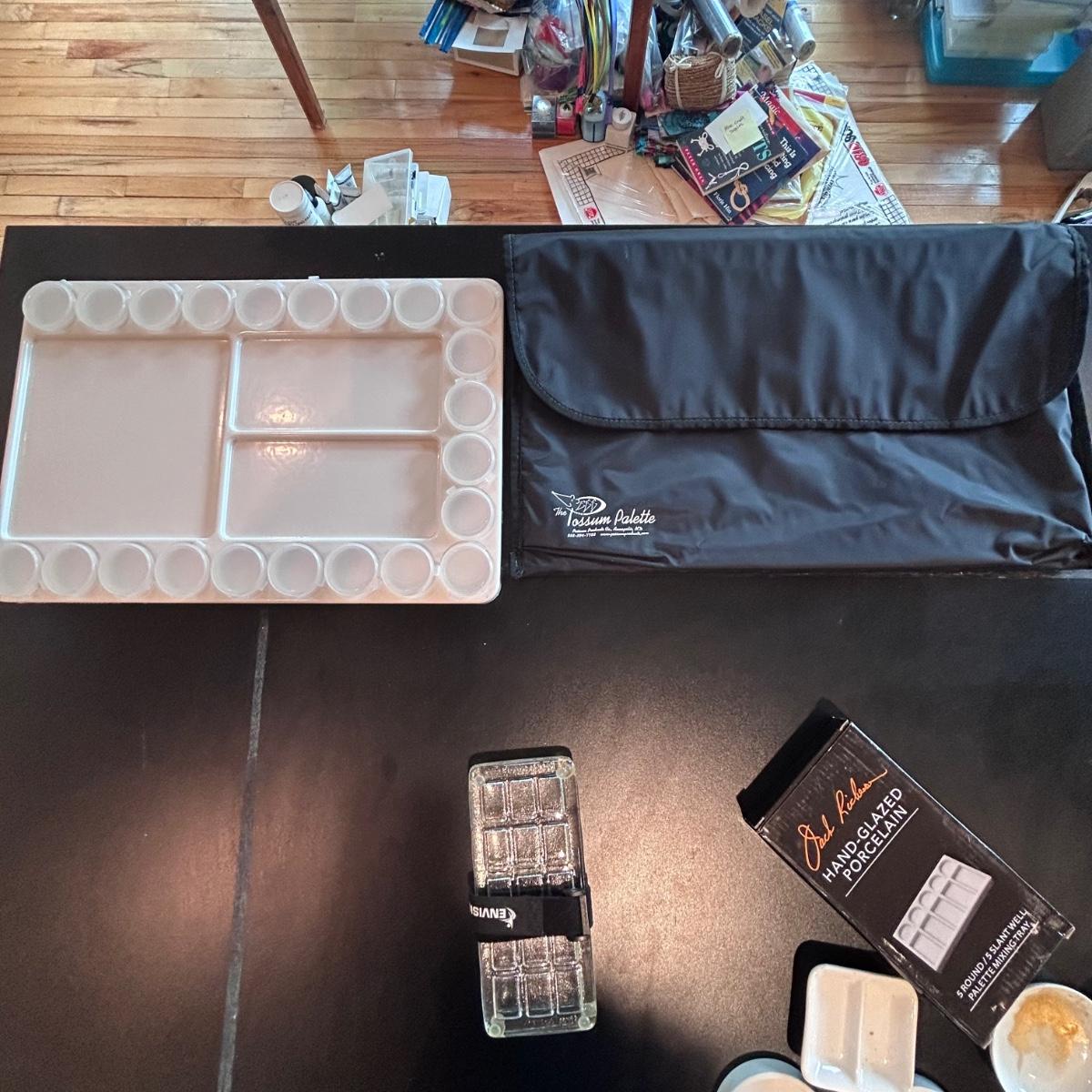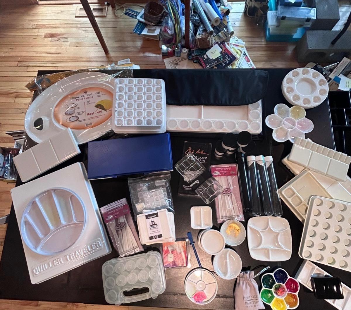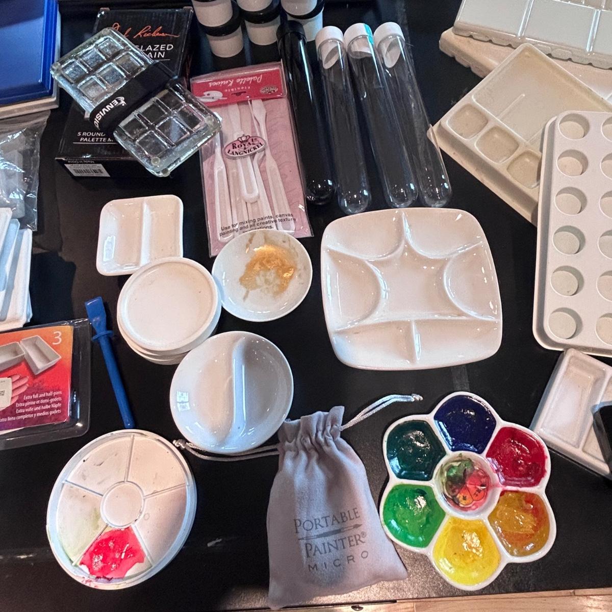 Large collection of palettes and storage for painting with oils and acrylics. Most are plastic but a few ceramic and metal. There are two packs of flexible palette knives still in packages. Most are unused but several are used and still have paint on them. There is a possum Palette with case and an Ellipse XL still in packaging. Shipping available.
