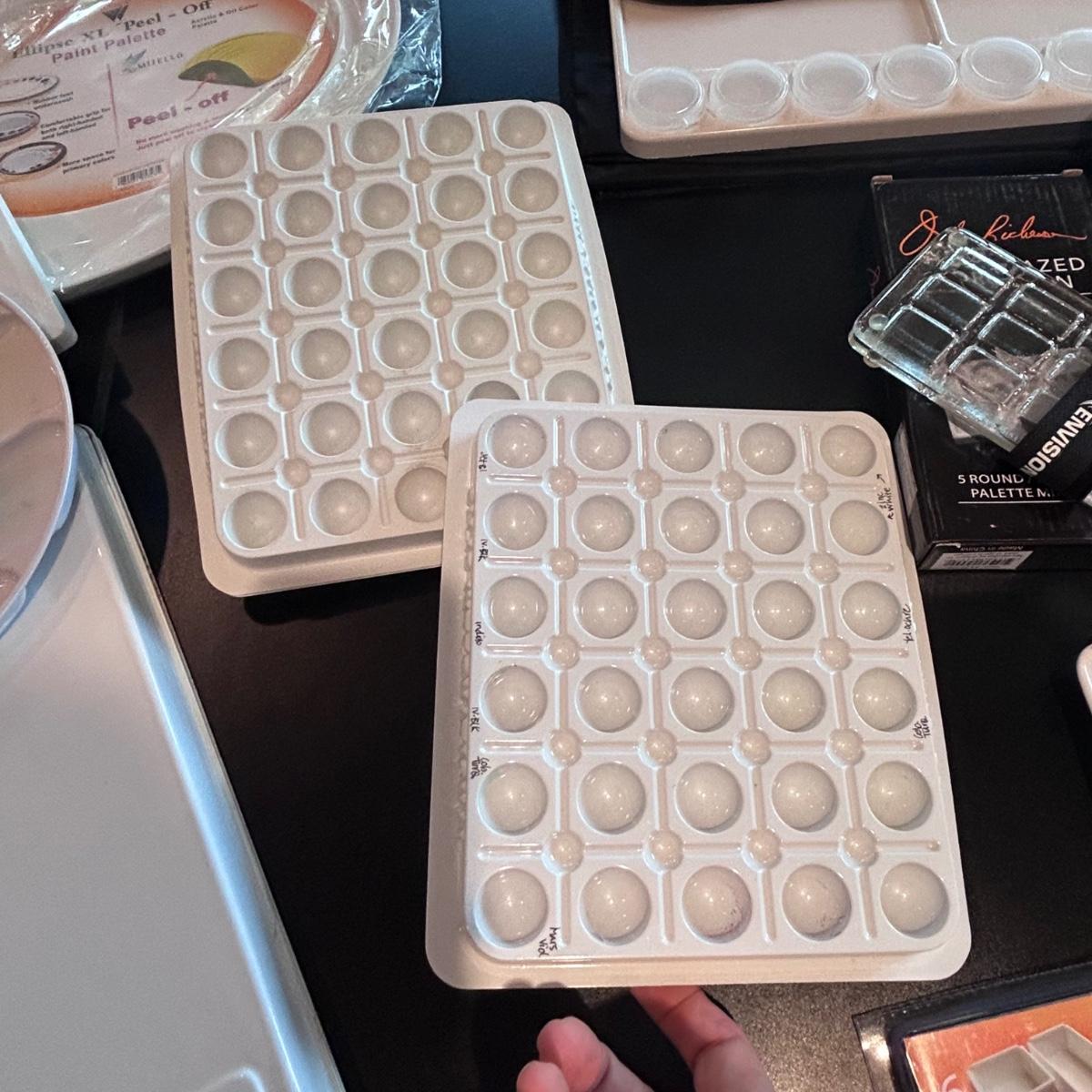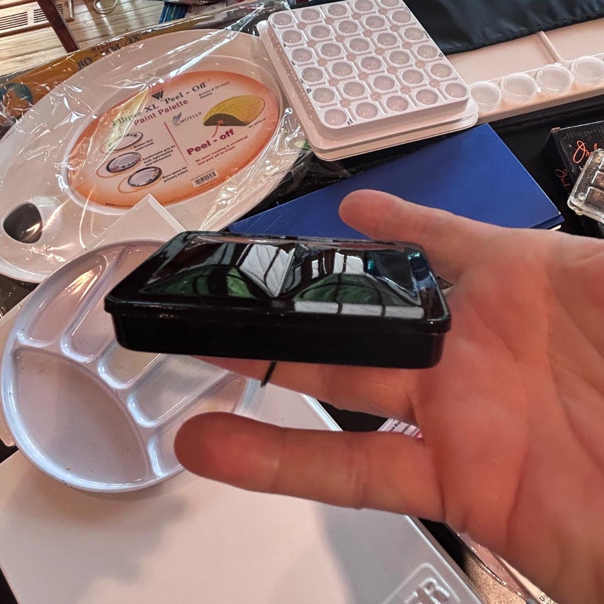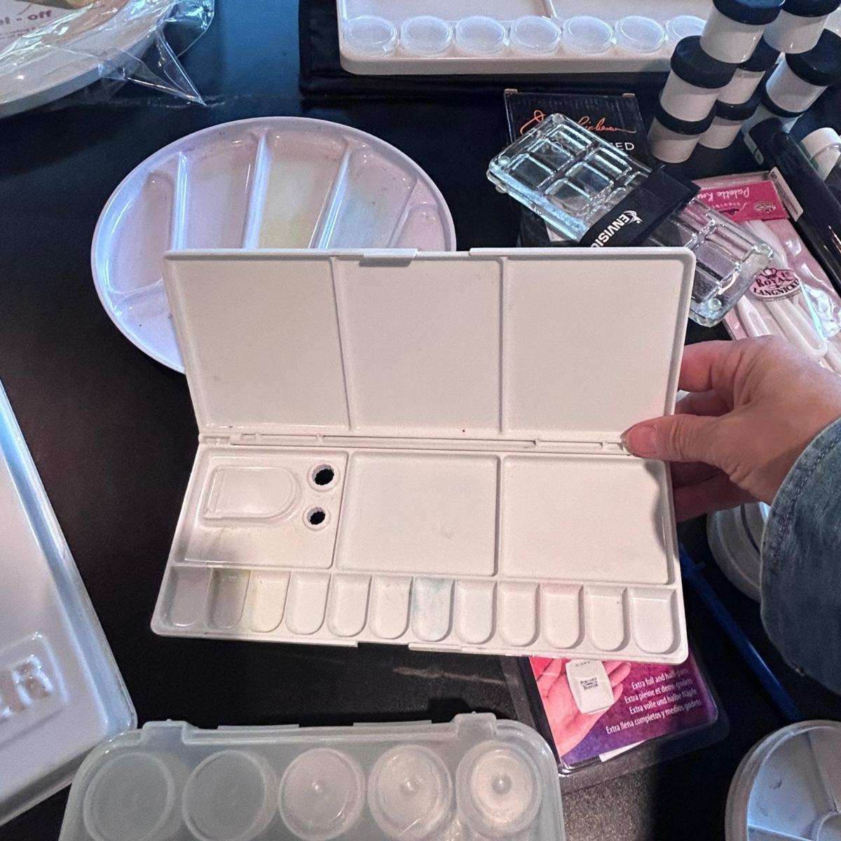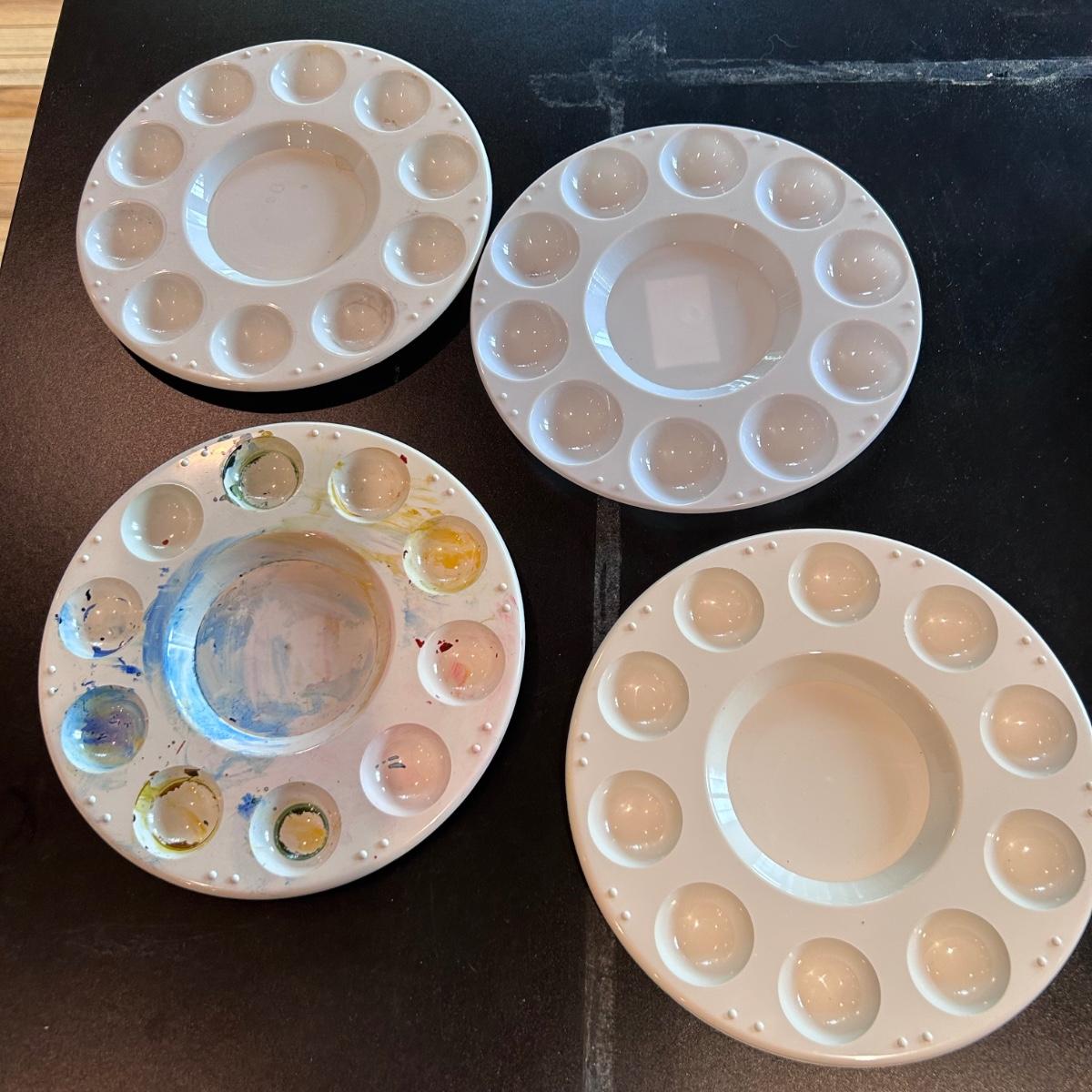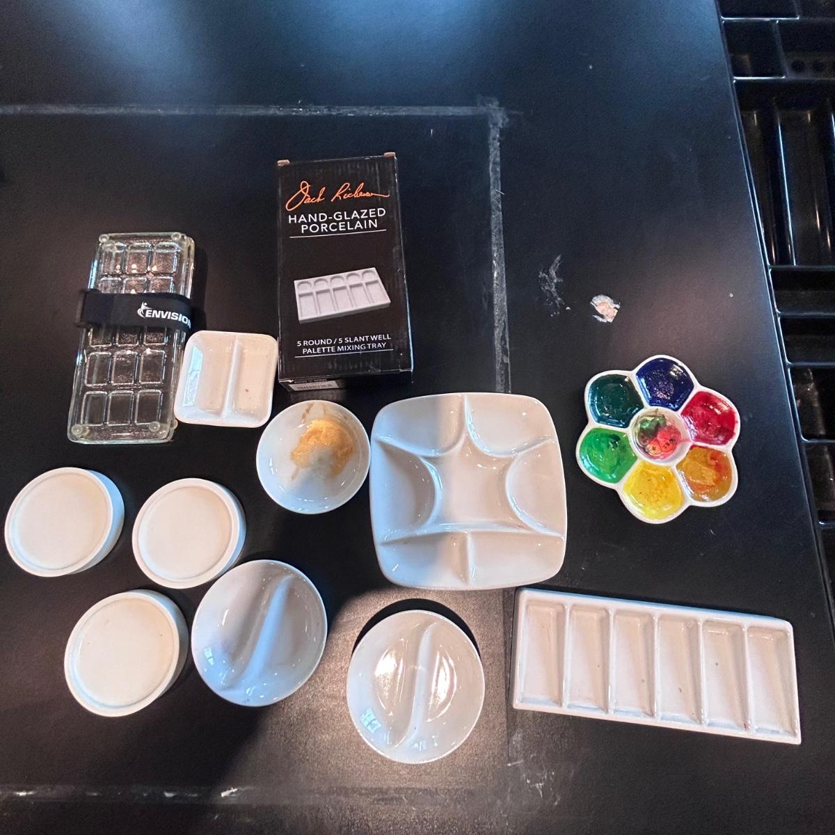 Large collection of palettes and storage for painting with oils and acrylics. Most are plastic but a few ceramic and metal. There are two packs of flexible palette knives still in packages. Most are unused but several are used and still have paint on them. There is a possum Palette with case and an Ellipse XL still in packaging. Shipping available.