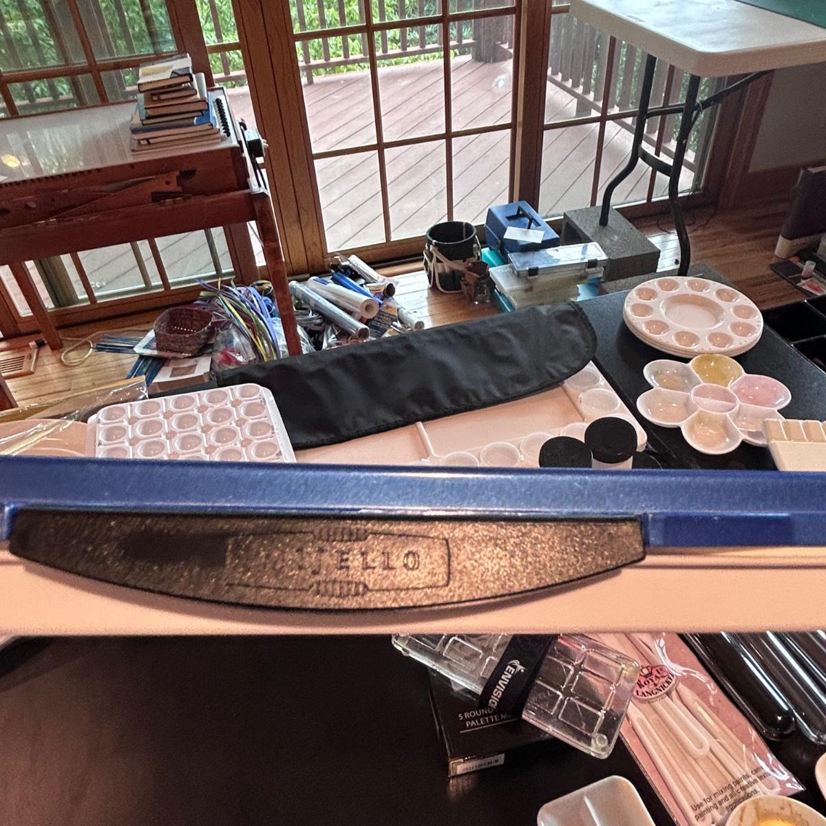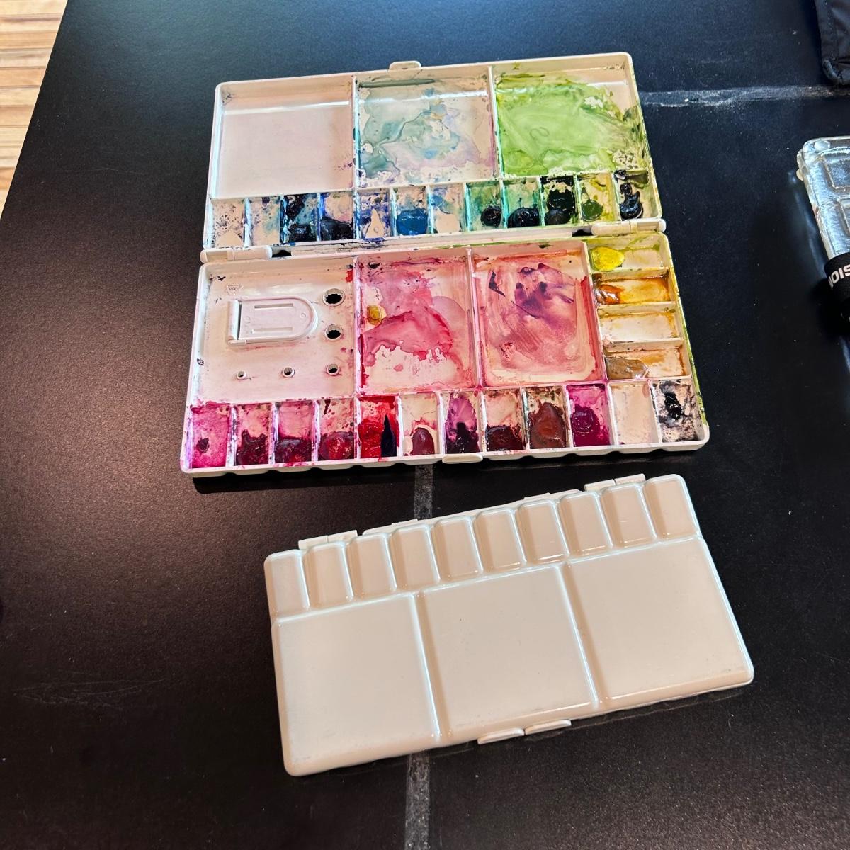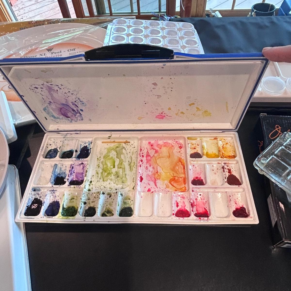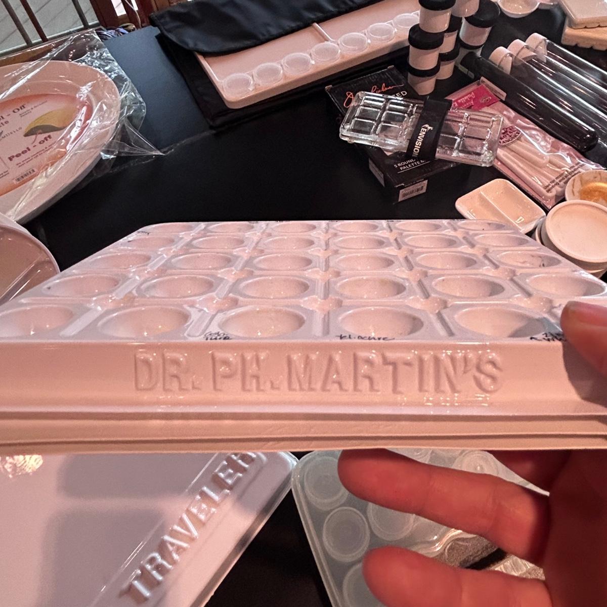 Large collection of palettes and storage for painting with oils and acrylics. Most are plastic but a few ceramic and metal. There are two packs of flexible palette knives still in packages. Most are unused but several are used and still have paint on them. There is a possum Palette with case and an Ellipse XL still in packaging. Shipping available.