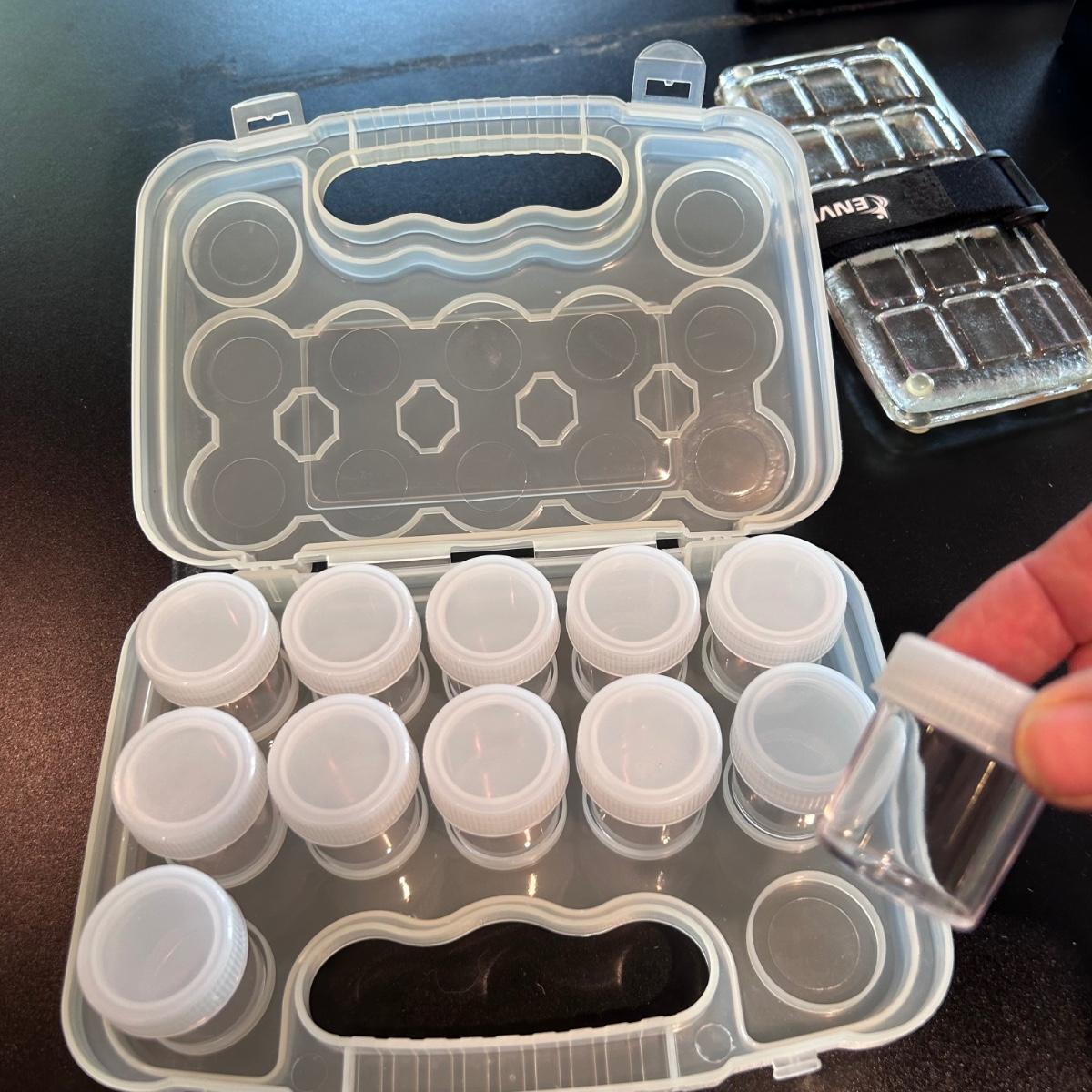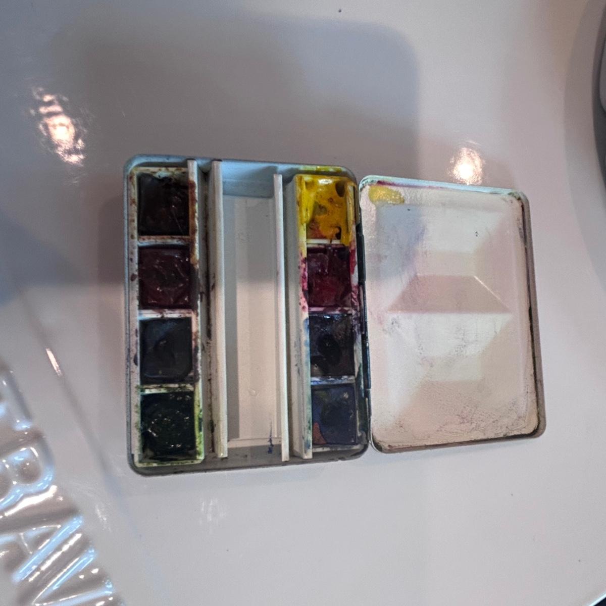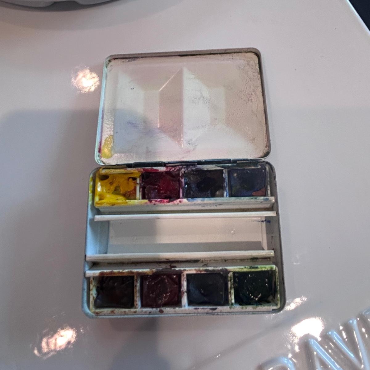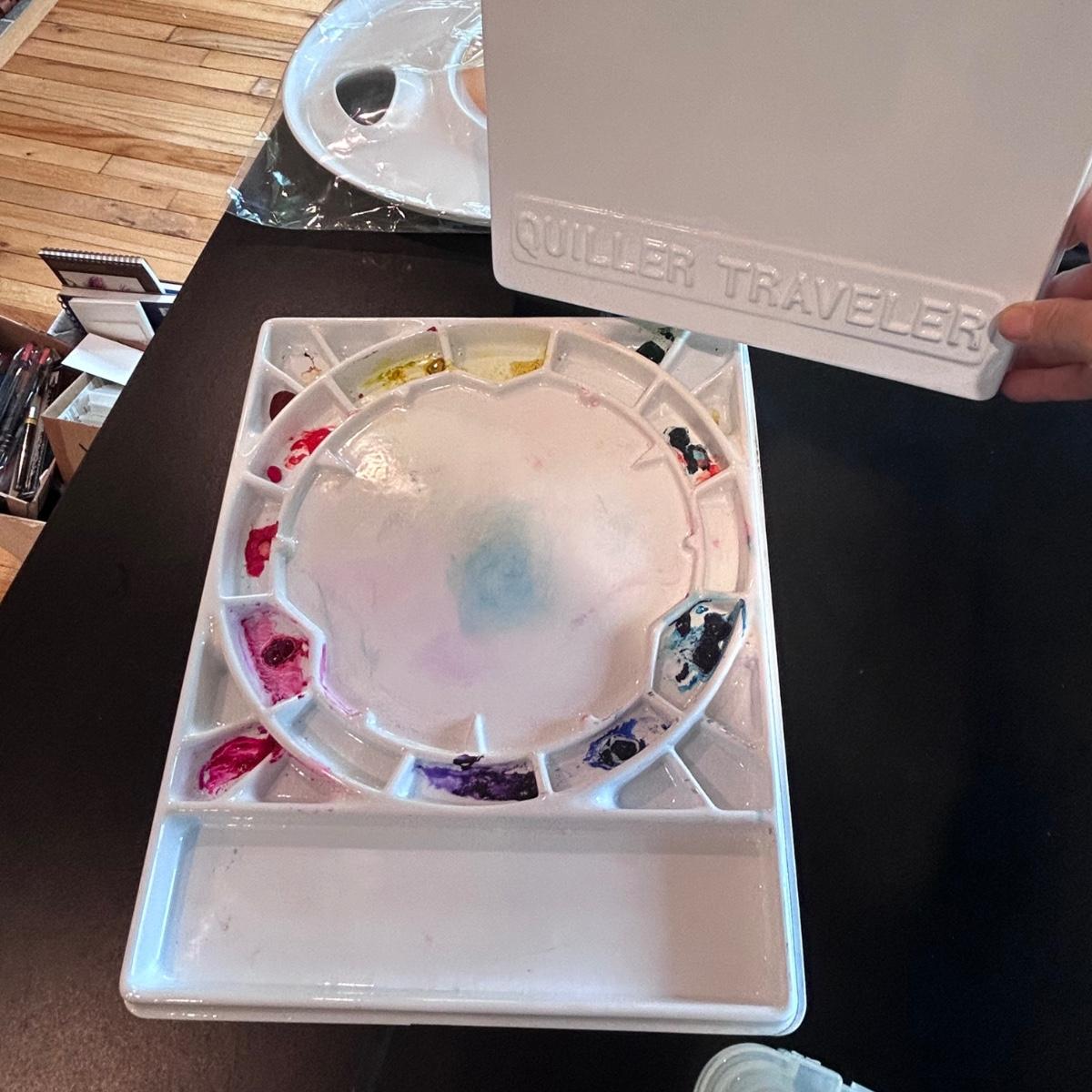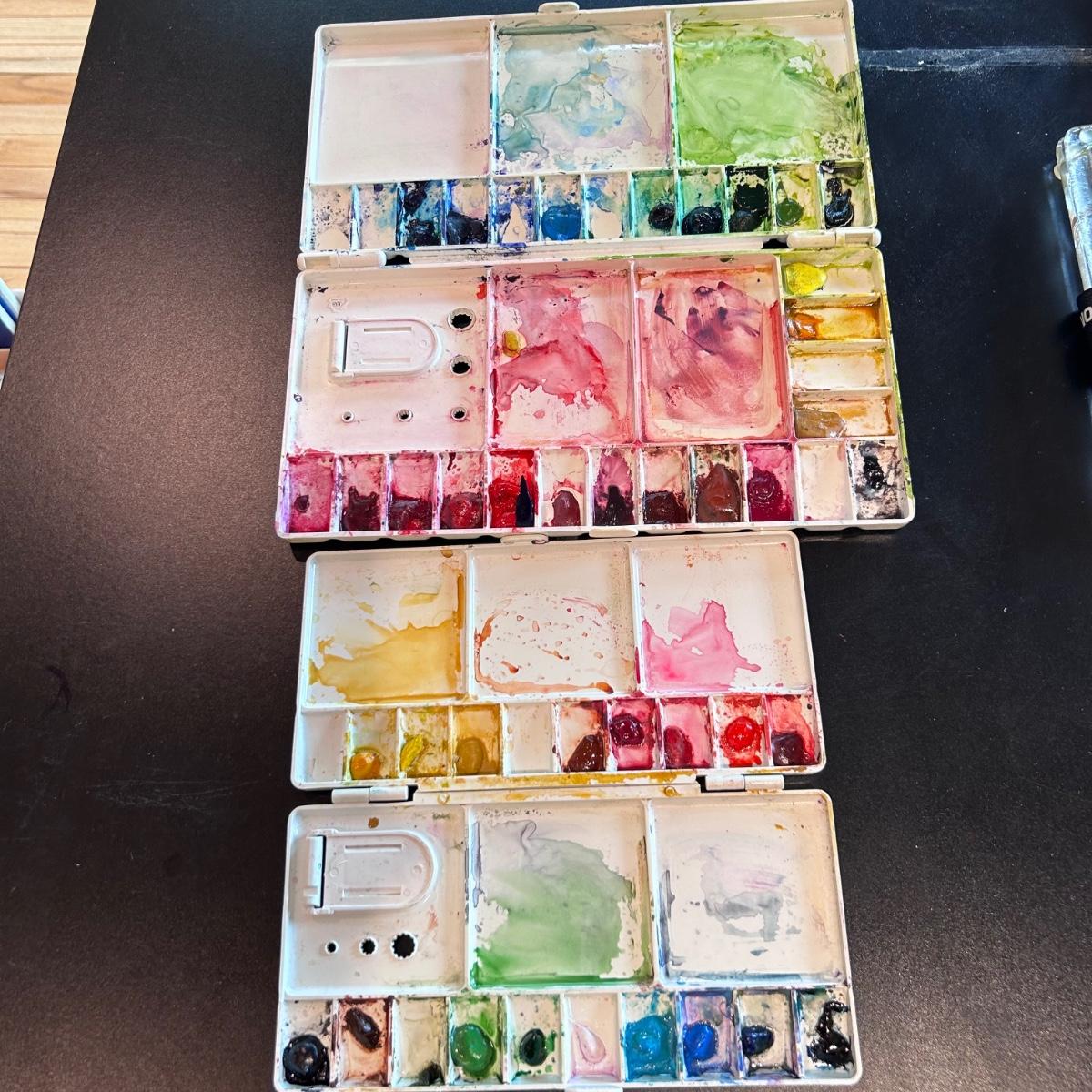 Large collection of palettes and storage for painting with oils and acrylics. Most are plastic but a few ceramic and metal. There are two packs of flexible palette knives still in packages. Most are unused but several are used and still have paint on them. There is a possum Palette with case and an Ellipse XL still in packaging. Shipping available.