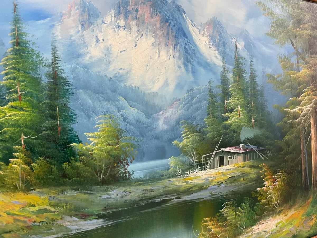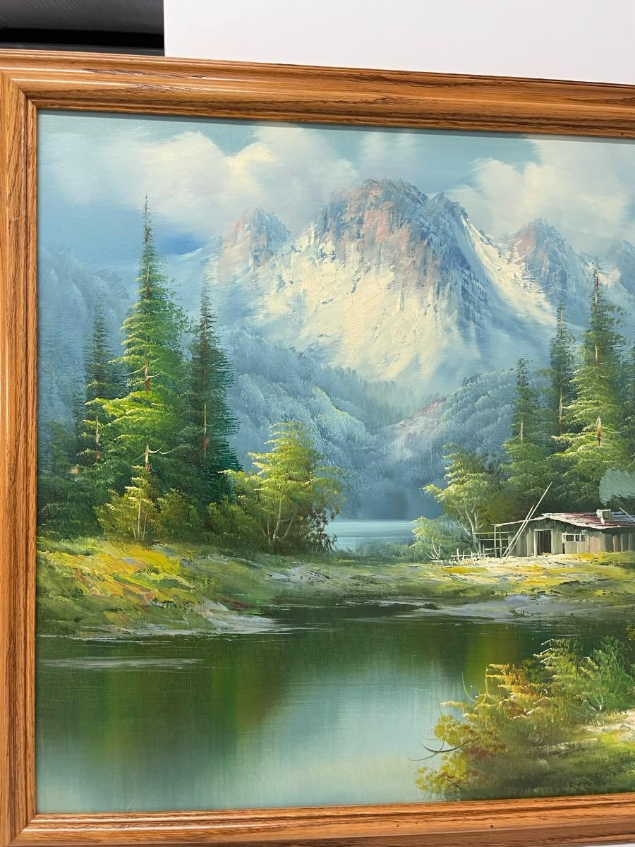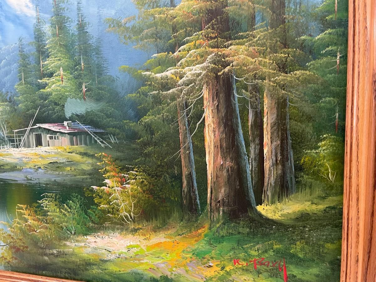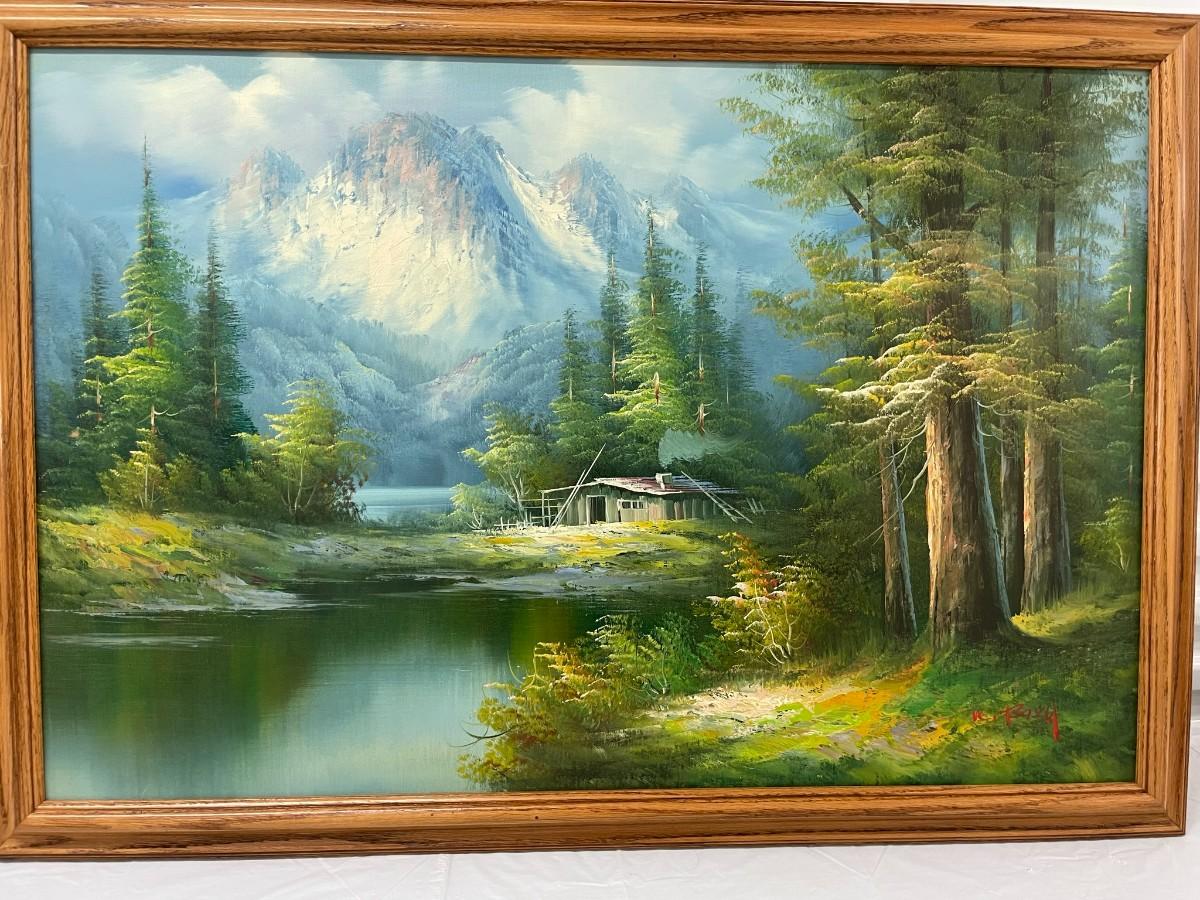 Painting on Canvas (Cabin in the Woods) Signed with Wood Frame 36 X 24