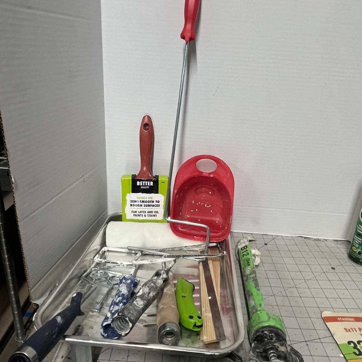 Includes rollers, tray, scraper, spray paint, sandpaper, caulking gun.