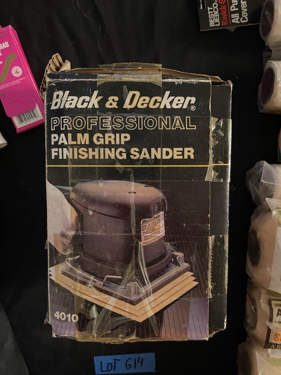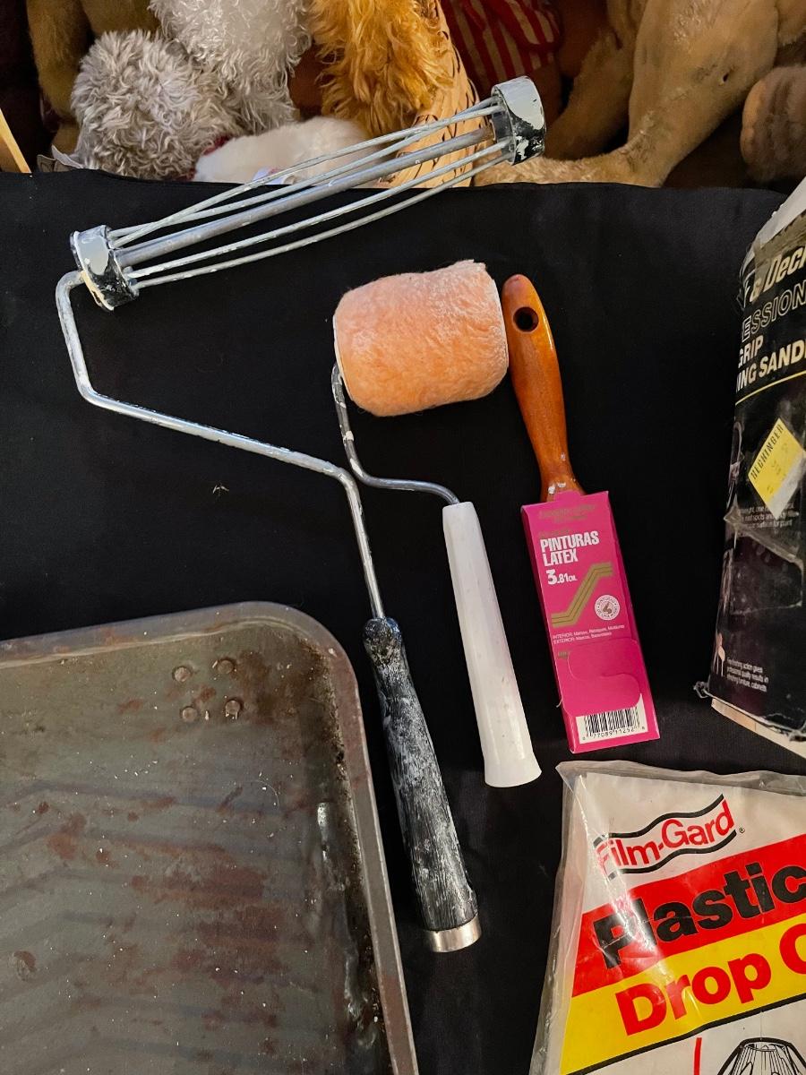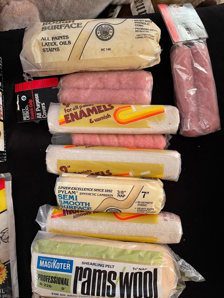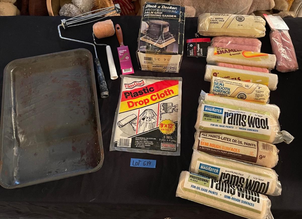 Entire lot of painting materials - (1) tray, (1) brush, (2) rollers, plastic drop cloth, (14) various sized roller replacements, Black & Decker palm grip finishing sander in box.