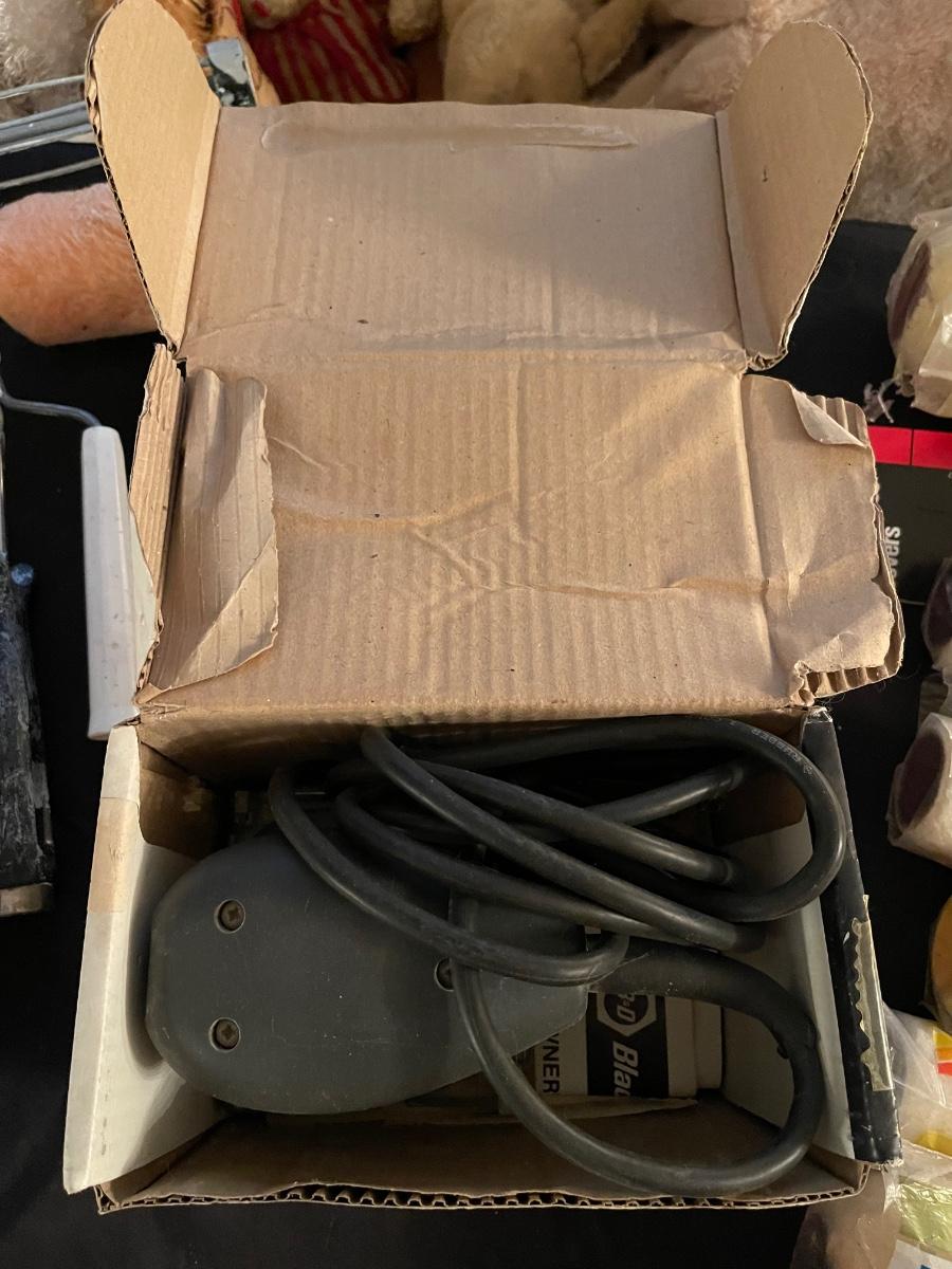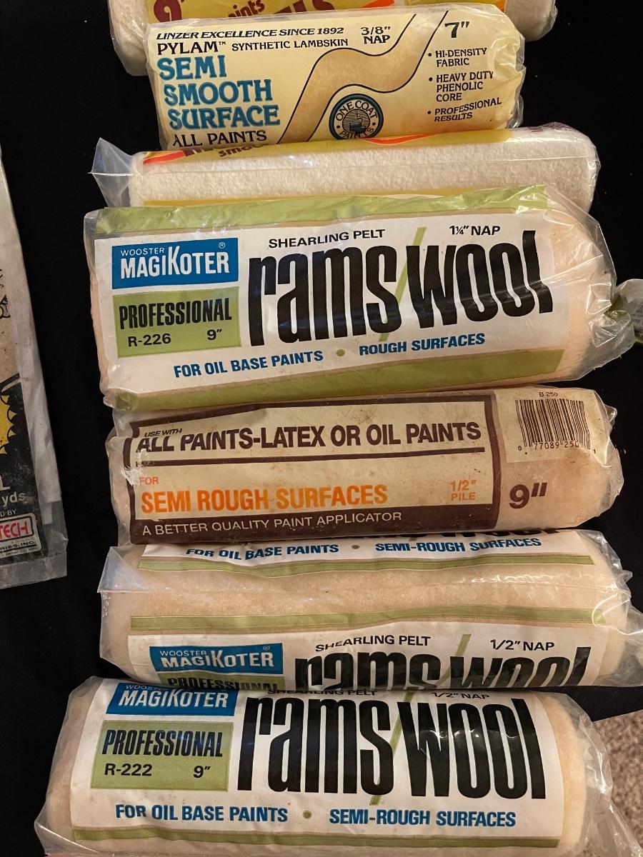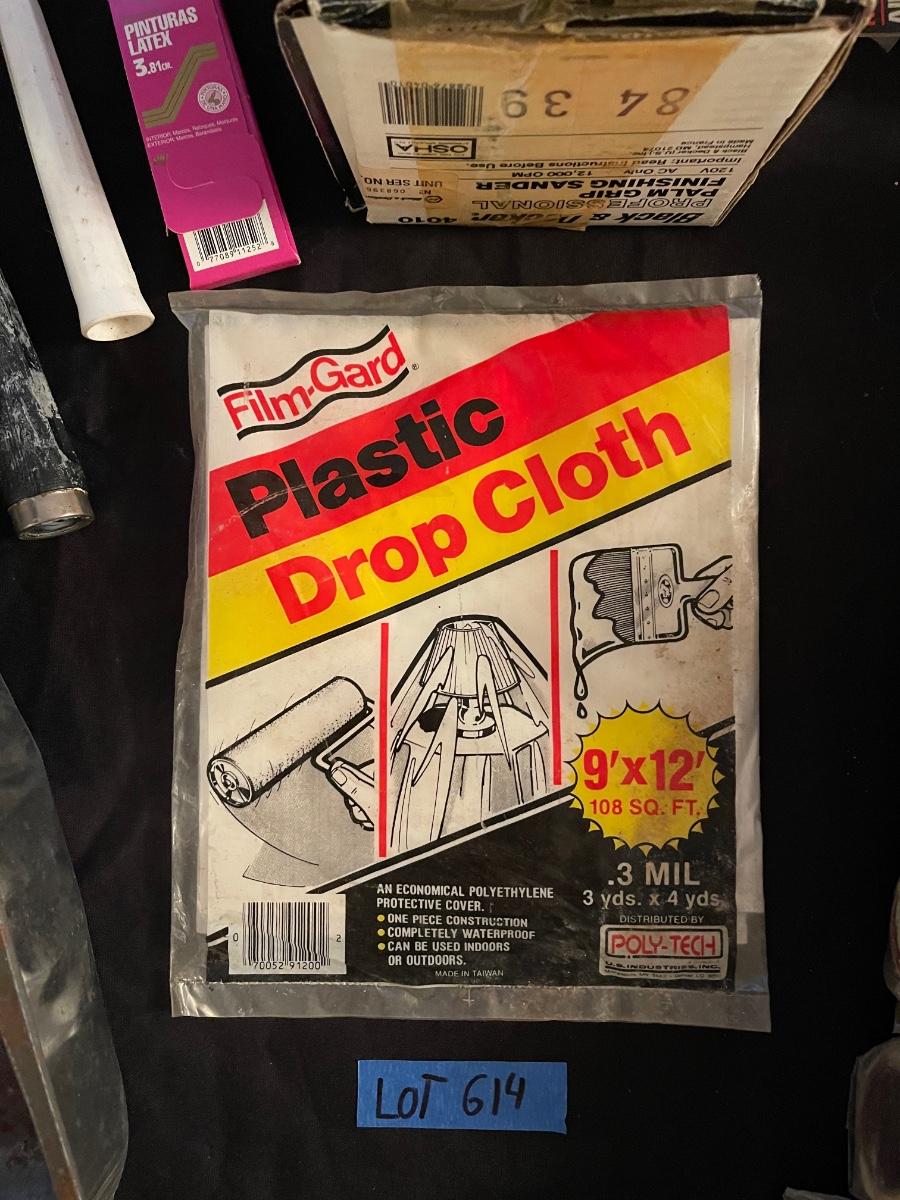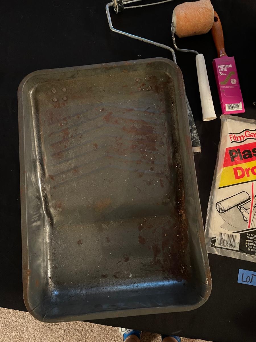 Entire lot of painting materials - (1) tray, (1) brush, (2) rollers, plastic drop cloth, (14) various sized roller replacements, Black & Decker palm grip finishing sander in box.
