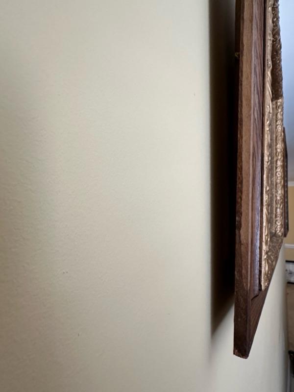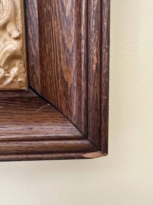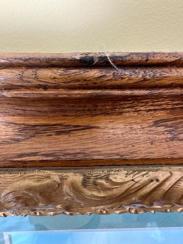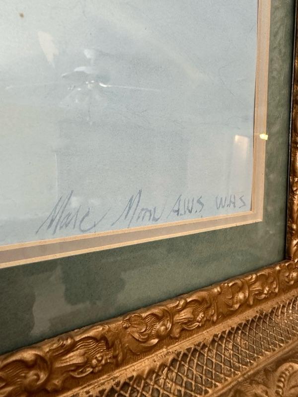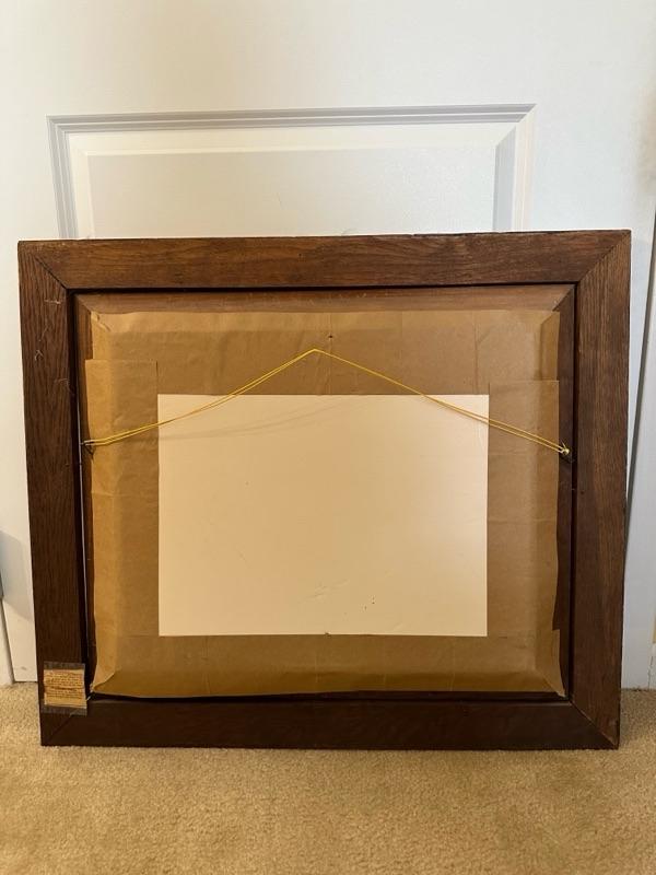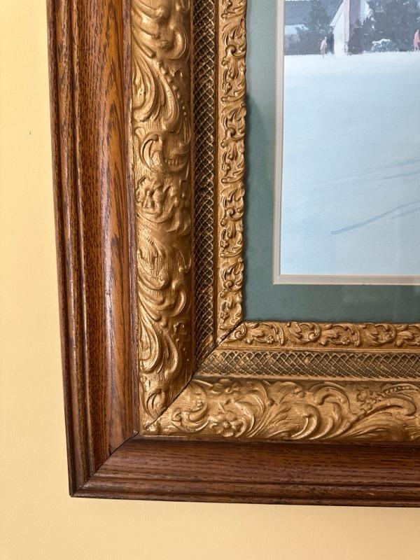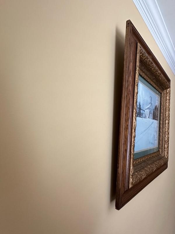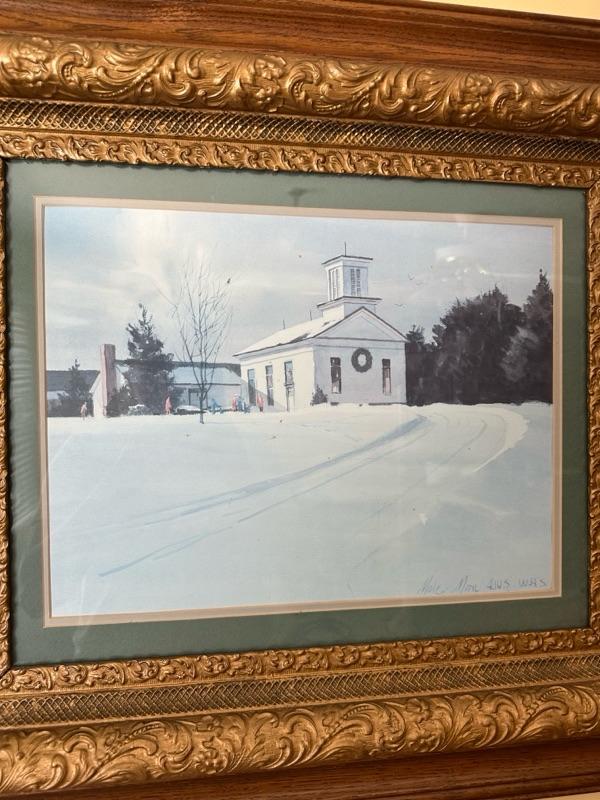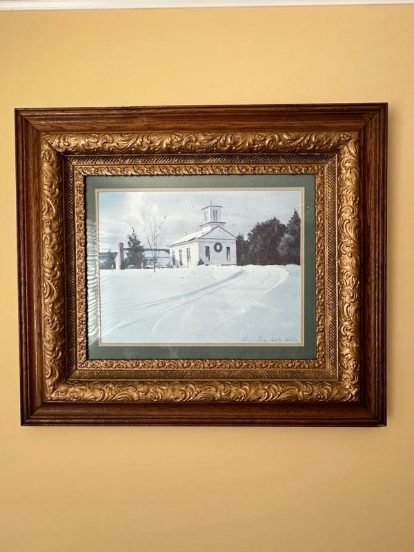 Framed Artwork of a church in Bath, Ohio. A note from the family with additional history - "This is a painting of Bath United Church of Christ in Bath Ohio. My Mom's family was part of the founding members of the church which moved from downtown Bath Ohio traveling down Cleveland Massillon Road to its current resting place. The white sanctuary and steeple was the original church structure. The church still stands today."
