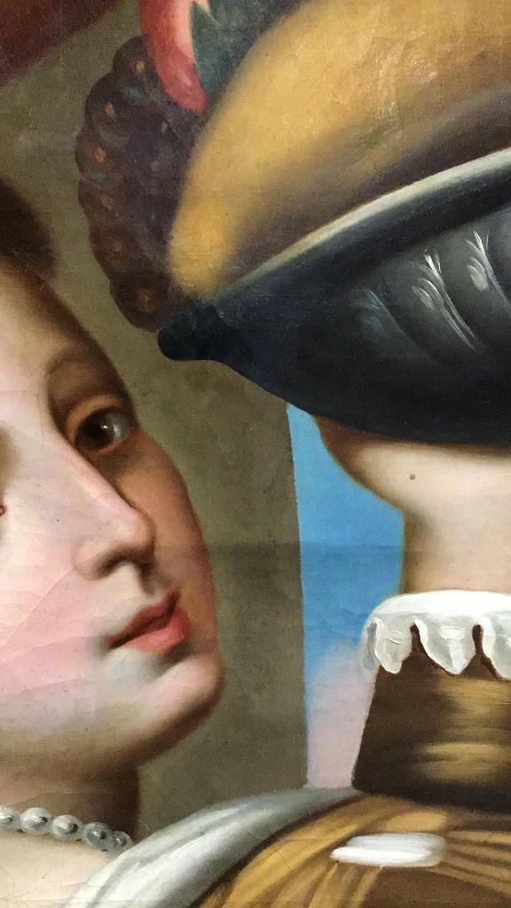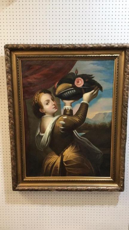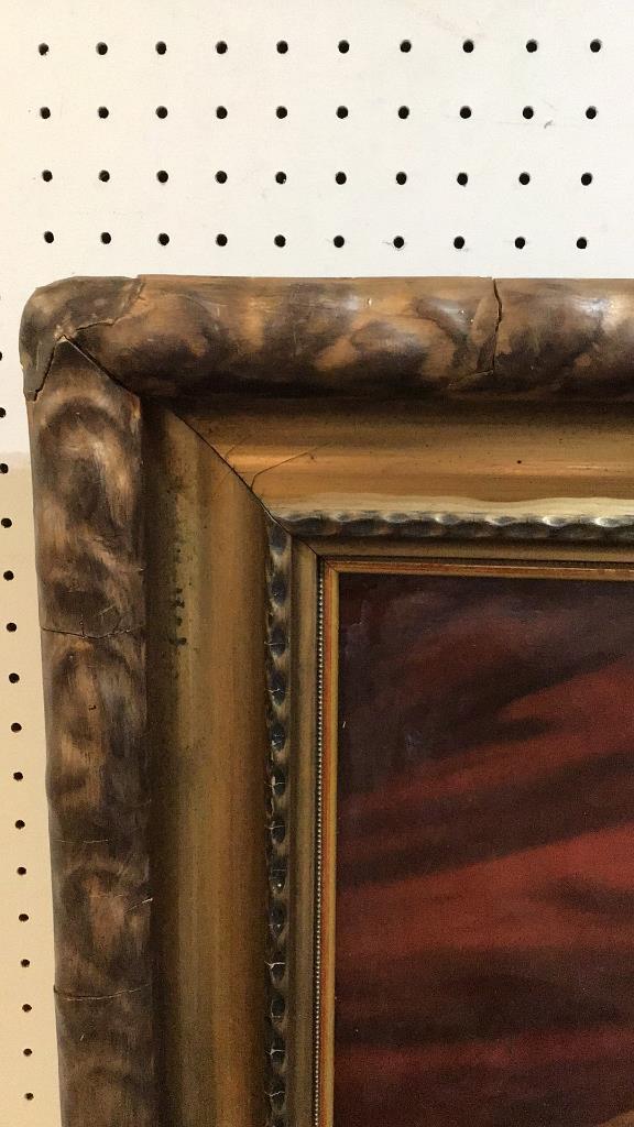 Oil on canvas, unsigned, cracks and creases to canvas, gold tone gesso frame, 38 x 28 sight mount