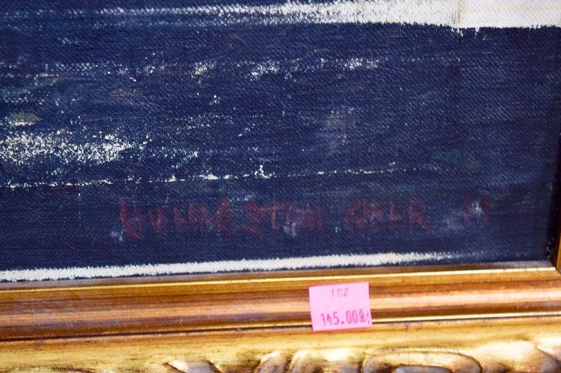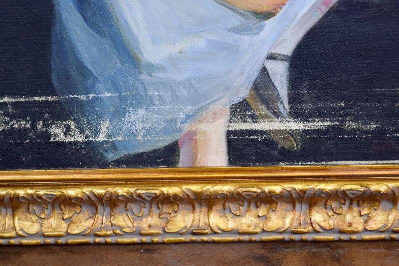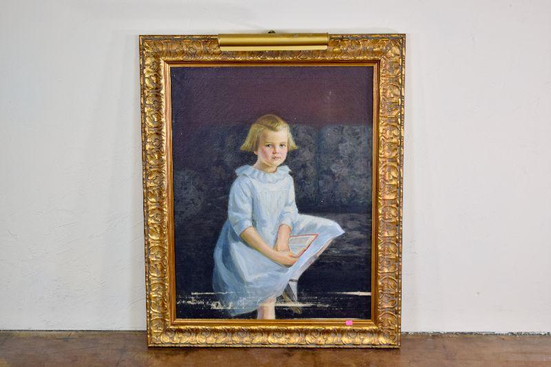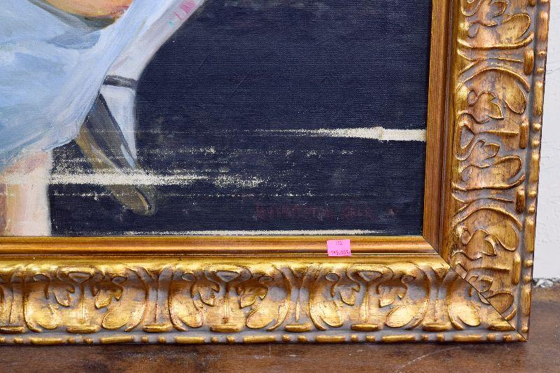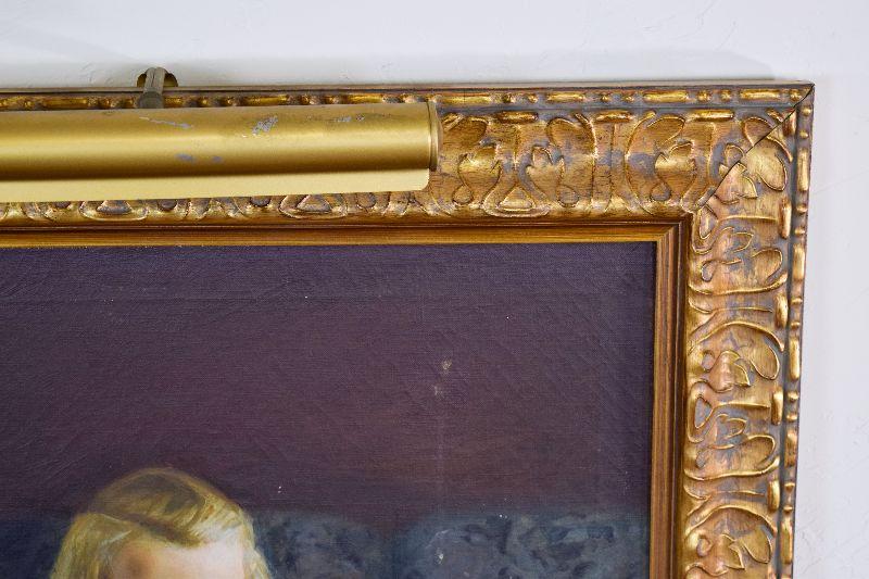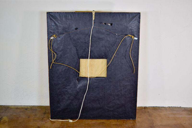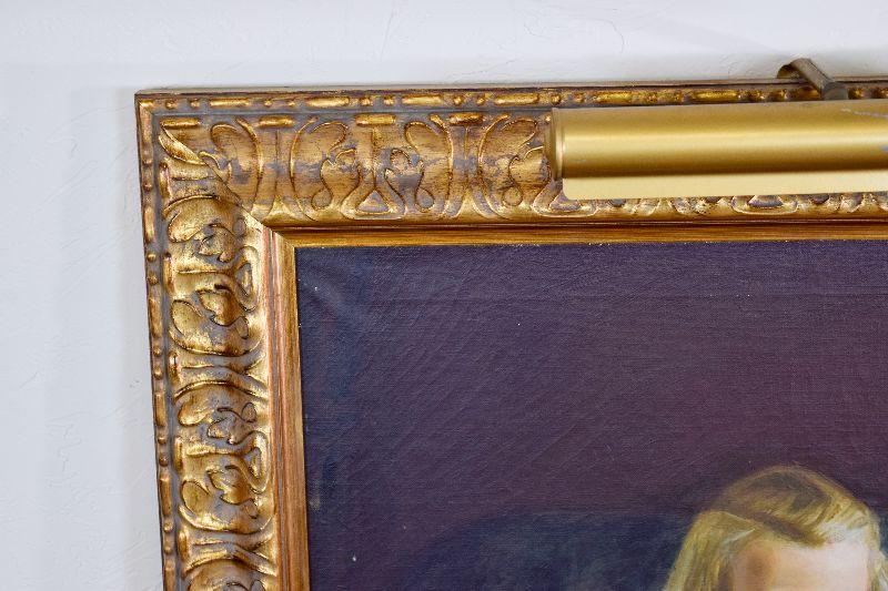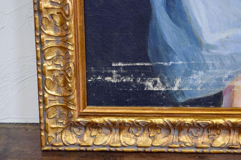 The painting is in need of restoration, with bad wear on the bottom half of the piece. There are also smaller spots of wear spread across the painting. The item measures approximately 36" wide X 44" tall including the framing.