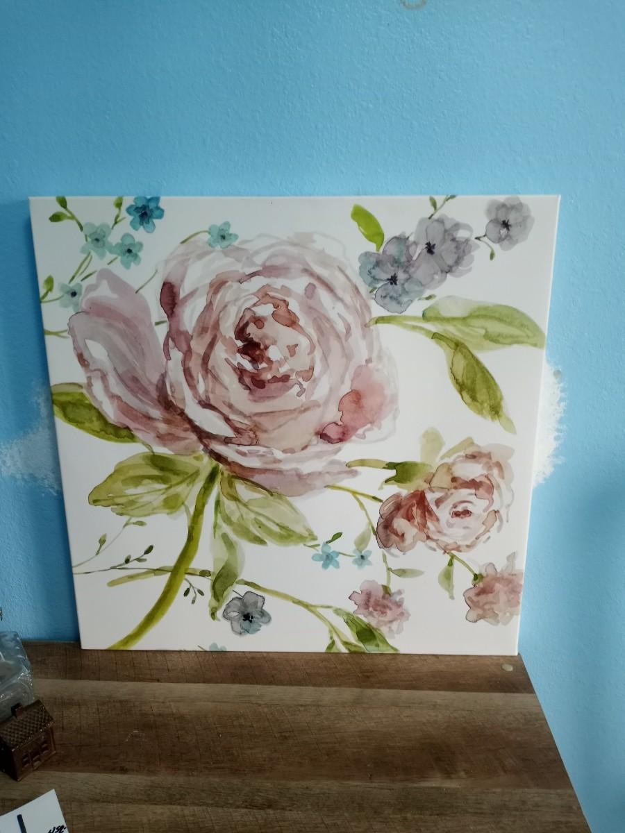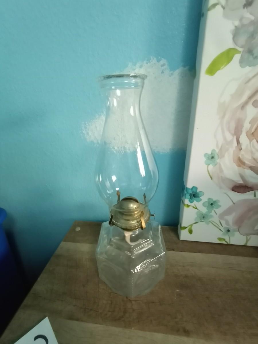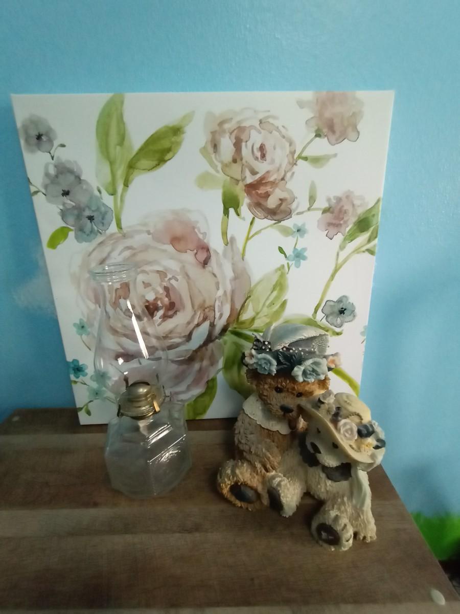 PAINTING ON CANVAS-HURRICANE OIL LAMP AND CERAMIC BEAR FIGURINE