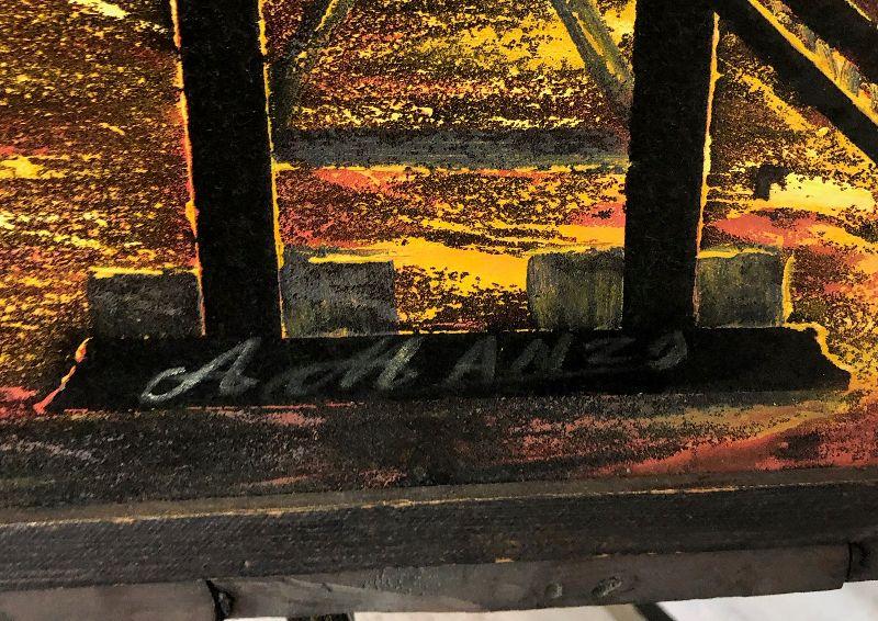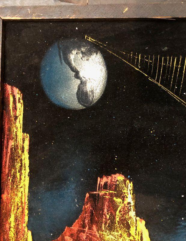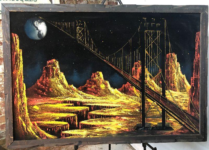 Here is a surreal piece of artwork entitled "Bridge To Mars"...Signed by the artist..Painting on velvet..39 x 26"....In wooden frame...