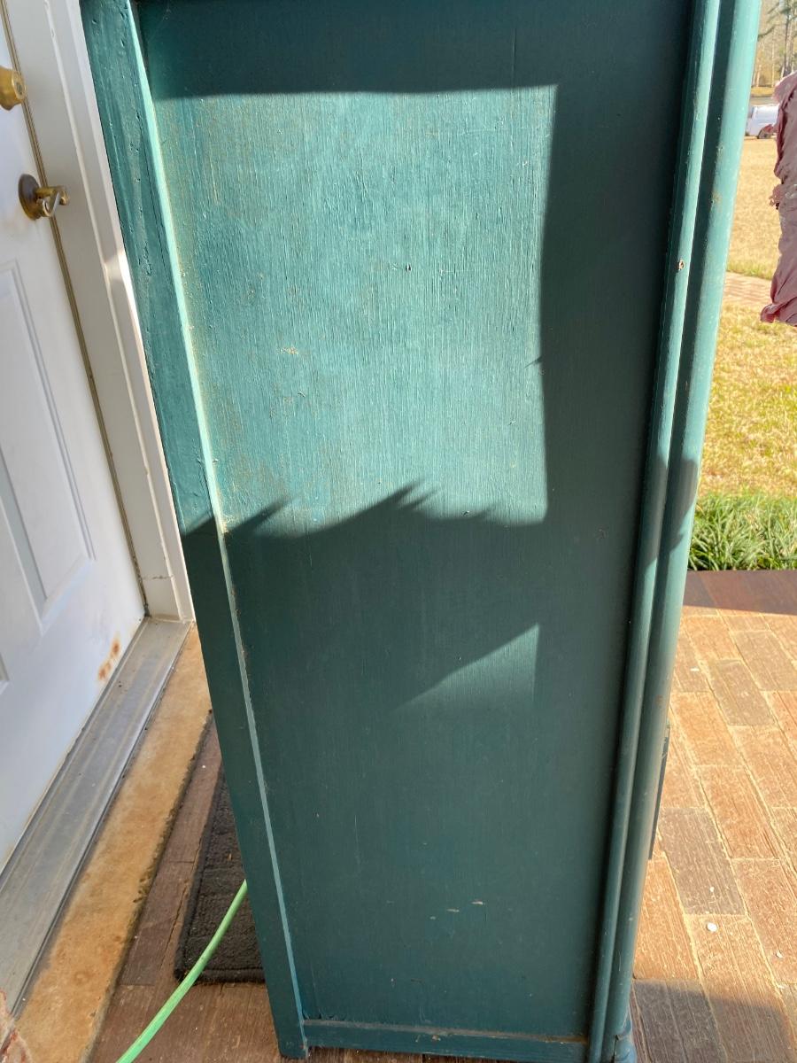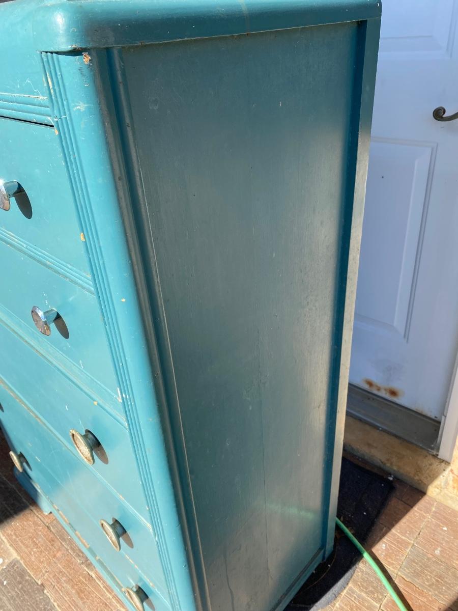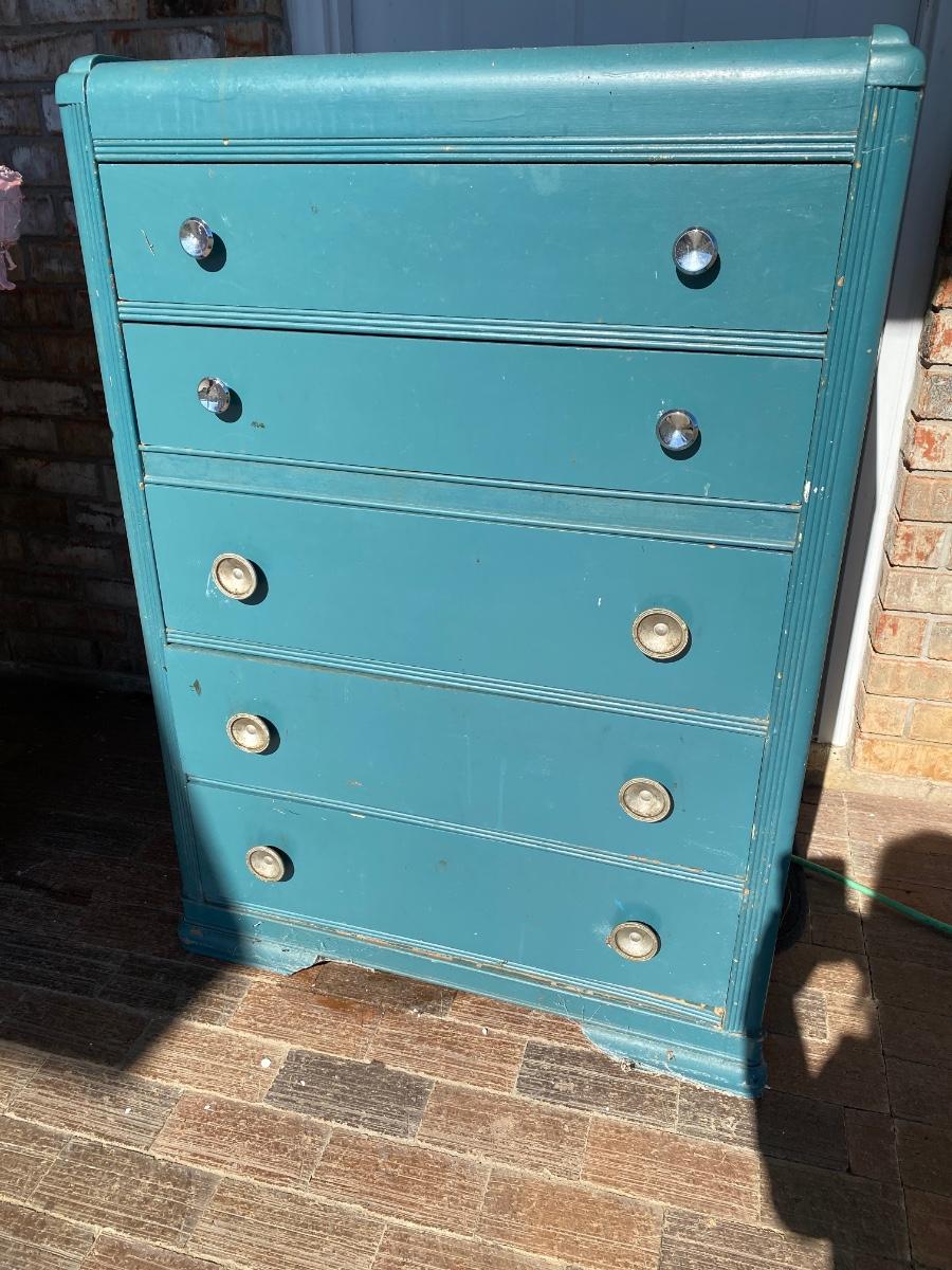Painting project piece - Vintage all wood Waterfall style chest of five drawers. Painted turquoise. All the drawers work; needs to be repainted, otherwise in good vintage condition. Approx 41h x 31-1/2w x 16d