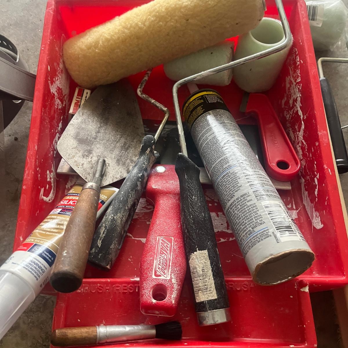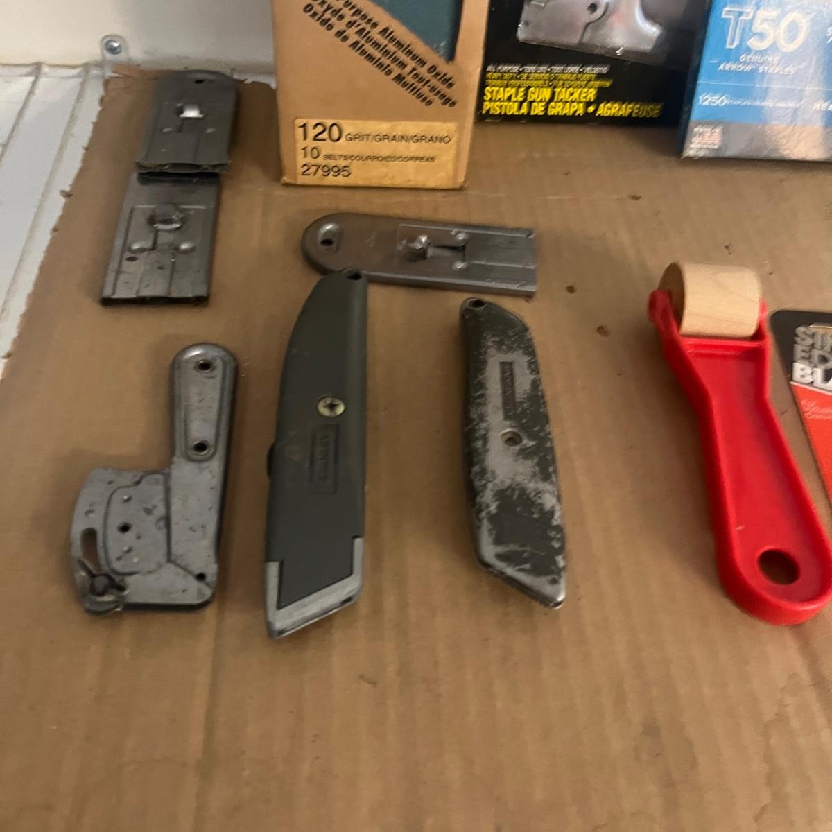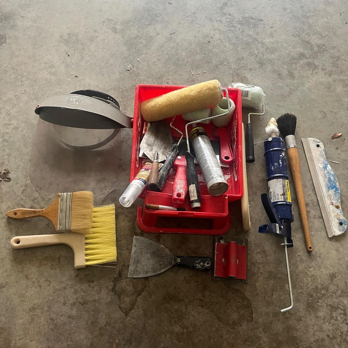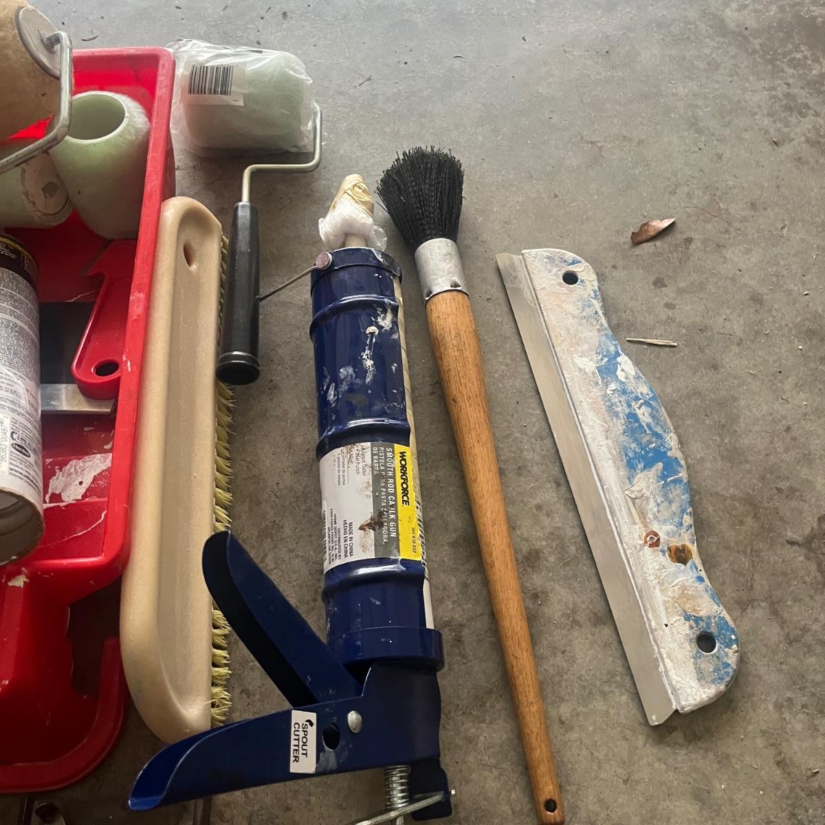 Lot includes paint rollers and tray, wallpaper brushes, razor knives, sandpaper, measuring tape, wire brushes, stapler, caulking gun and more.