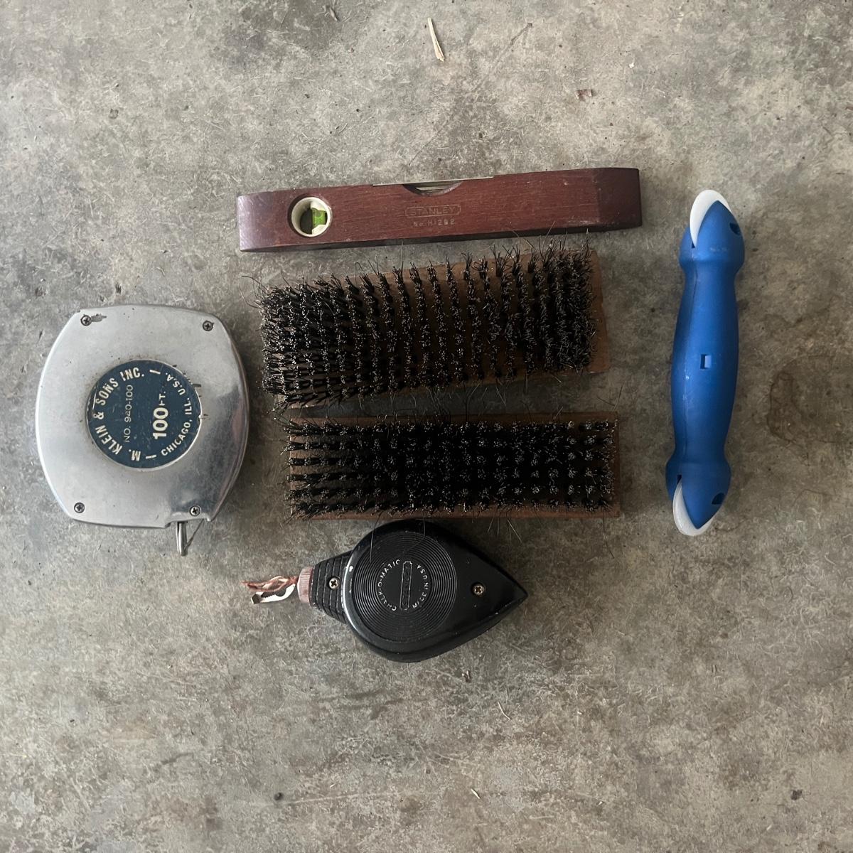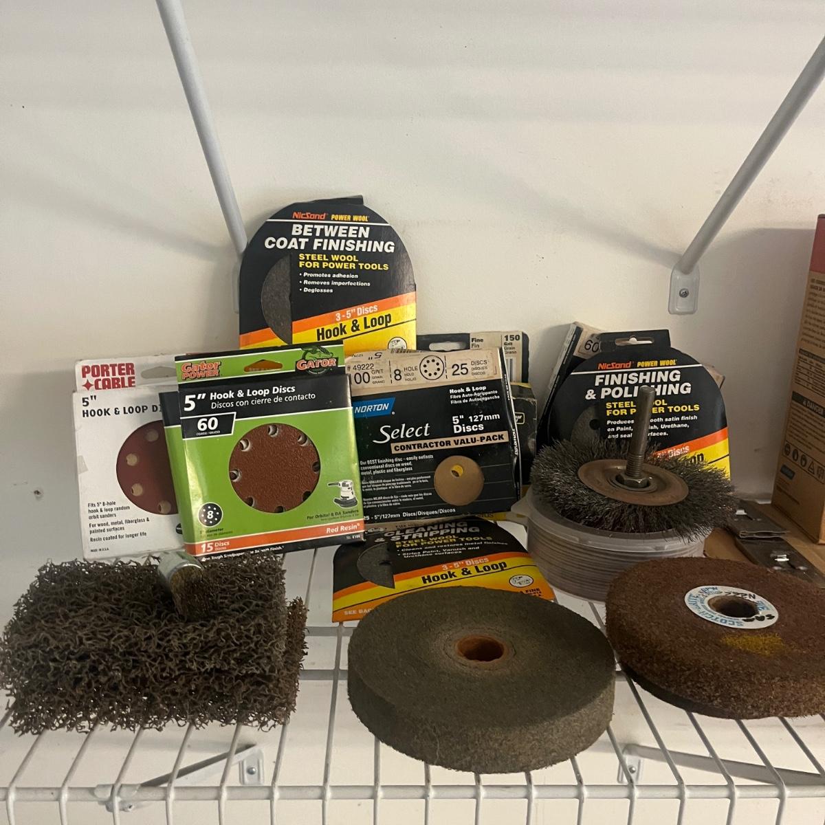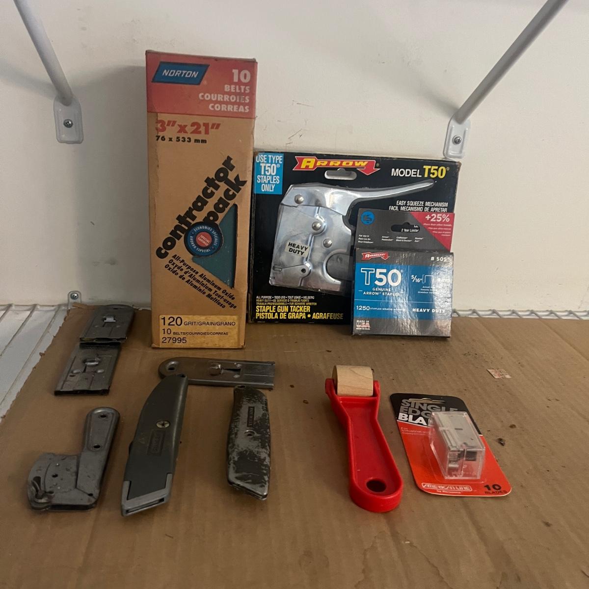 Lot includes paint rollers and tray, wallpaper brushes, razor knives, sandpaper, measuring tape, wire brushes, stapler, caulking gun and more.