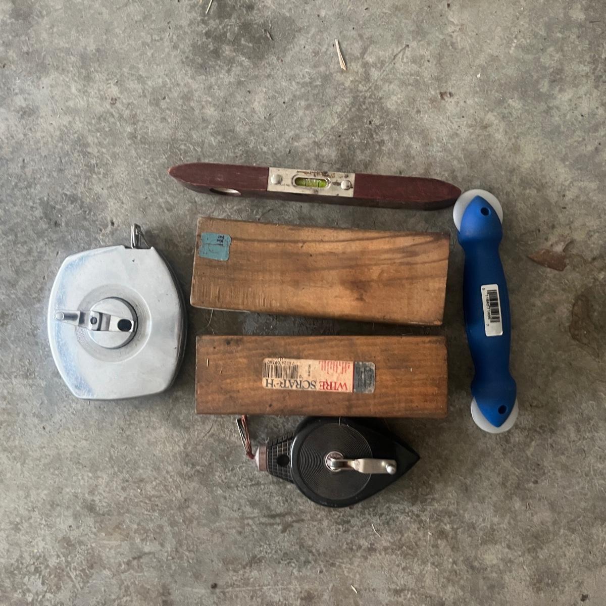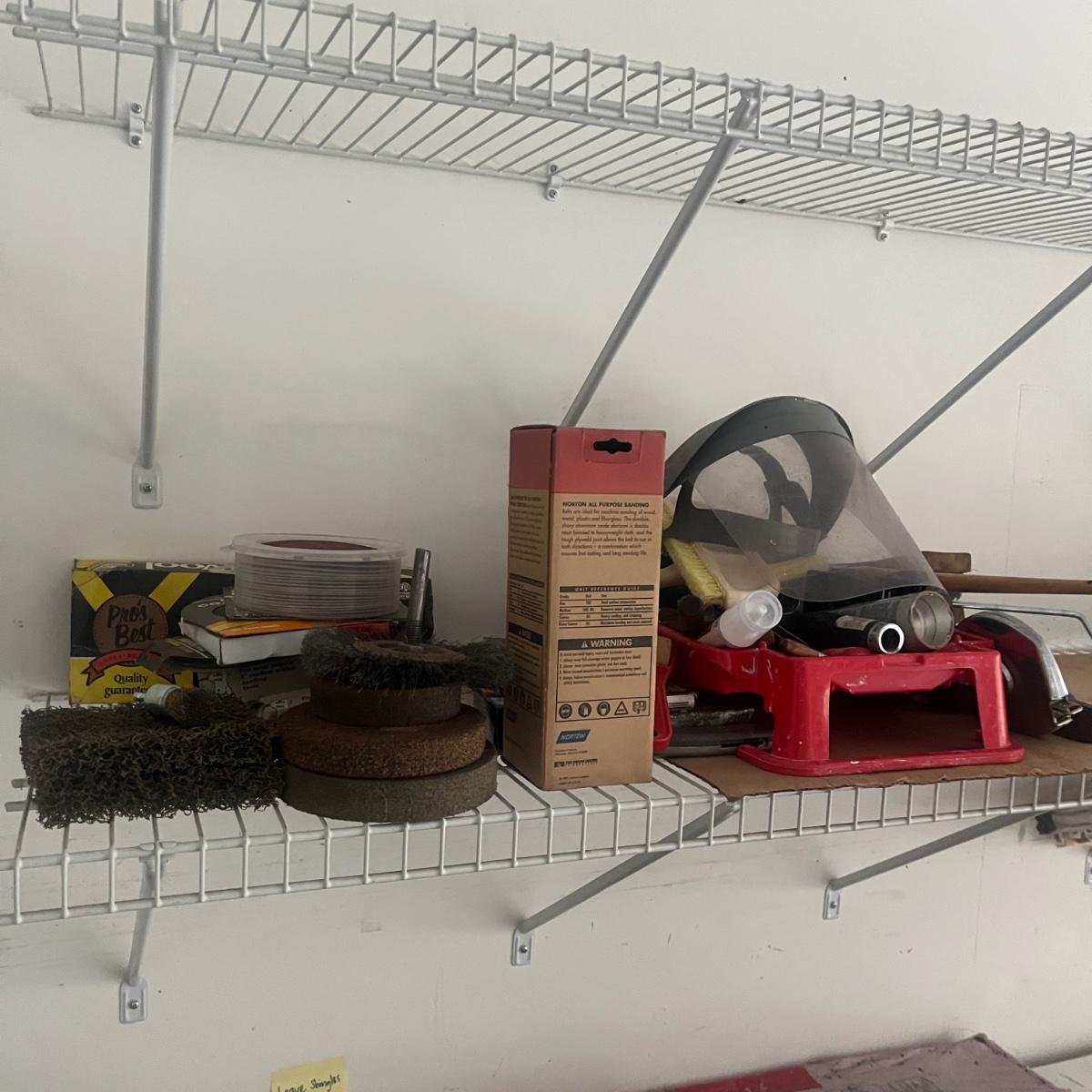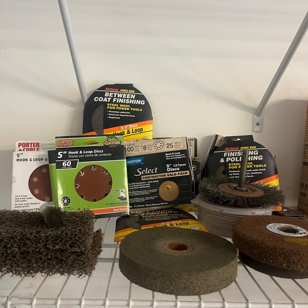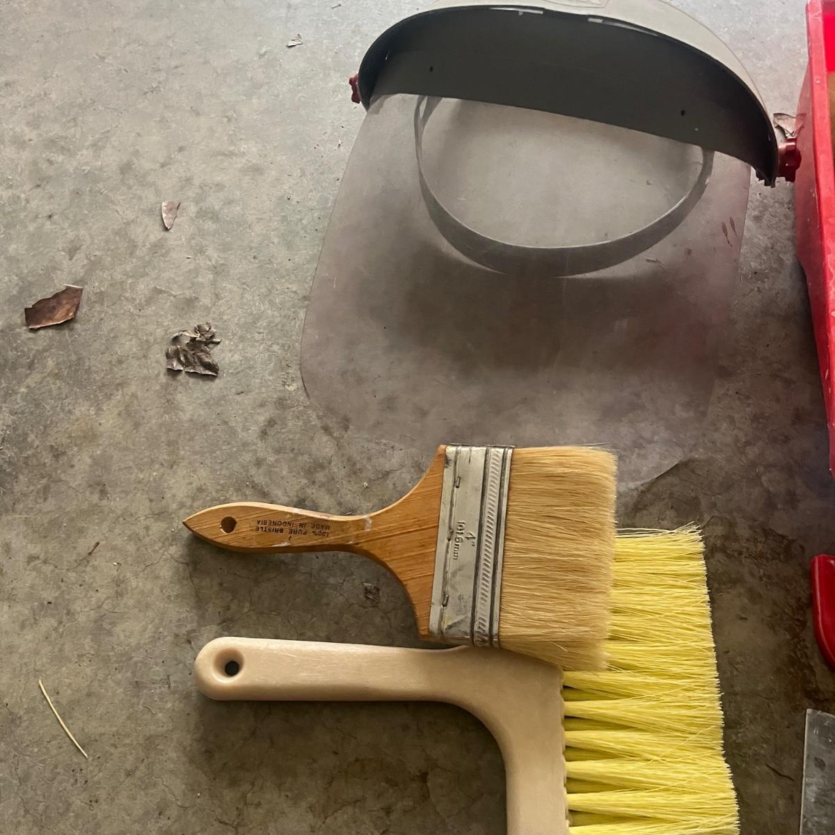 Lot includes paint rollers and tray, wallpaper brushes, razor knives, sandpaper, measuring tape, wire brushes, stapler, caulking gun and more.