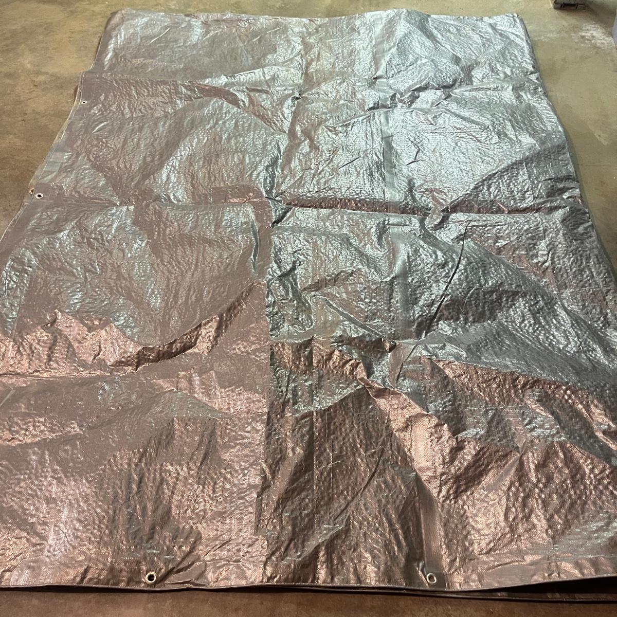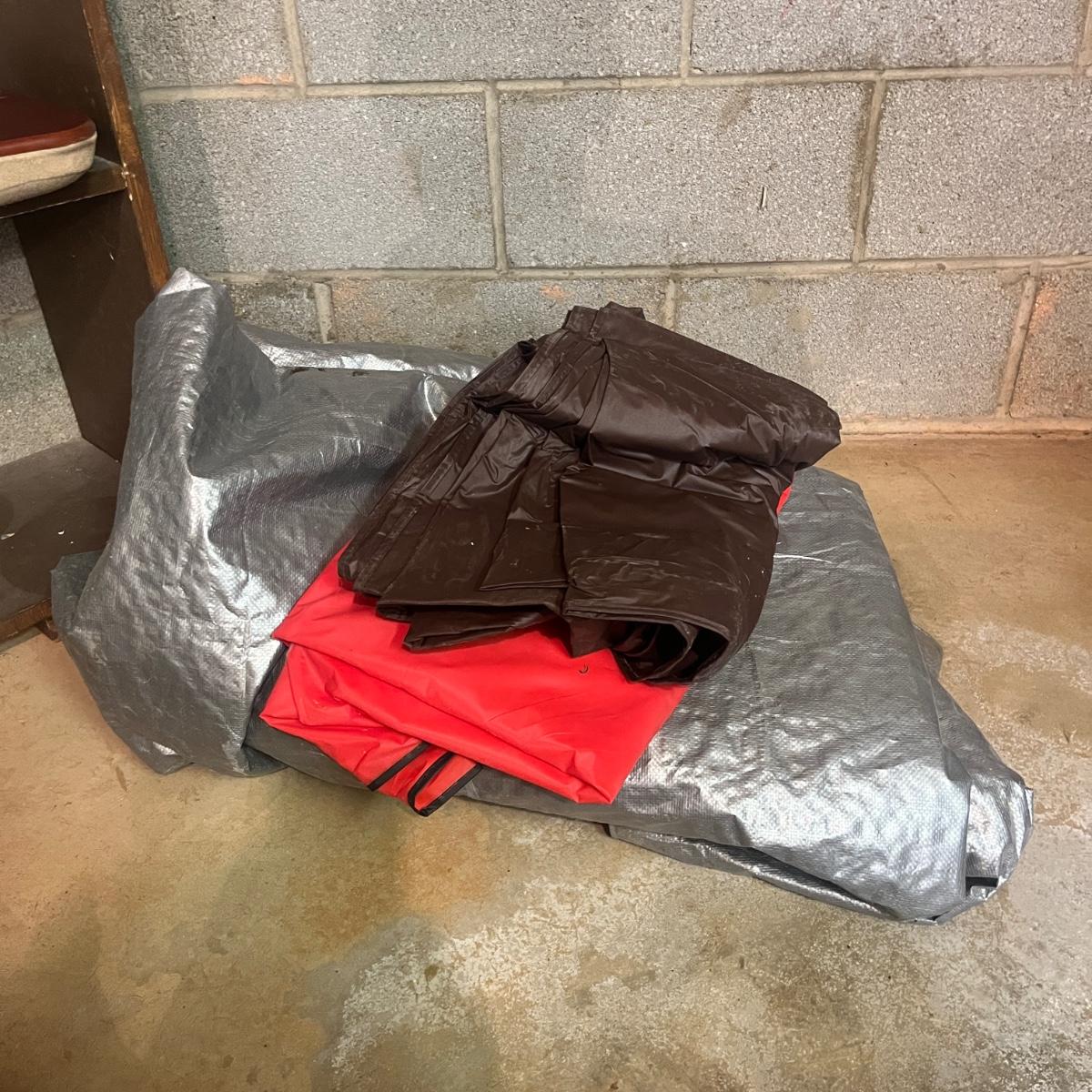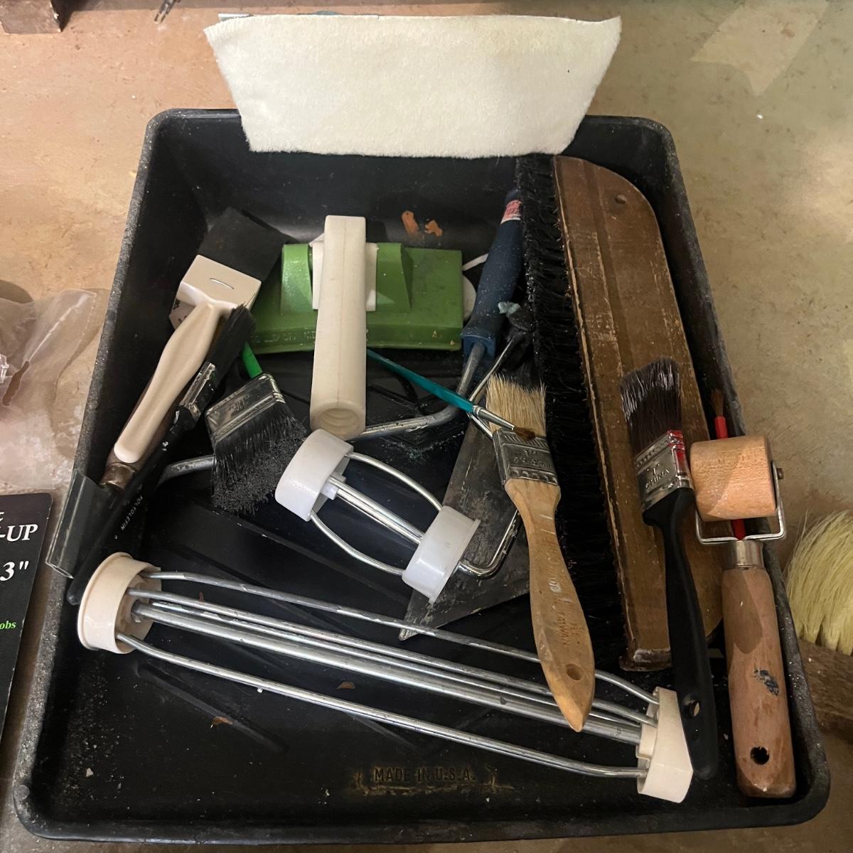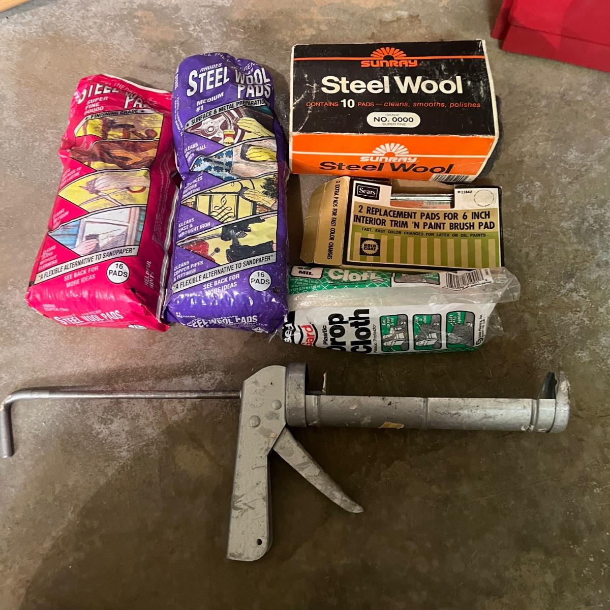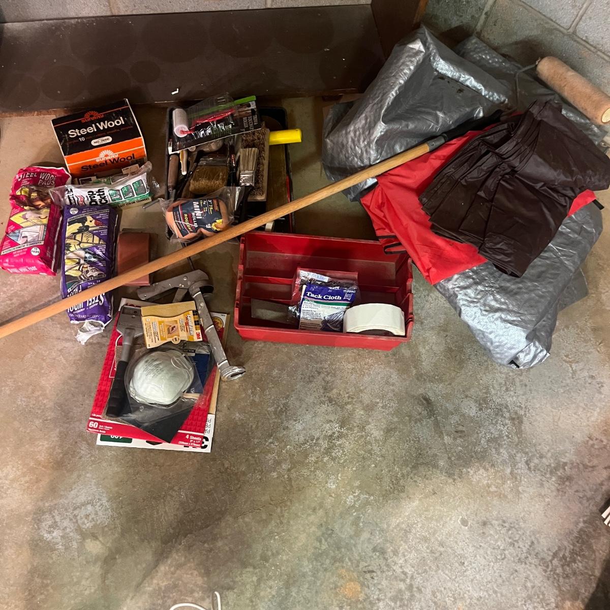 Lot includes tarps, paint brushes, rollers and pads, steel wool, plastic roller tray, caulking gun, sandpaper and more. Largest tarp measures 142” x 188”.