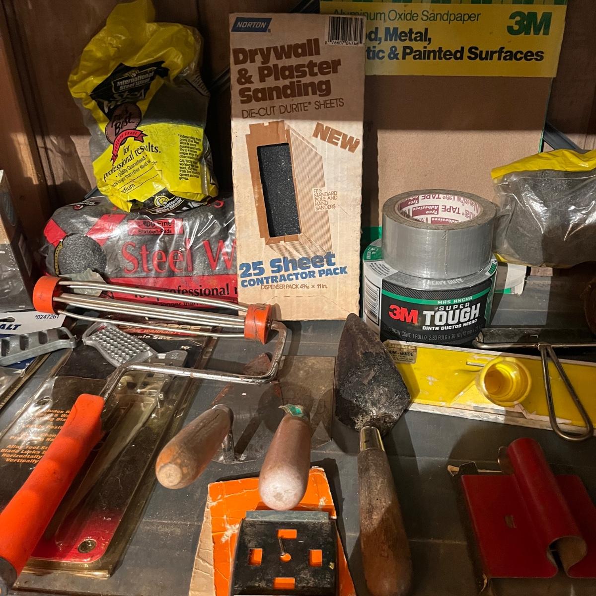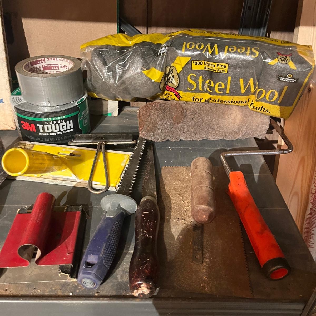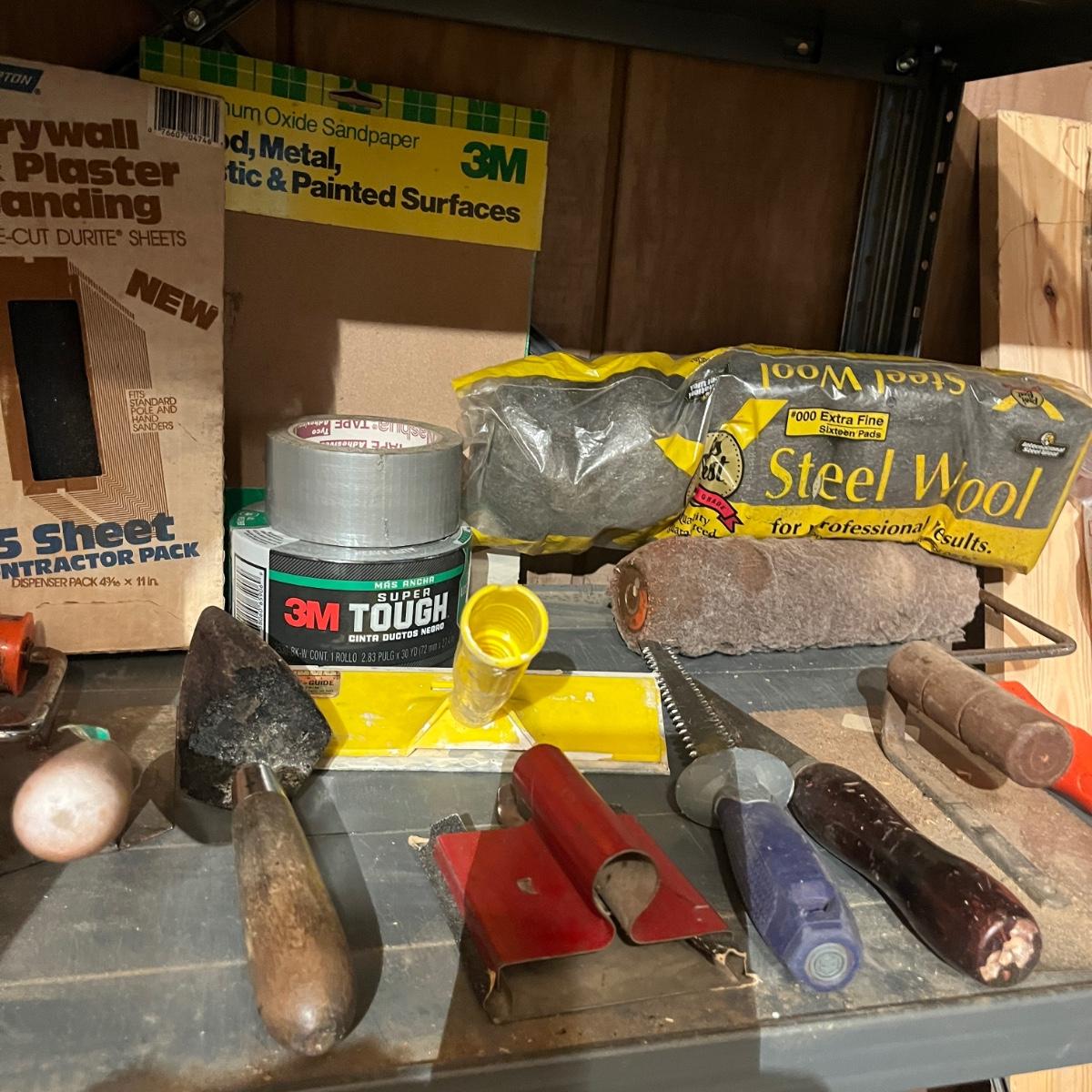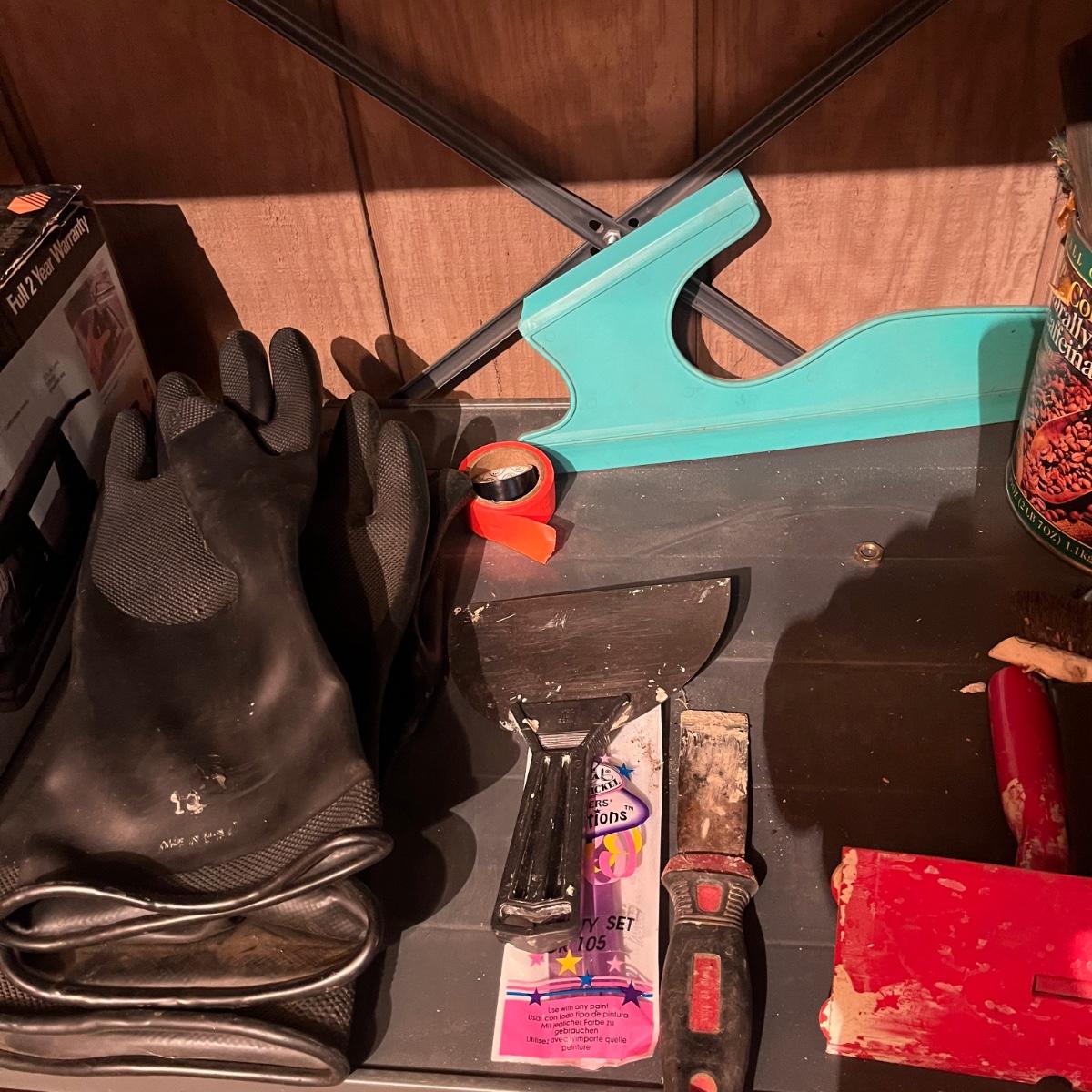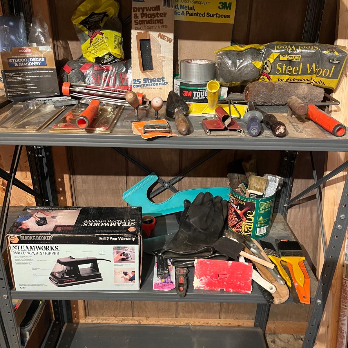 Lot includes drywall saws, Black & Decker wallpaper stripper, paintbrushes and rollers, two pairs of heavy duty rubber gloves, steel wool, plastic and more. Also includes heat gun that powered on when plugged in.