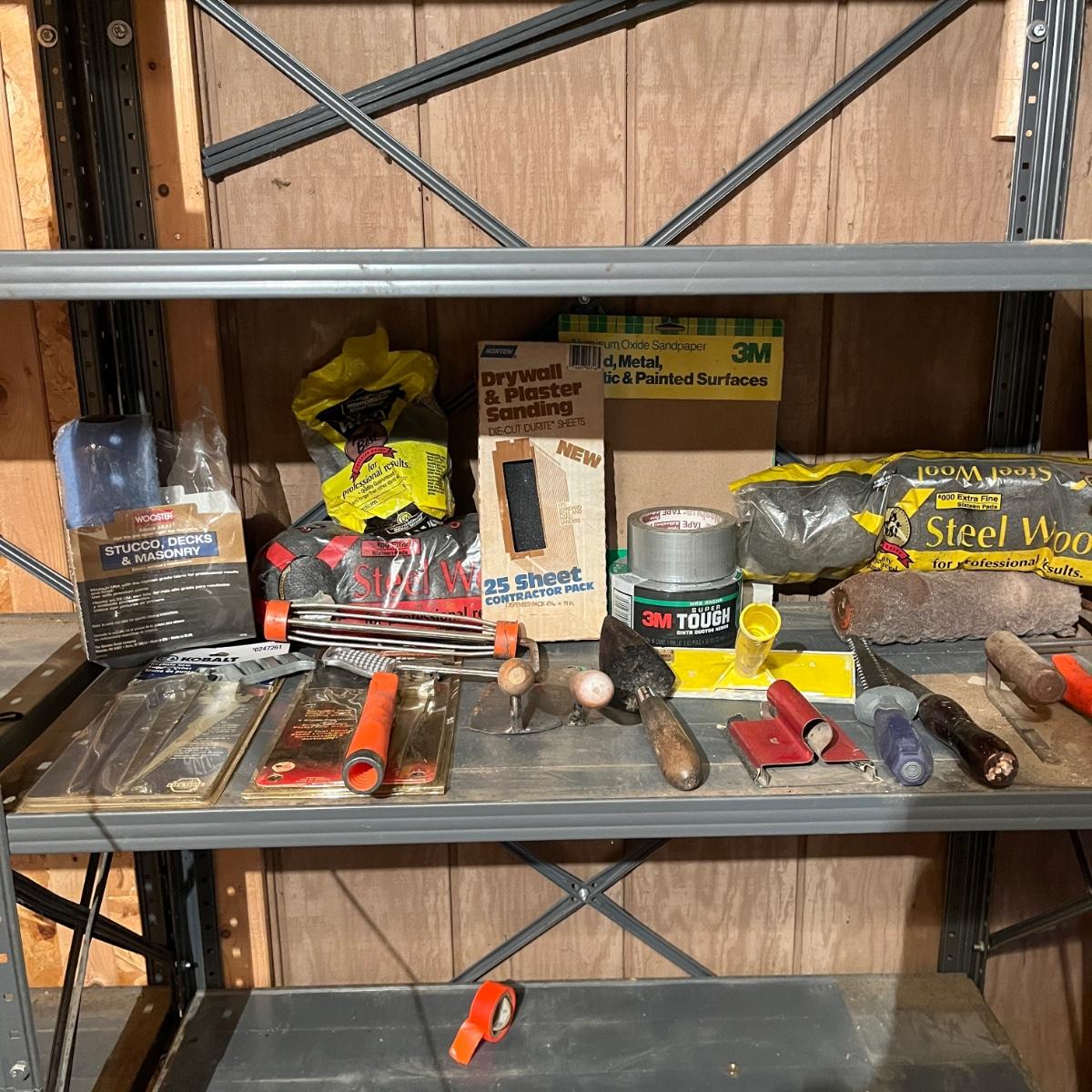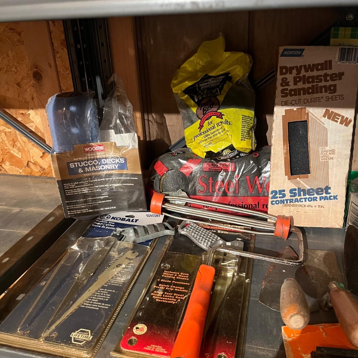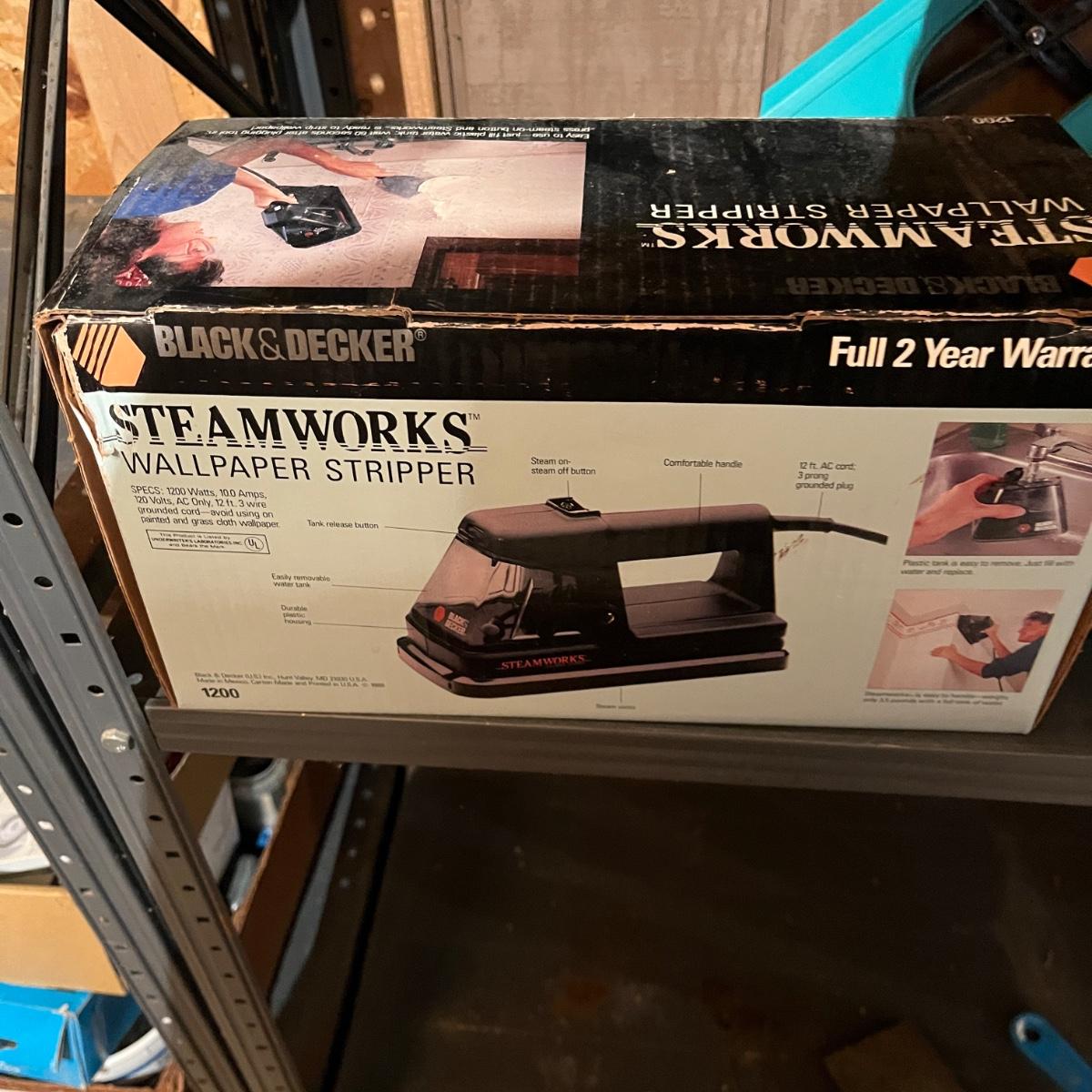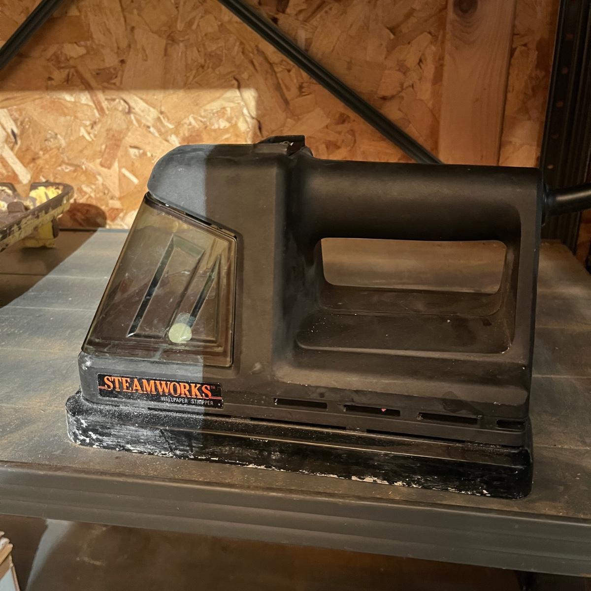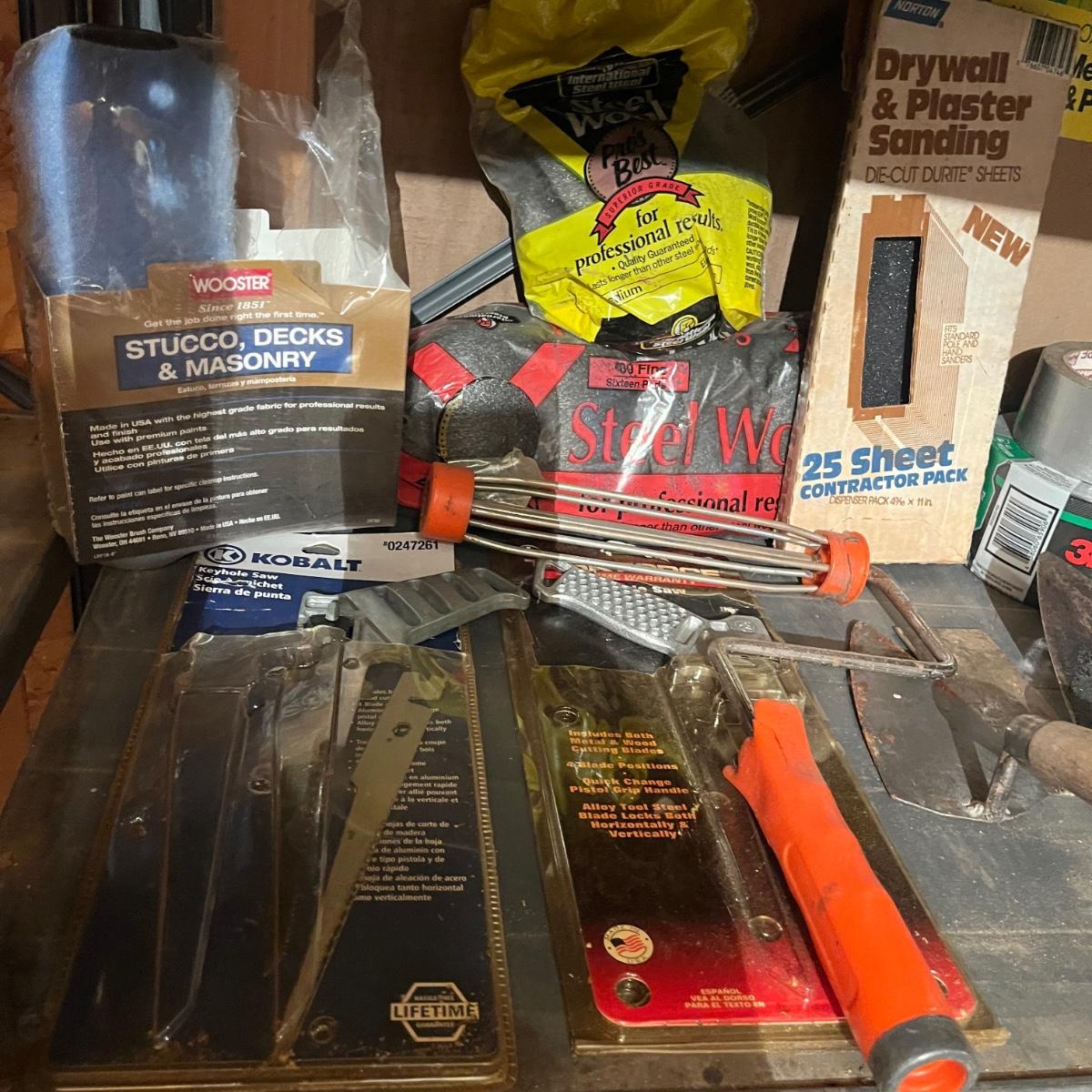 Lot includes drywall saws, Black & Decker wallpaper stripper, paintbrushes and rollers, two pairs of heavy duty rubber gloves, steel wool, plastic and more. Also includes heat gun that powered on when plugged in.