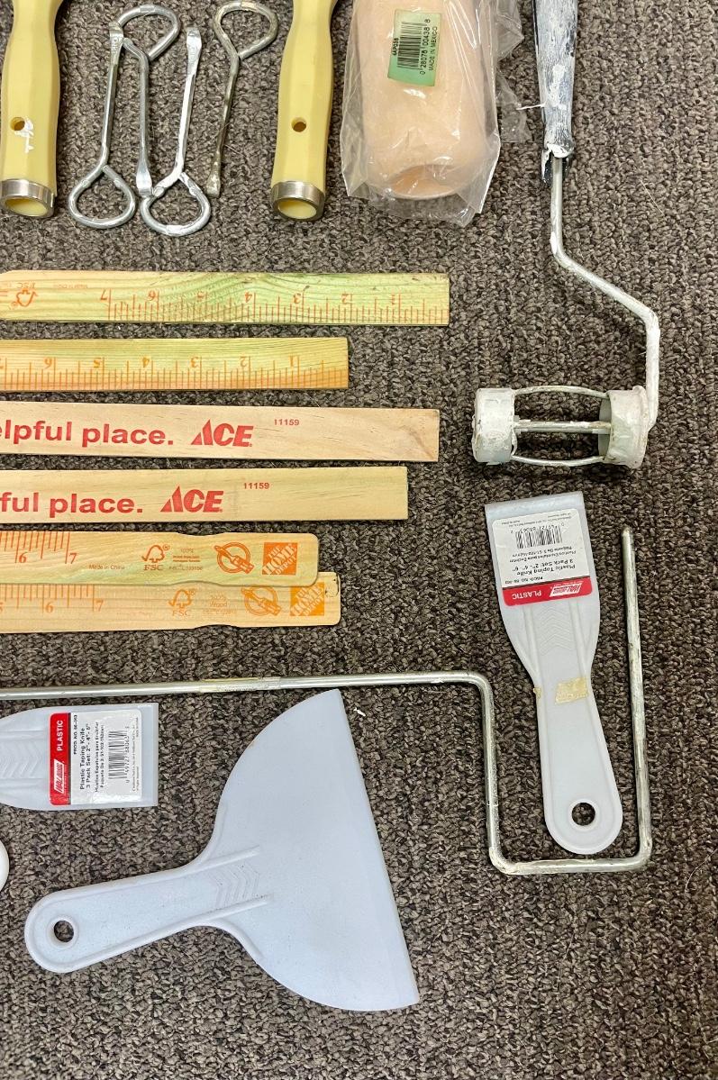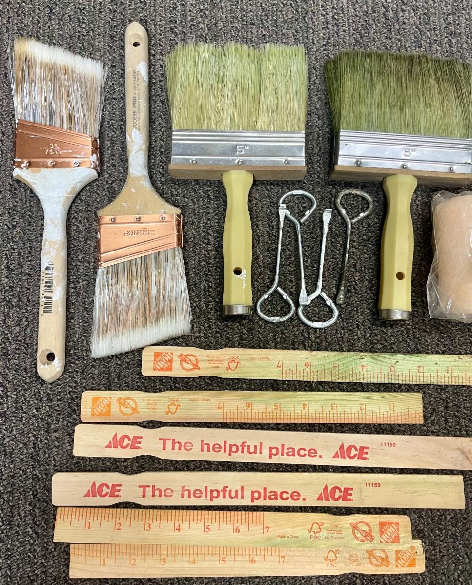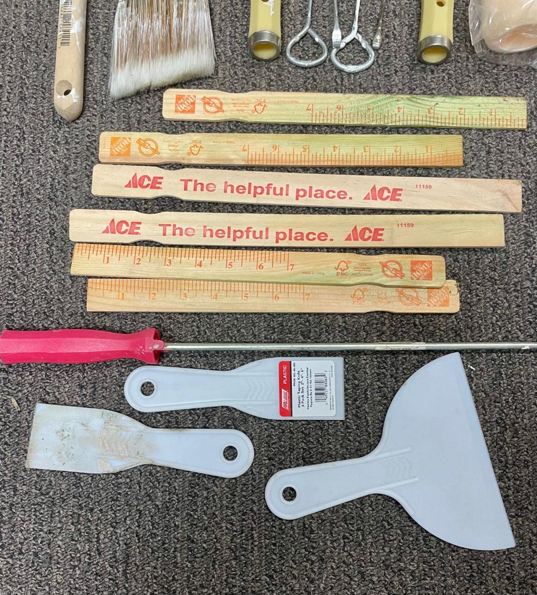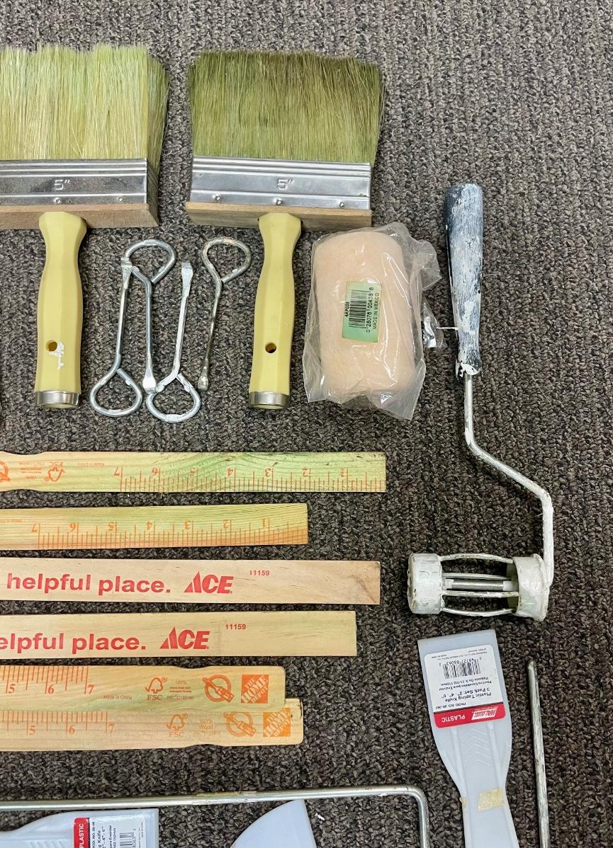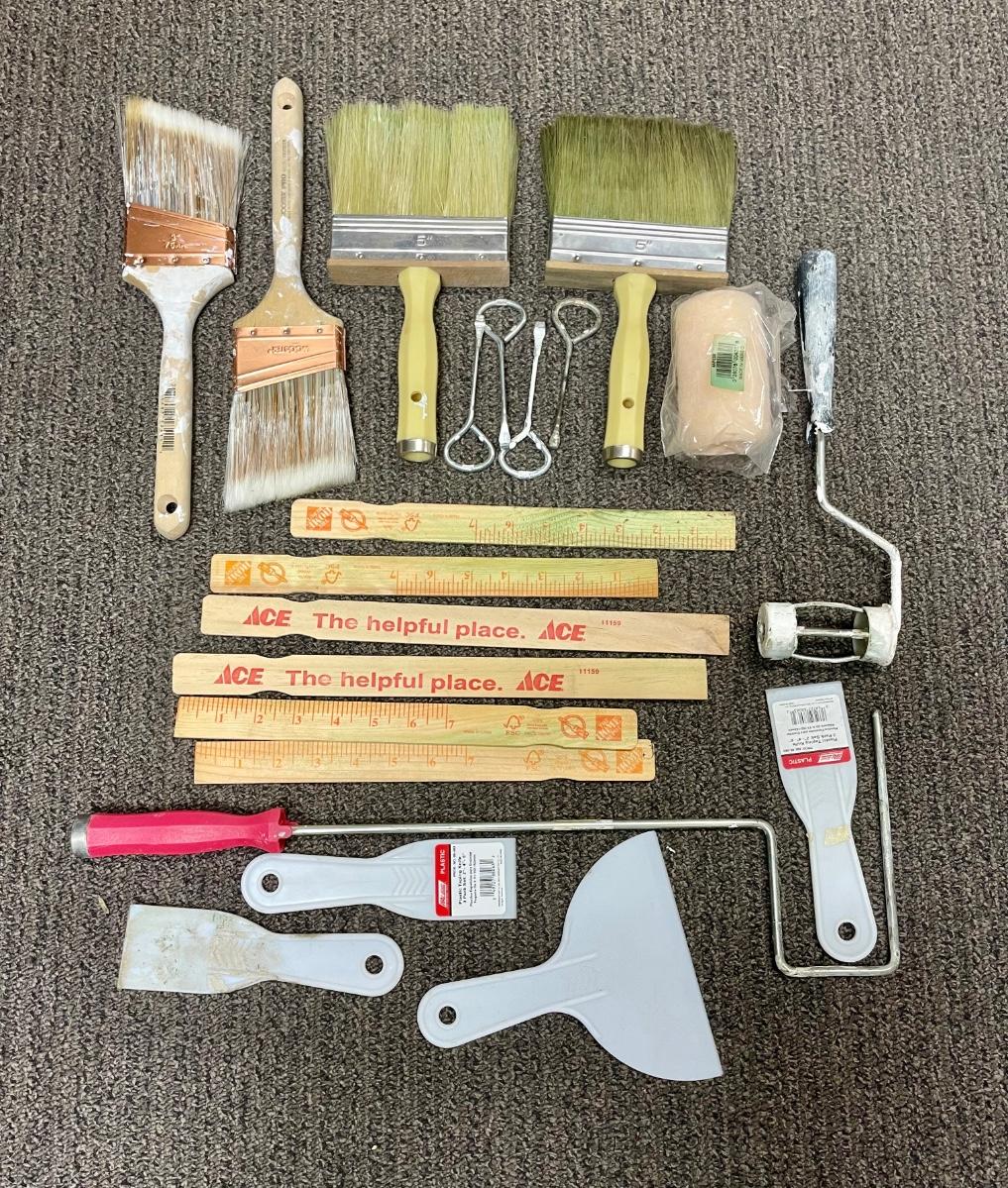 Brushes, paint can openers, roller handles, mini roller, stir sticks, and plastic scrapers/putty knives.