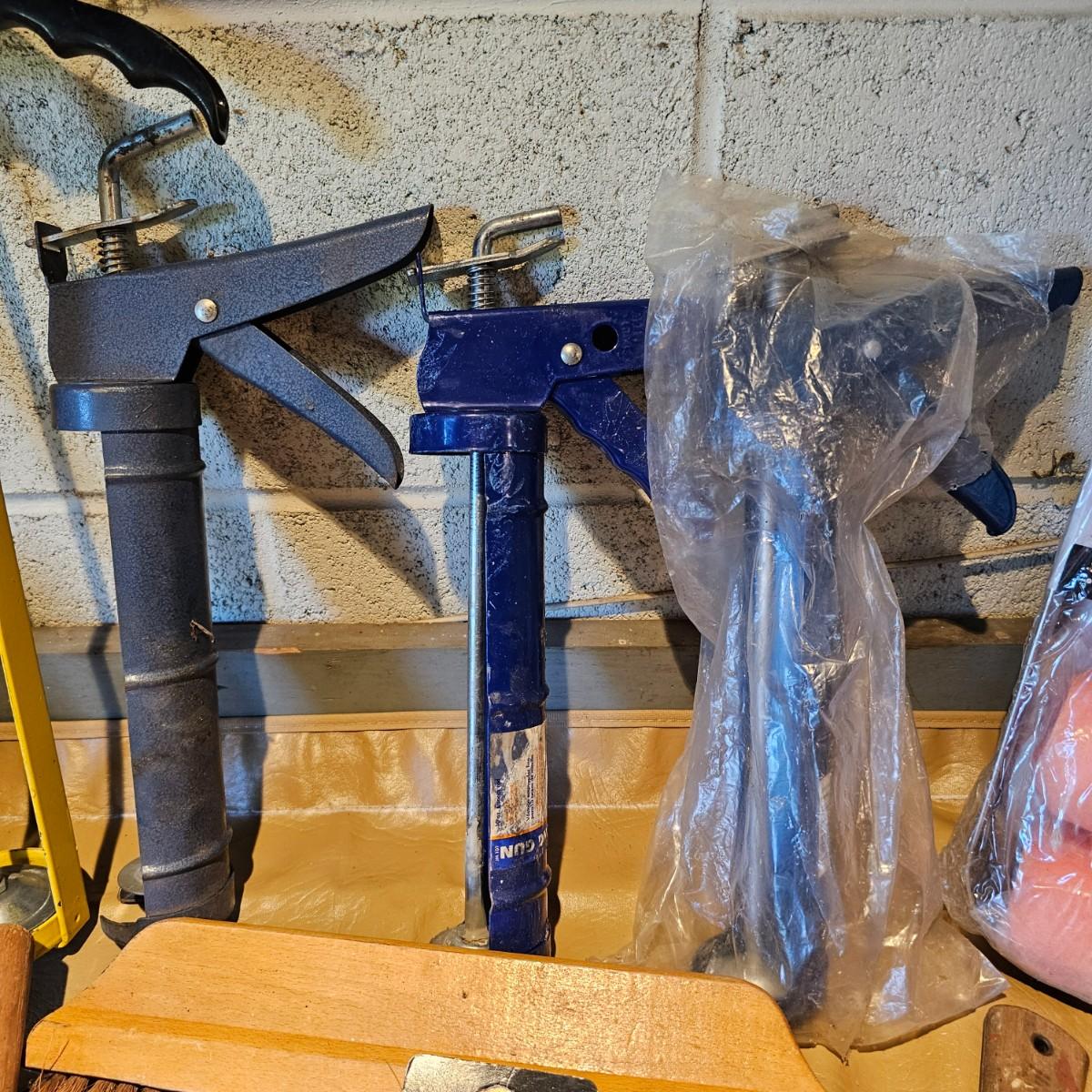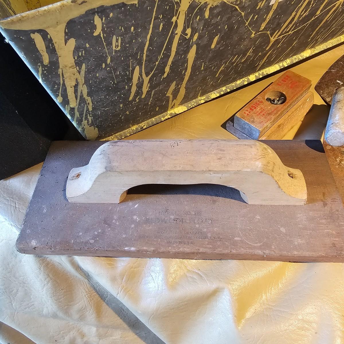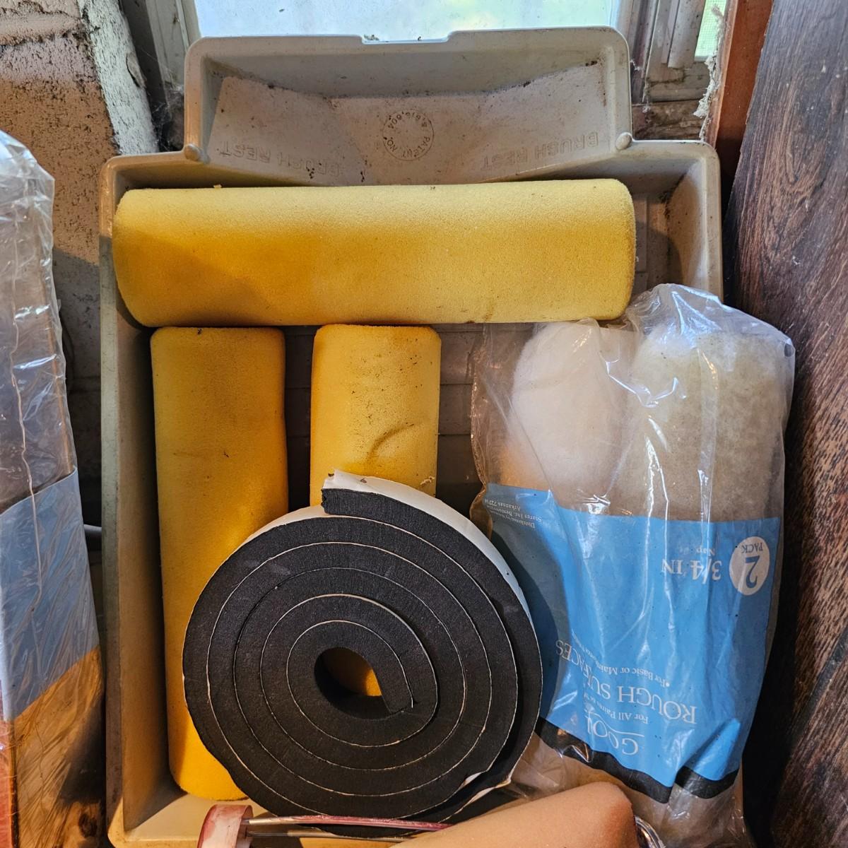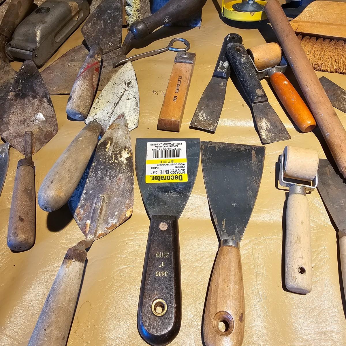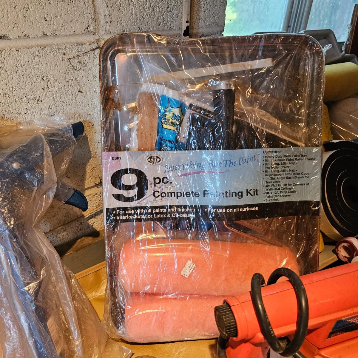 Large assortment of paint tools and other. Trays, rollers, brushes, scrapers, putty knives, trowels, more. Caulk guns and one Burgess electric painting unit, that powered on when plugged in. Some trowels for concrete work as well. See photos for details. Local pickup only.