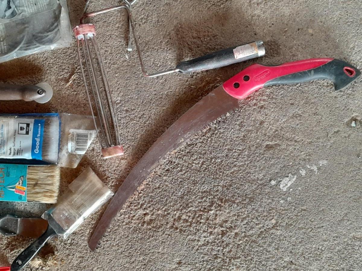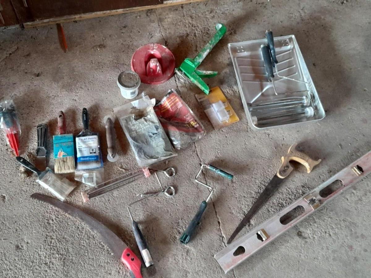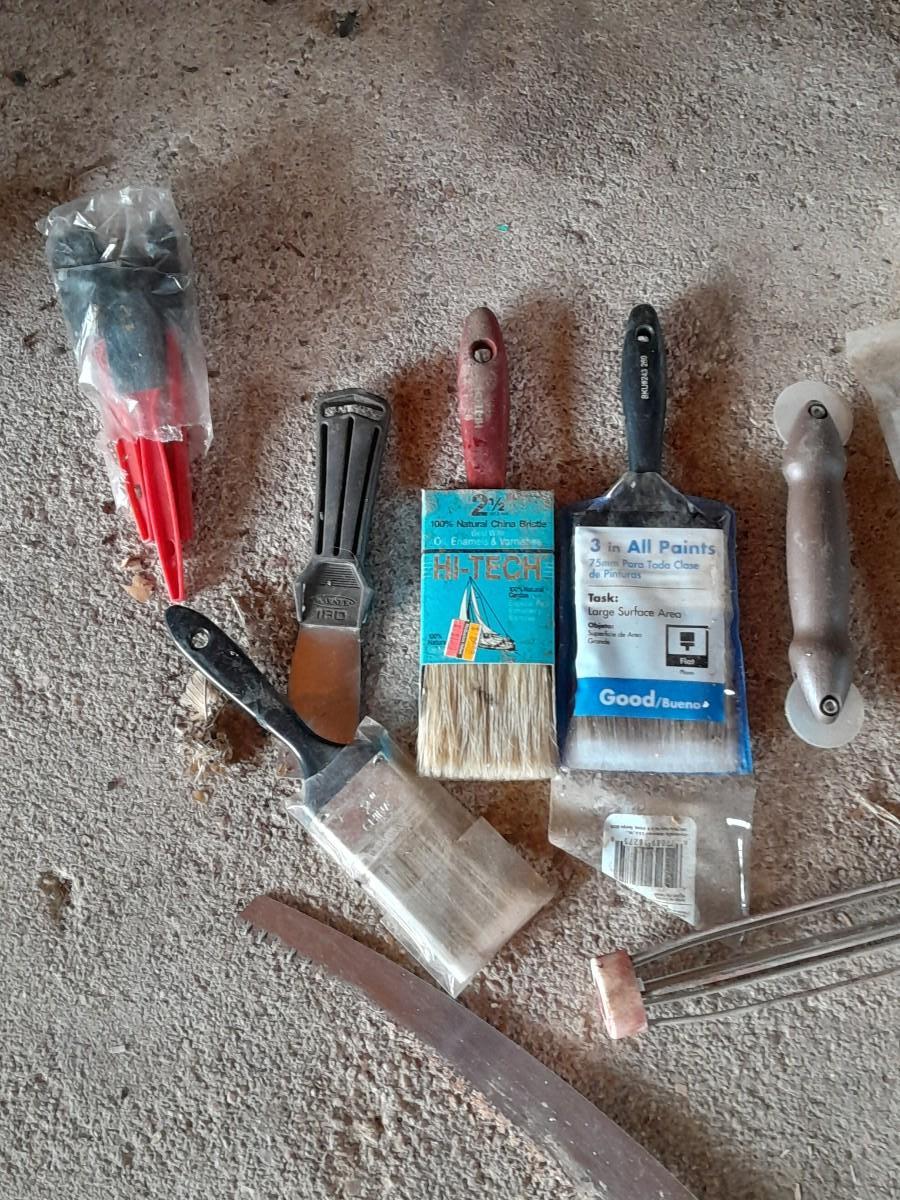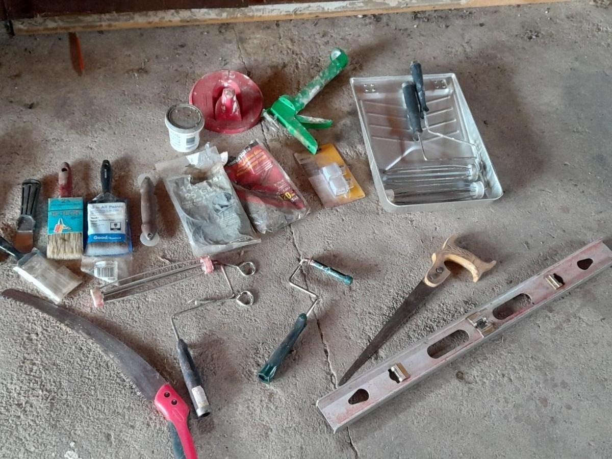 PAINTING TOOLS, SAWS, LEVEL, BRUSHES, ROLLERS, CAULKING GUN AND MORE