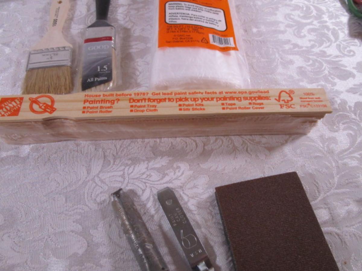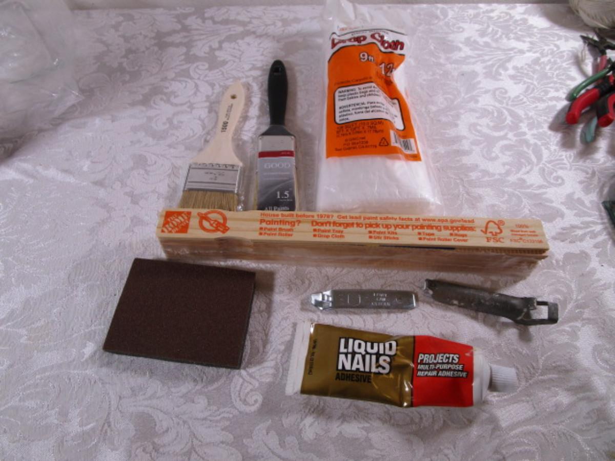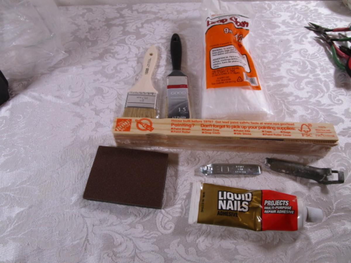 2 paint brushes, 10 paint mixing sticks, sanding sponge, 2 paint can openers, 9' x 12' drop cloth, tube of liquid nails