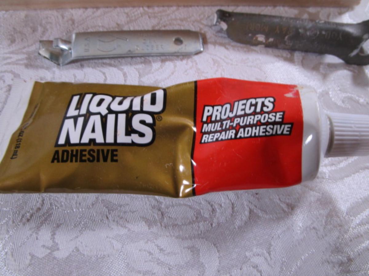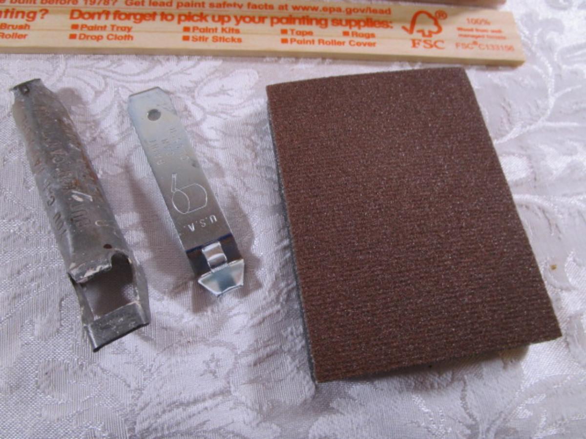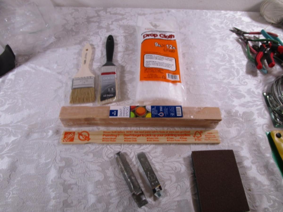 2 paint brushes, 10 paint mixing sticks, sanding sponge, 2 paint can openers, 9' x 12' drop cloth, tube of liquid nails