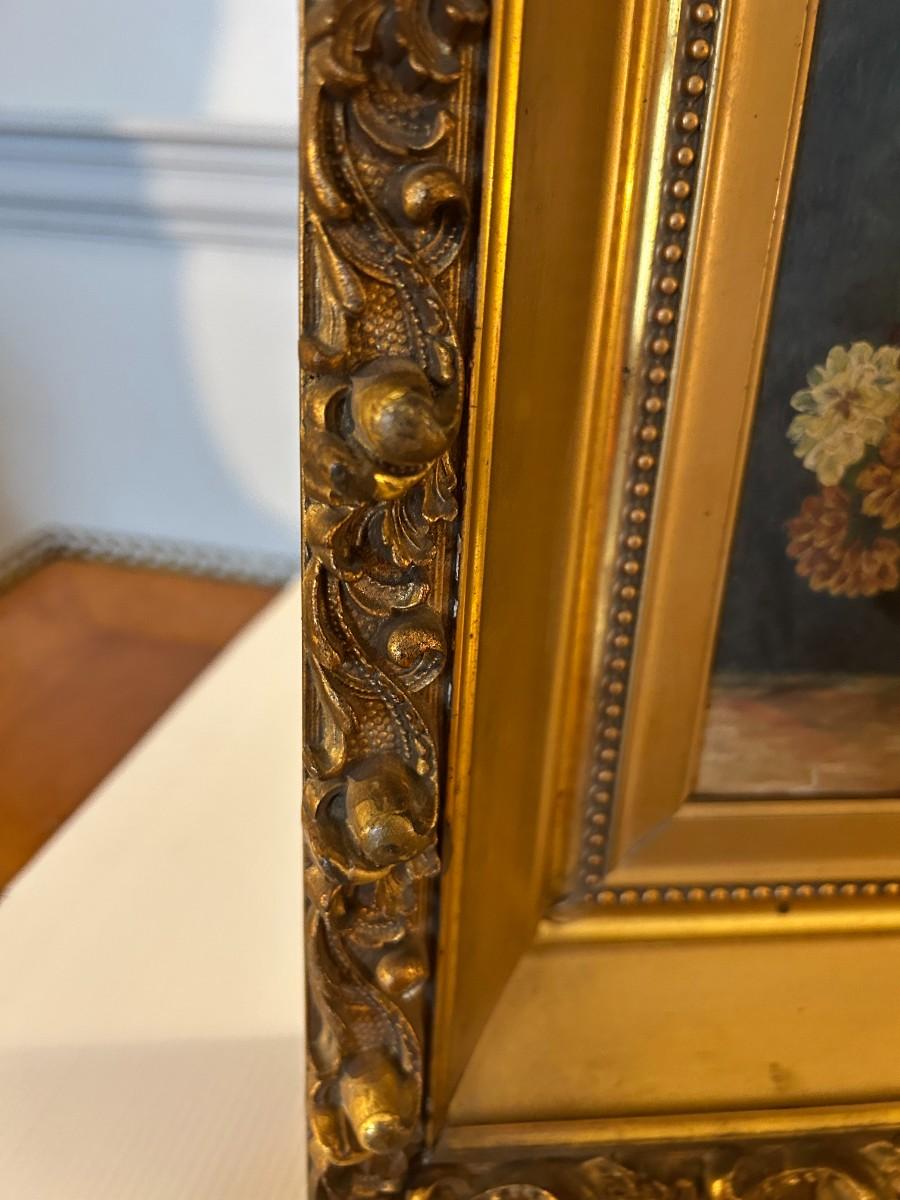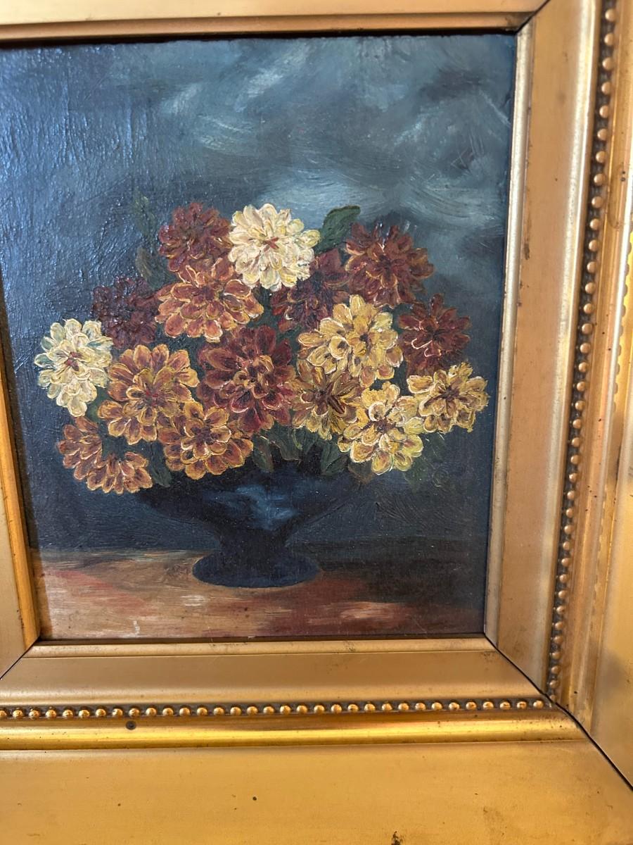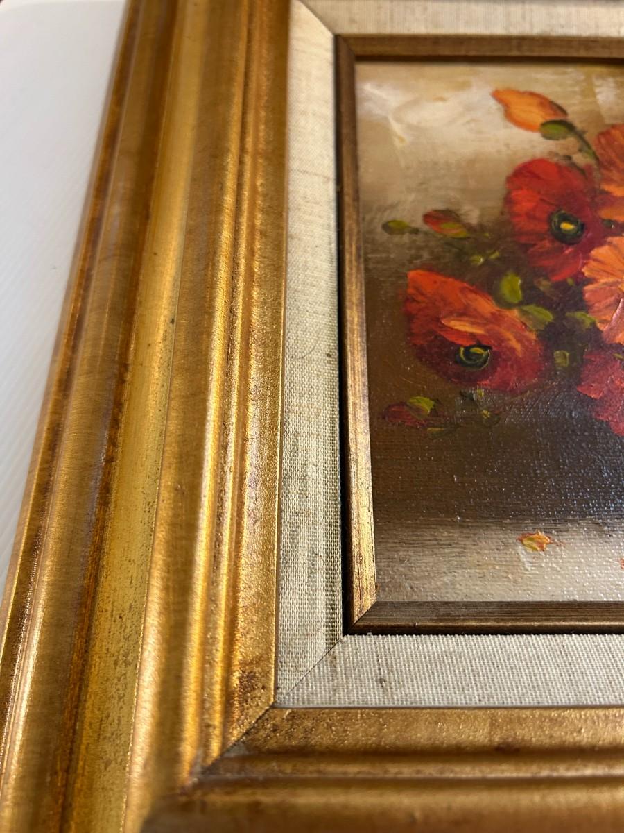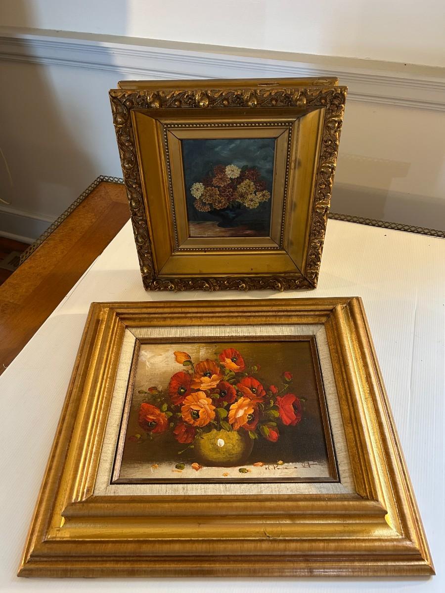 Two paintings in gold frames, no chips or cracks. Red flowers measure 17x15, smaller painting is 11.5x12.5