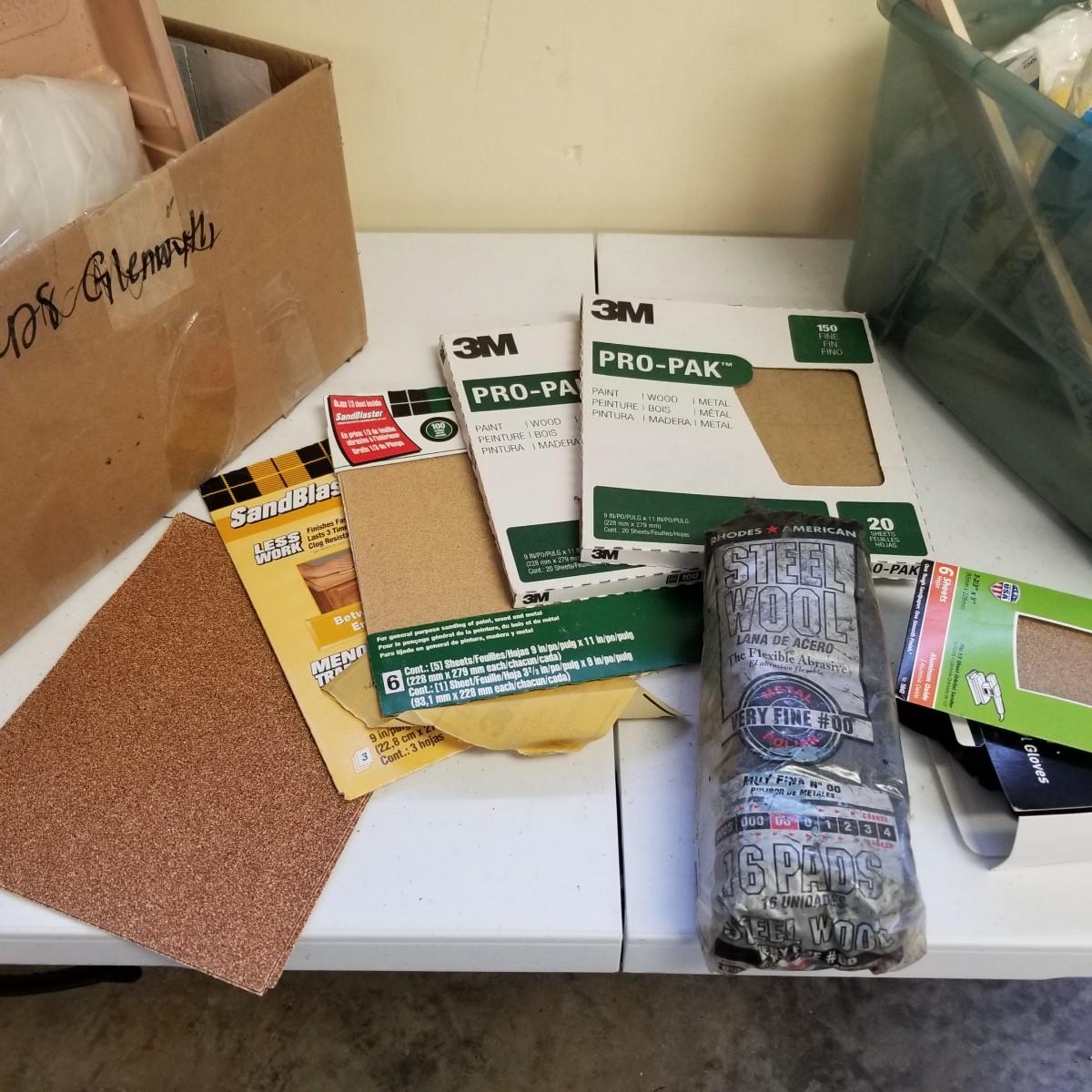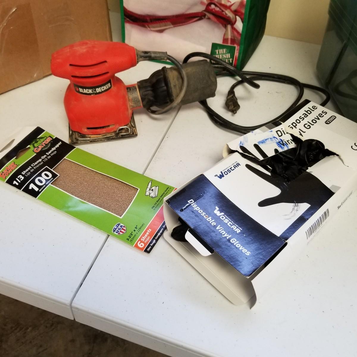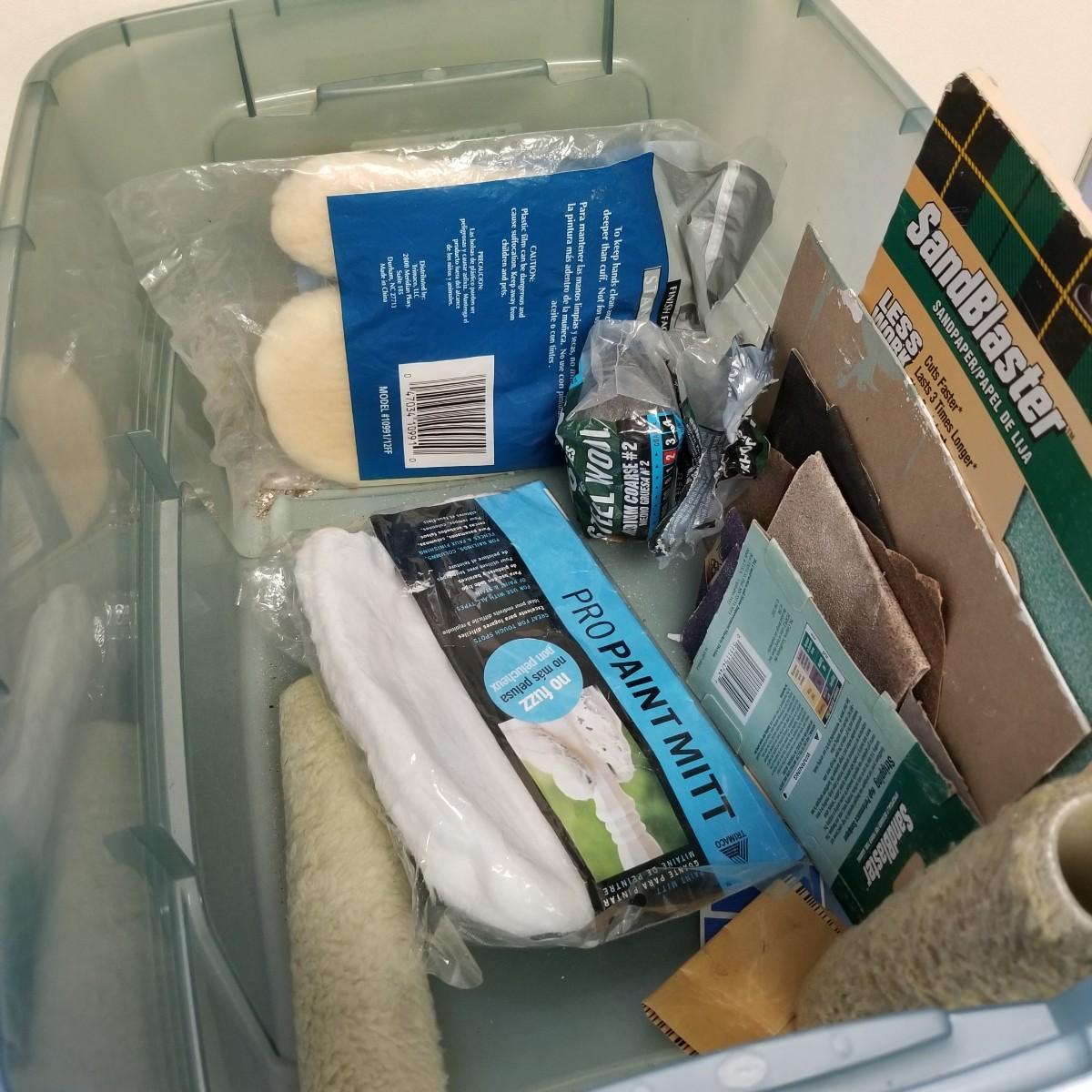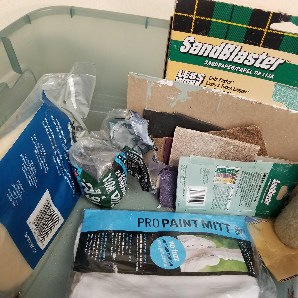 Several different grits of sandpaper, paint tray with liners, rollers, covers. One Black & Decker cut sheet palm sander, powered on when tested. Other packages of sandpaper and a sleeve of steel wool. See photos for details. Bin is included. Table not included. Shipping available.
