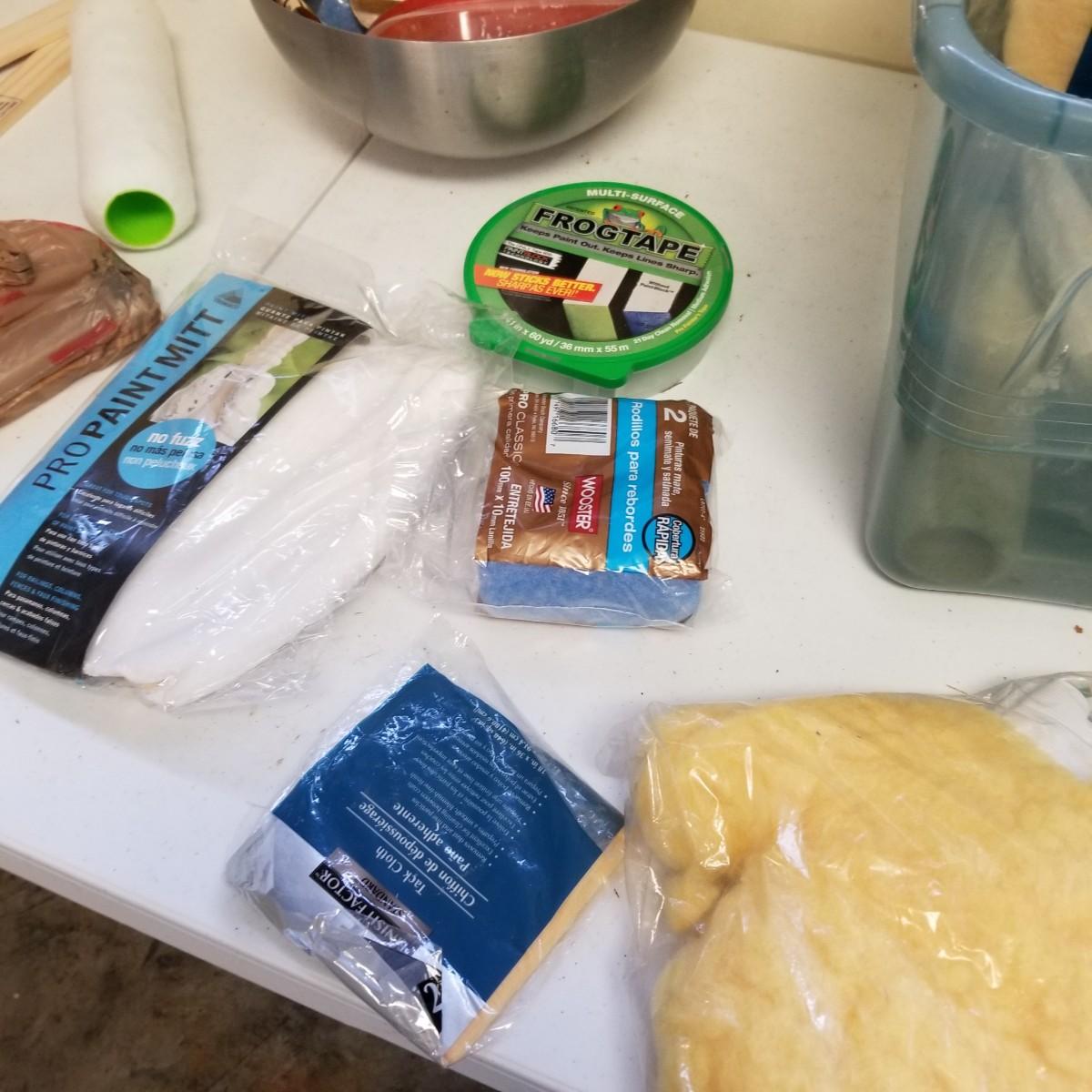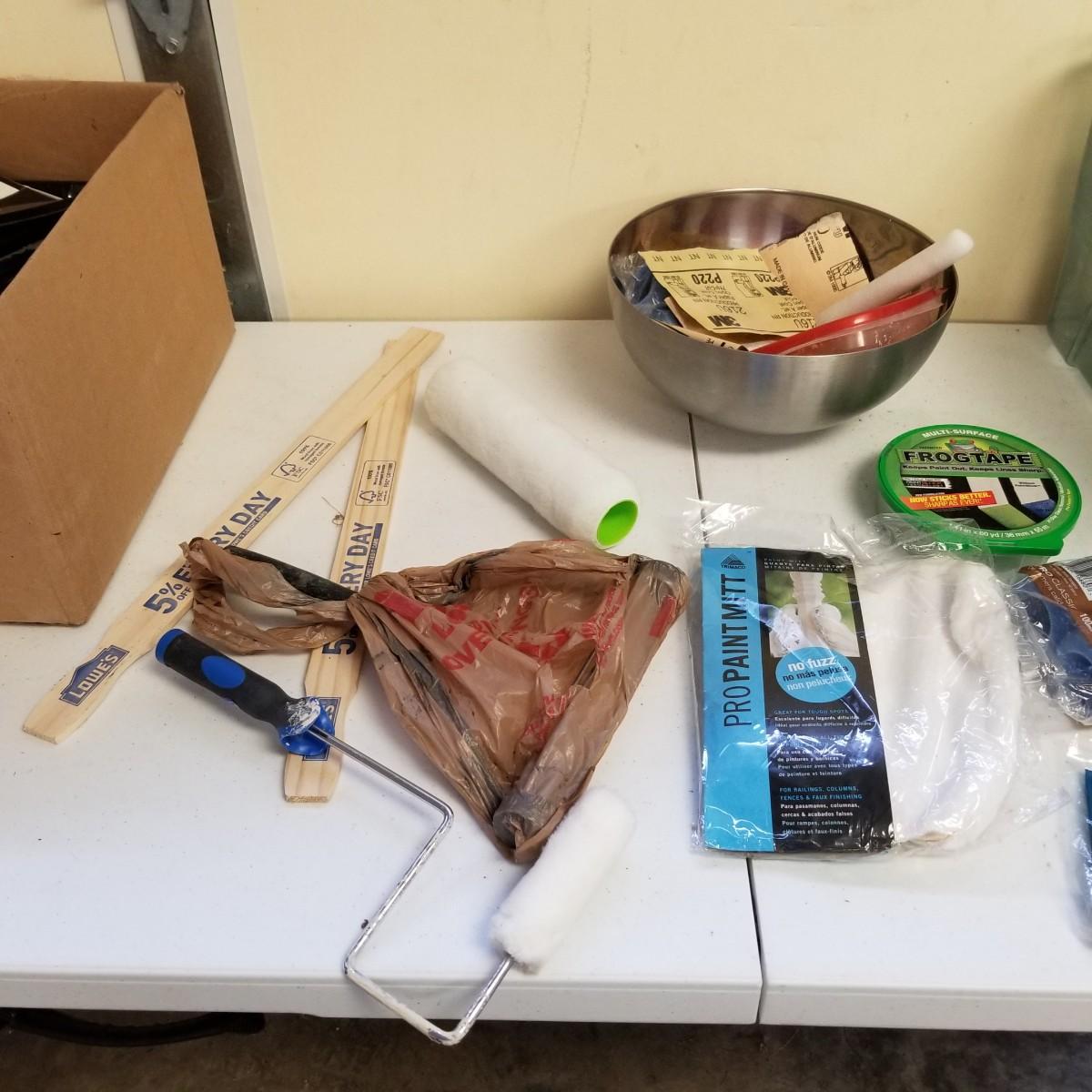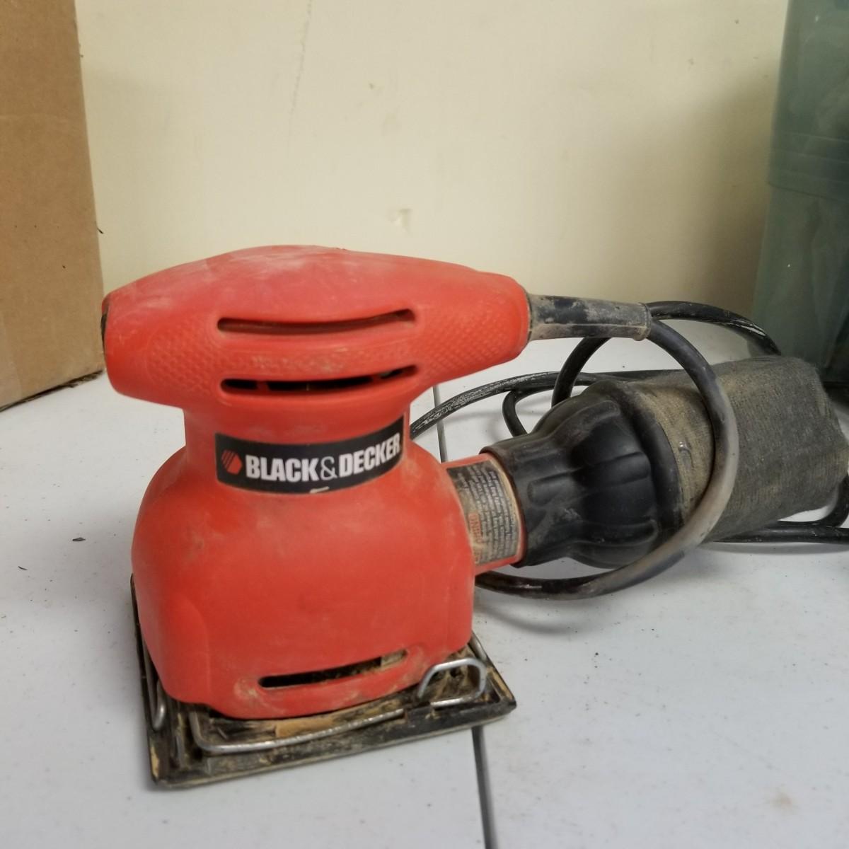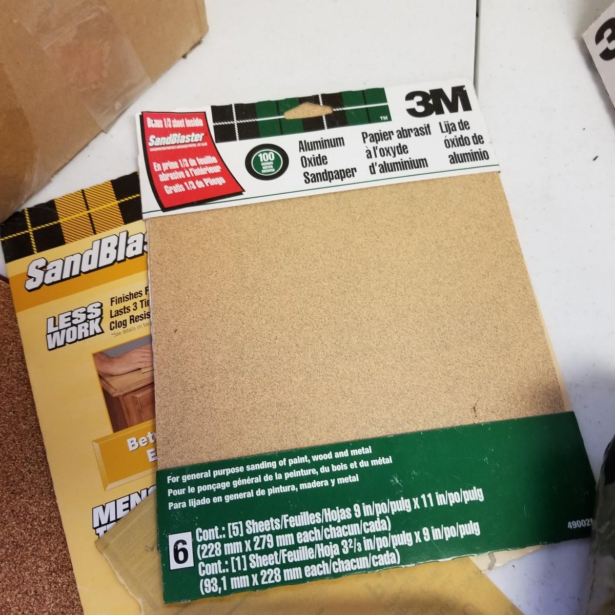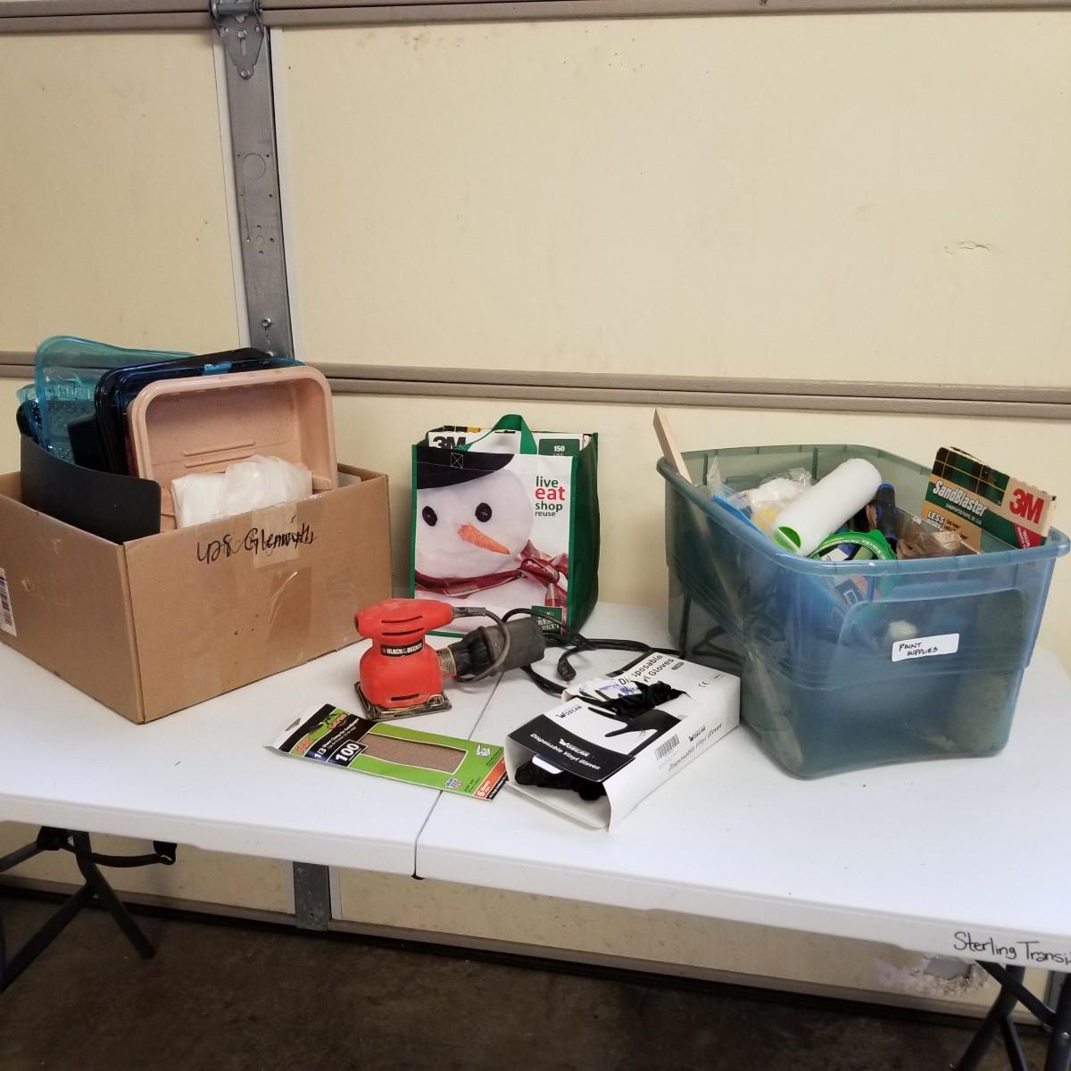 Several different grits of sandpaper, paint tray with liners, rollers, covers. One Black & Decker cut sheet palm sander, powered on when tested. Other packages of sandpaper and a sleeve of steel wool. See photos for details. Bin is included. Table not included. Shipping available.
