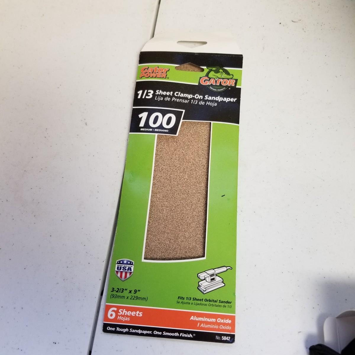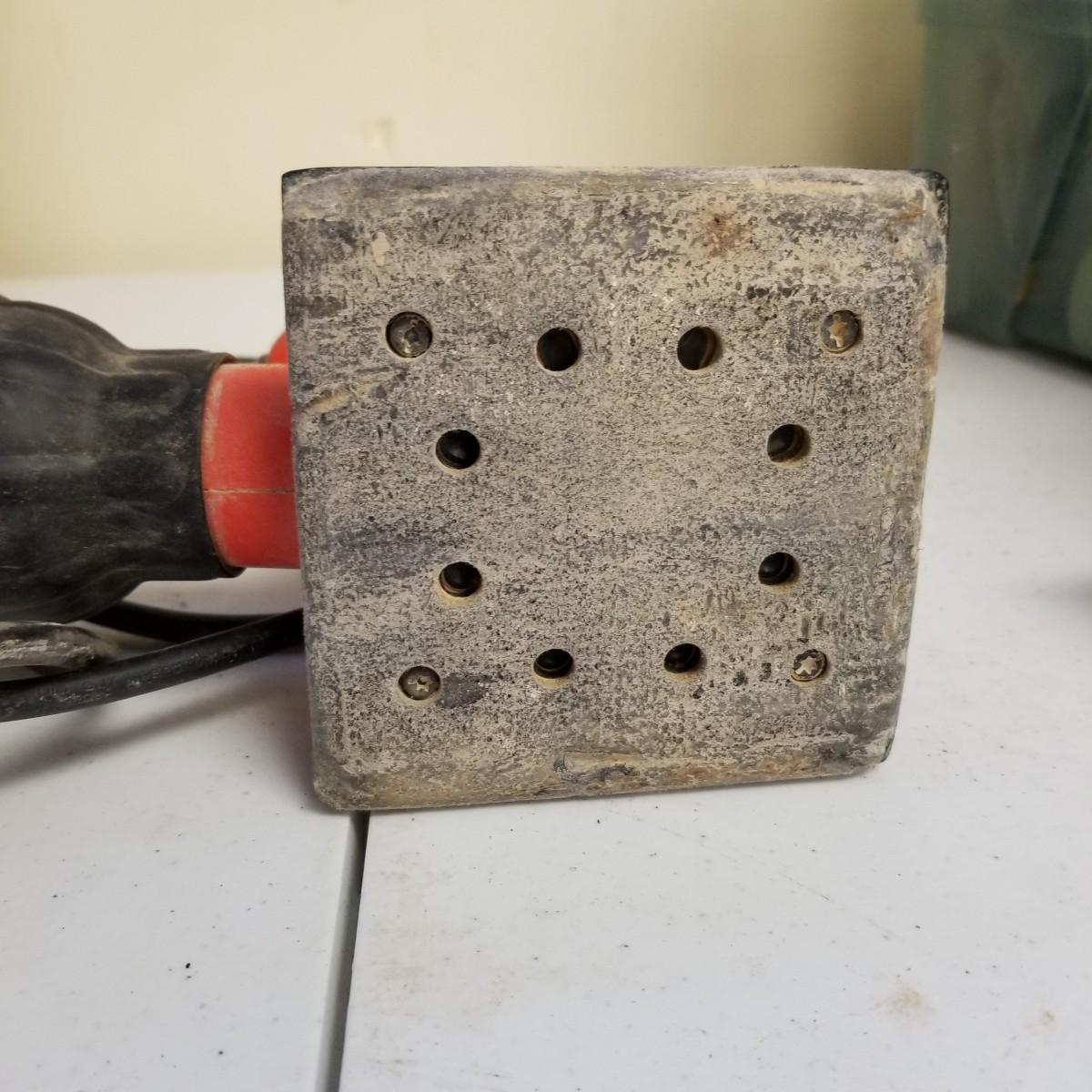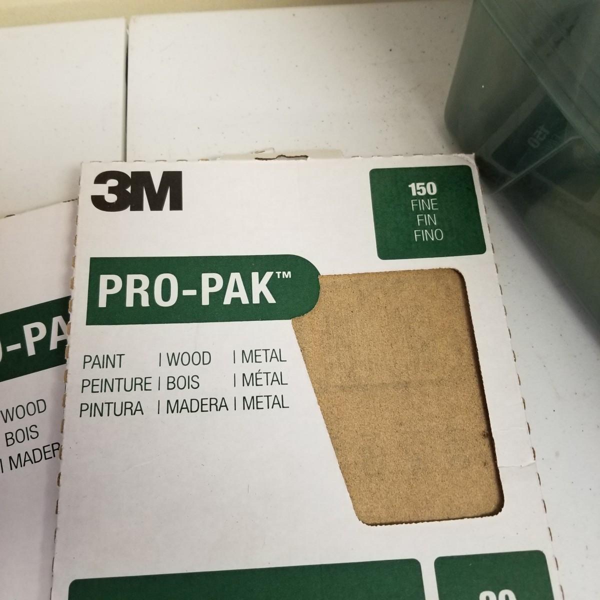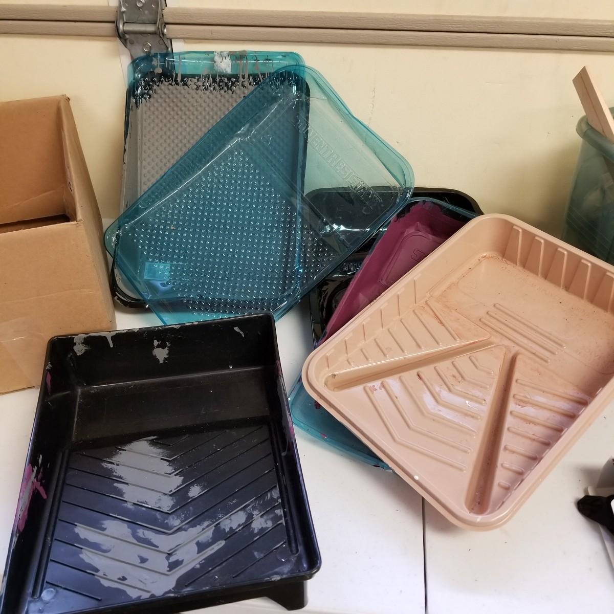 Several different grits of sandpaper, paint tray with liners, rollers, covers. One Black & Decker cut sheet palm sander, powered on when tested. Other packages of sandpaper and a sleeve of steel wool. See photos for details. Bin is included. Table not included. Shipping available.