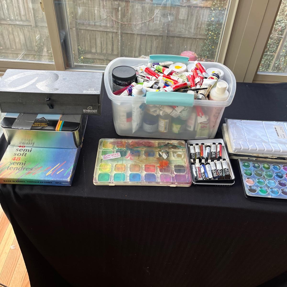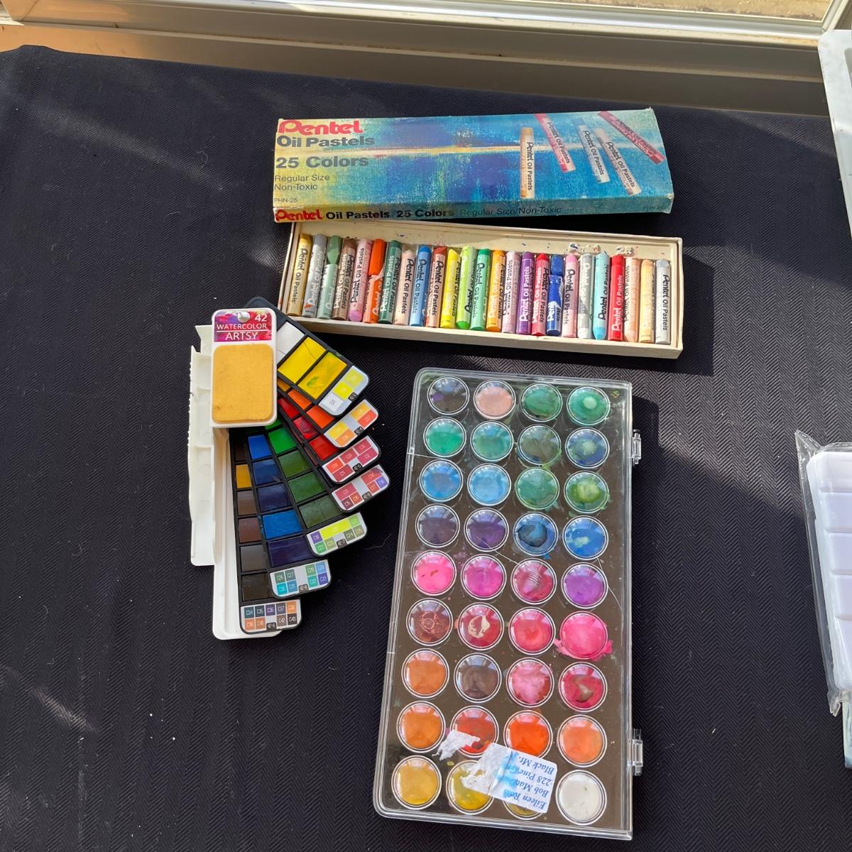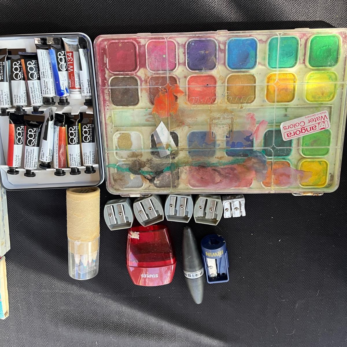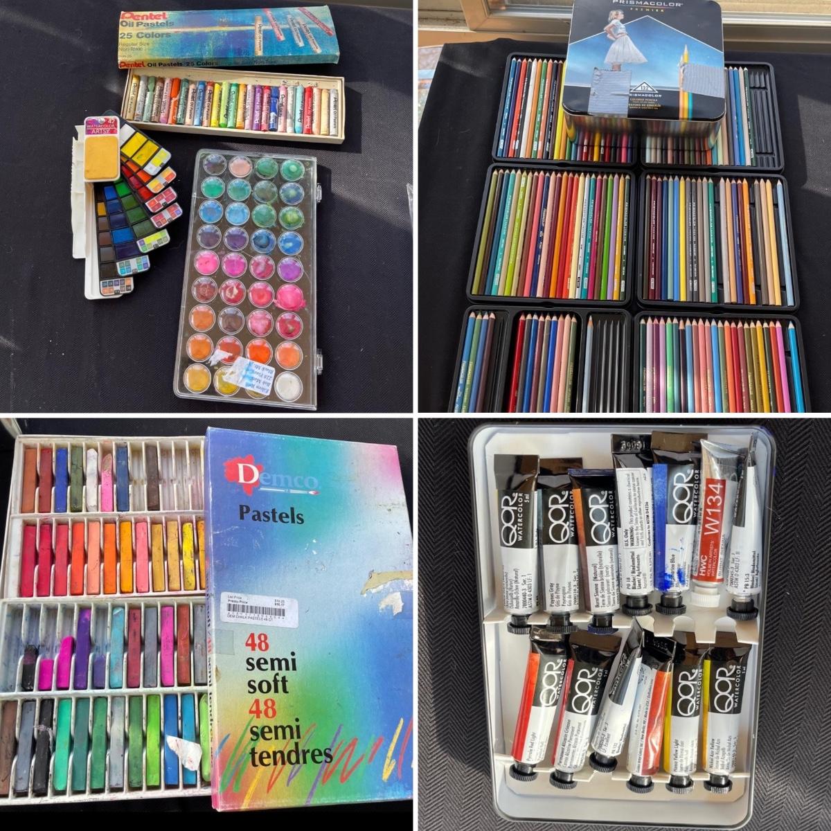 Lot contains a large amount of colored pencils, paint, pastels, paint palettes, brush basins and more. Many of the supplies have been used and we cannot verify contents of open supplies.