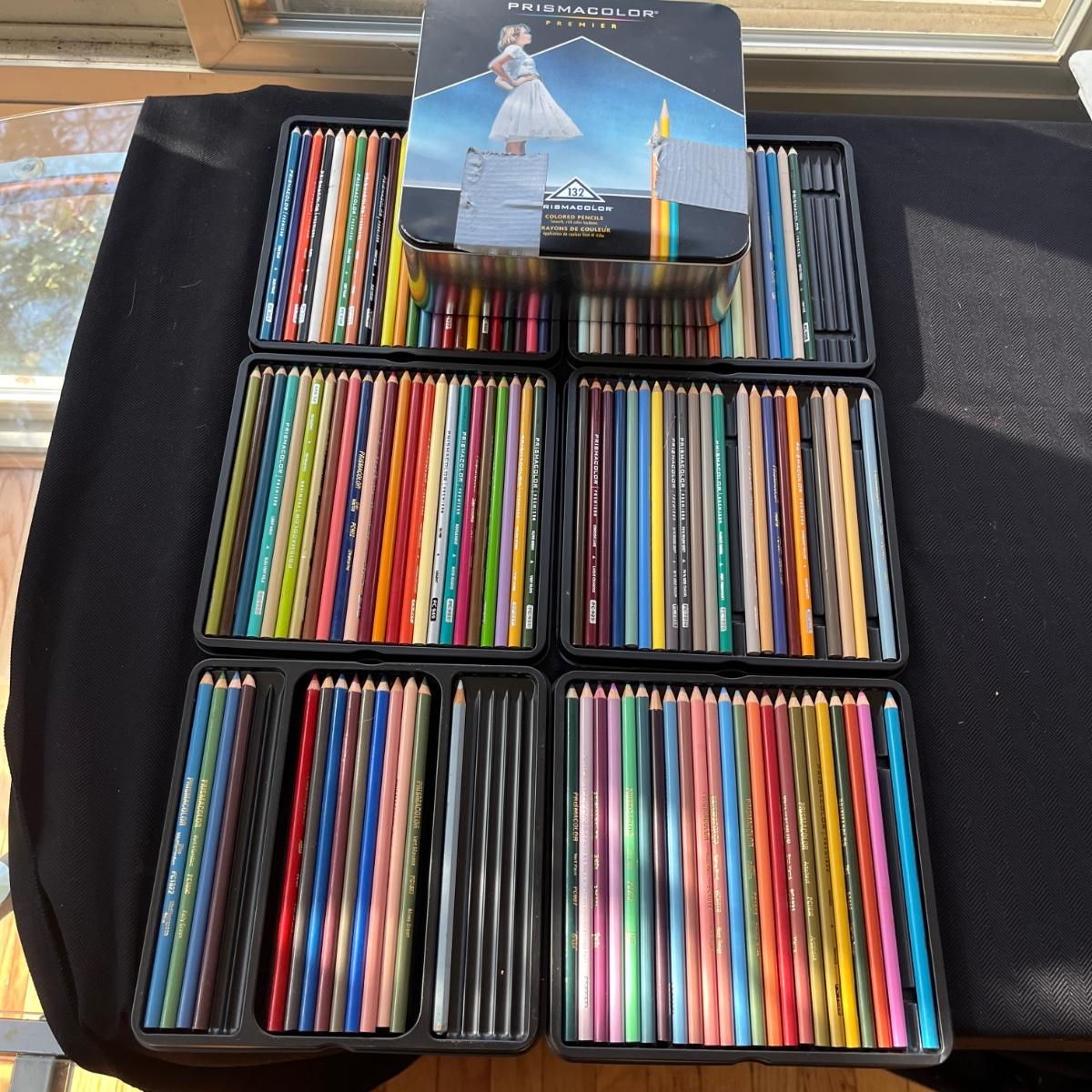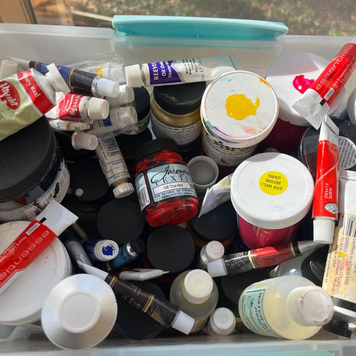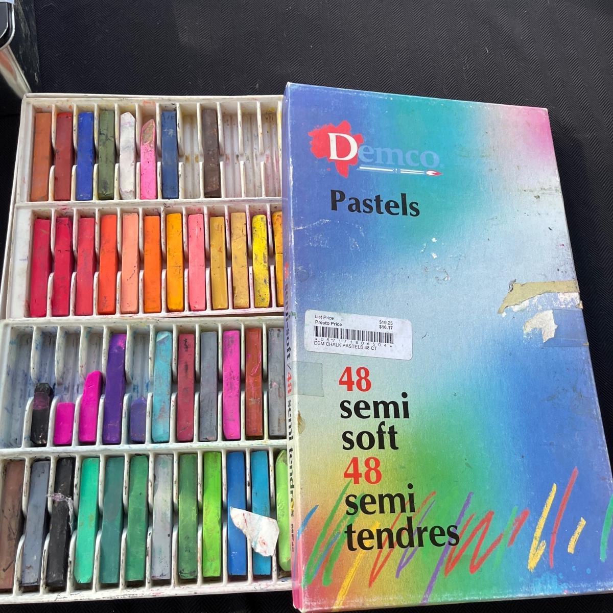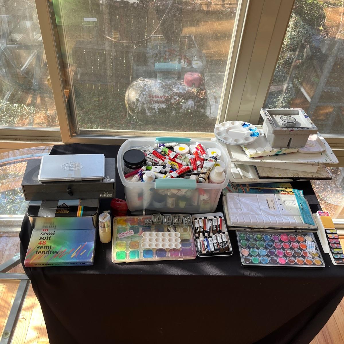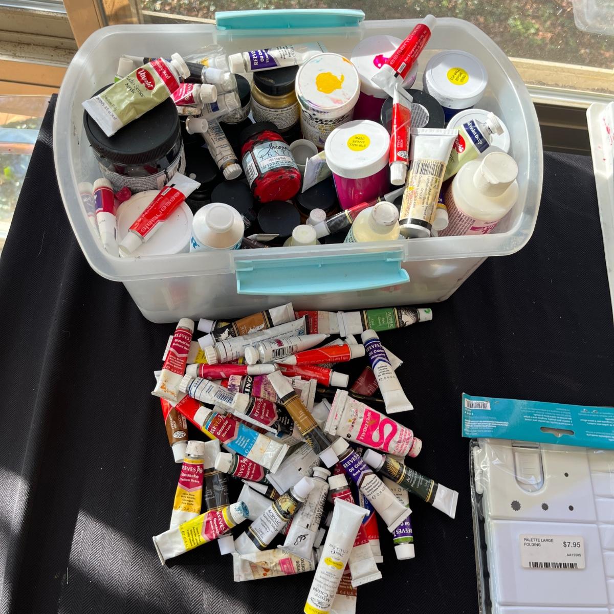 Lot contains a large amount of colored pencils, paint, pastels, paint palettes, brush basins and more. Many of the supplies have been used and we cannot verify contents of open supplies.