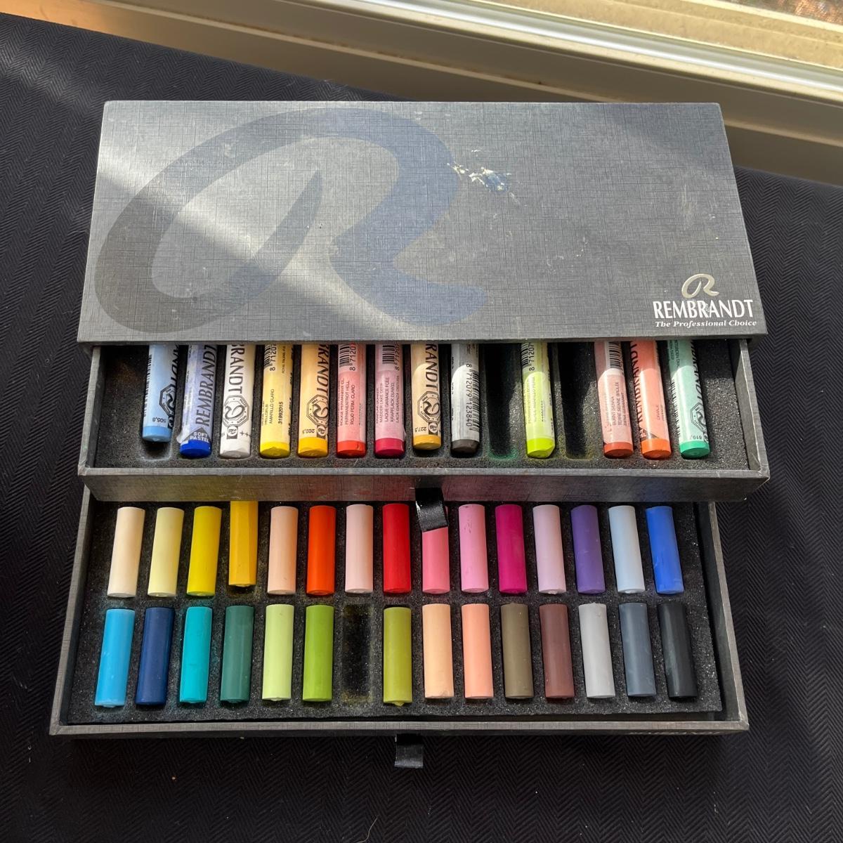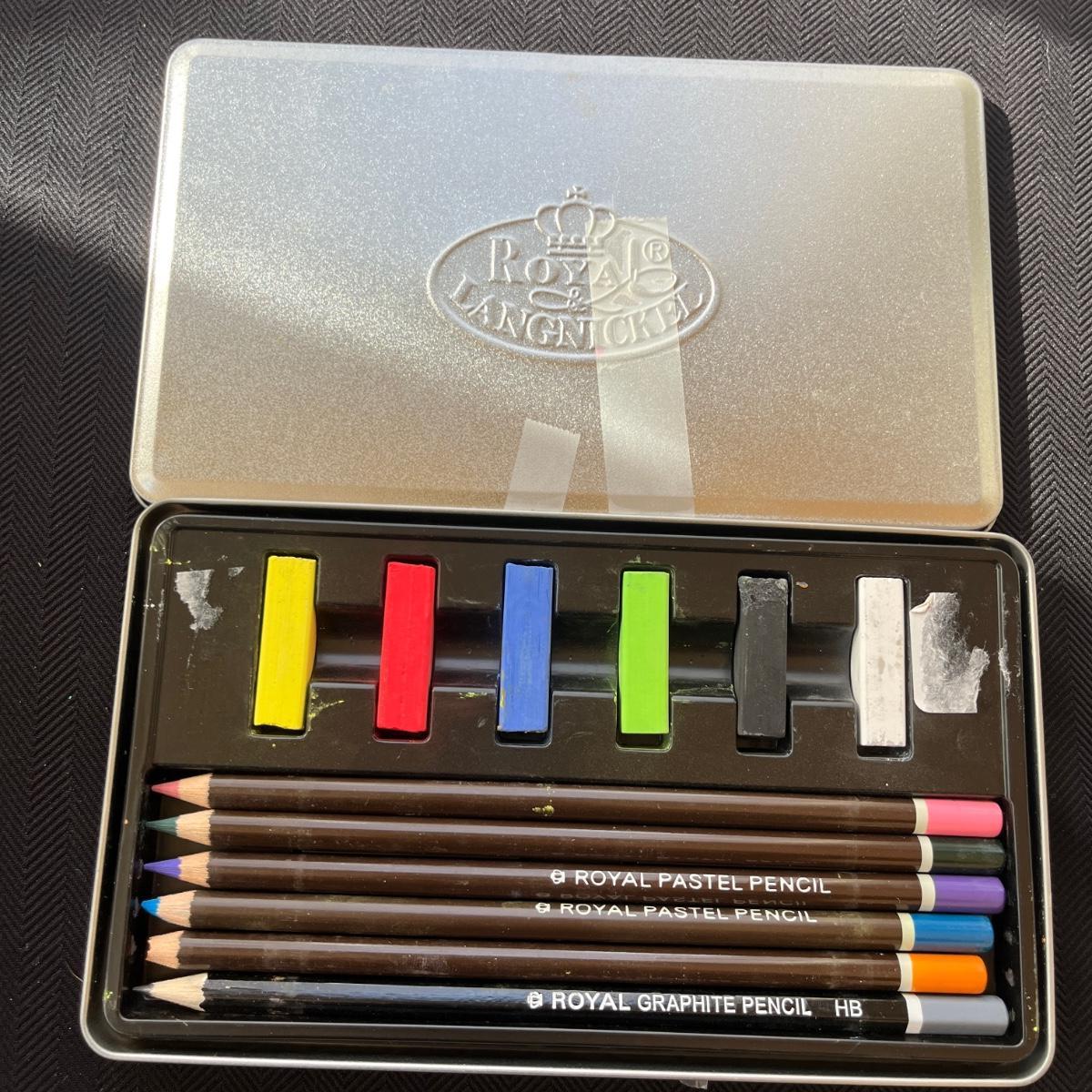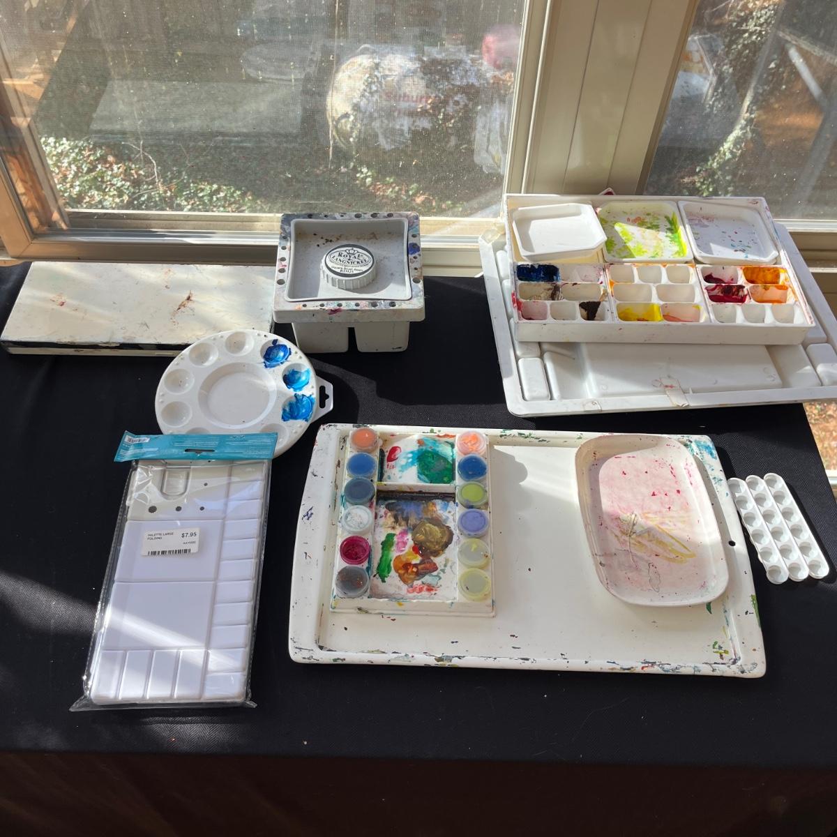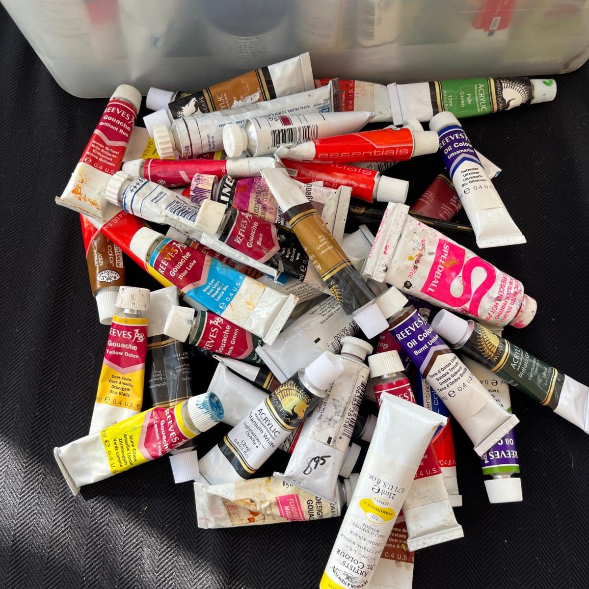 Lot contains a large amount of colored pencils, paint, pastels, paint palettes, brush basins and more. Many of the supplies have been used and we cannot verify contents of open supplies.