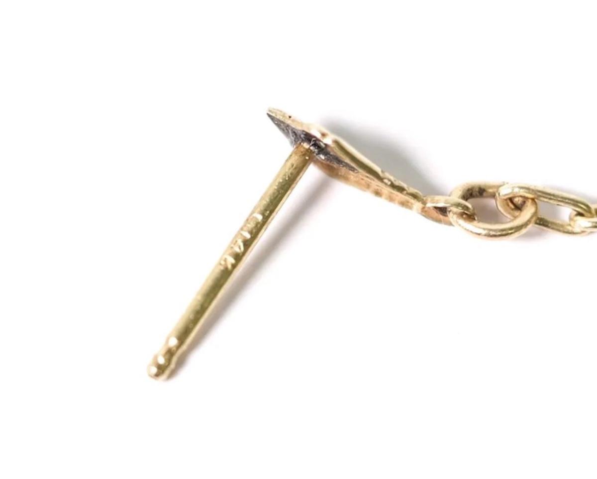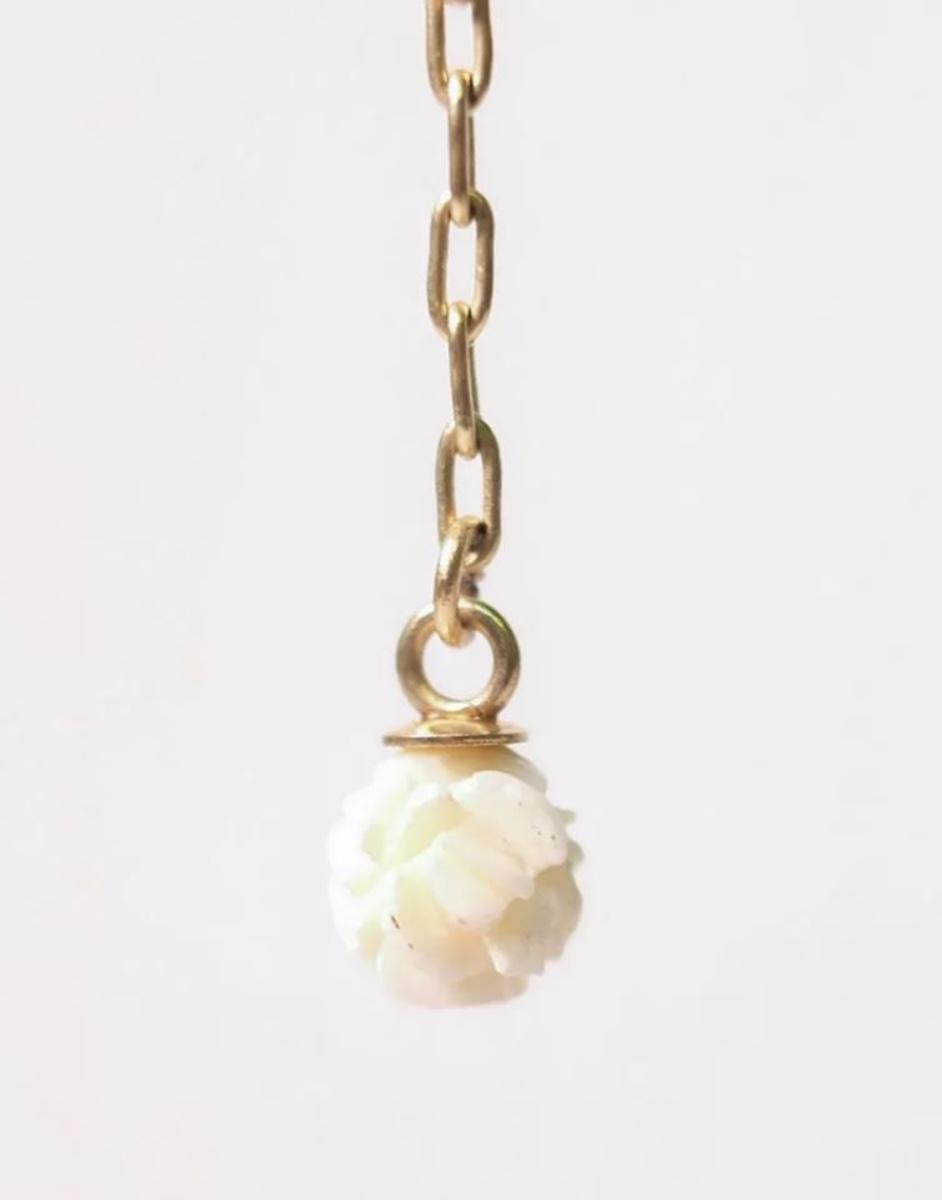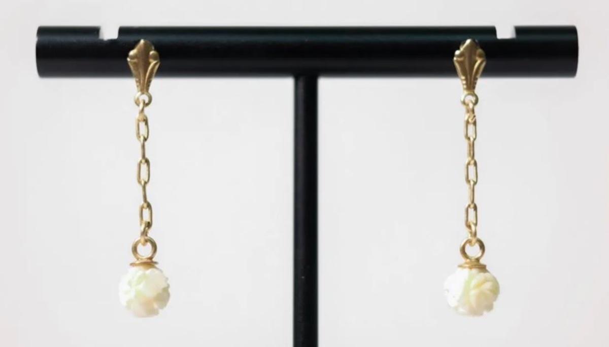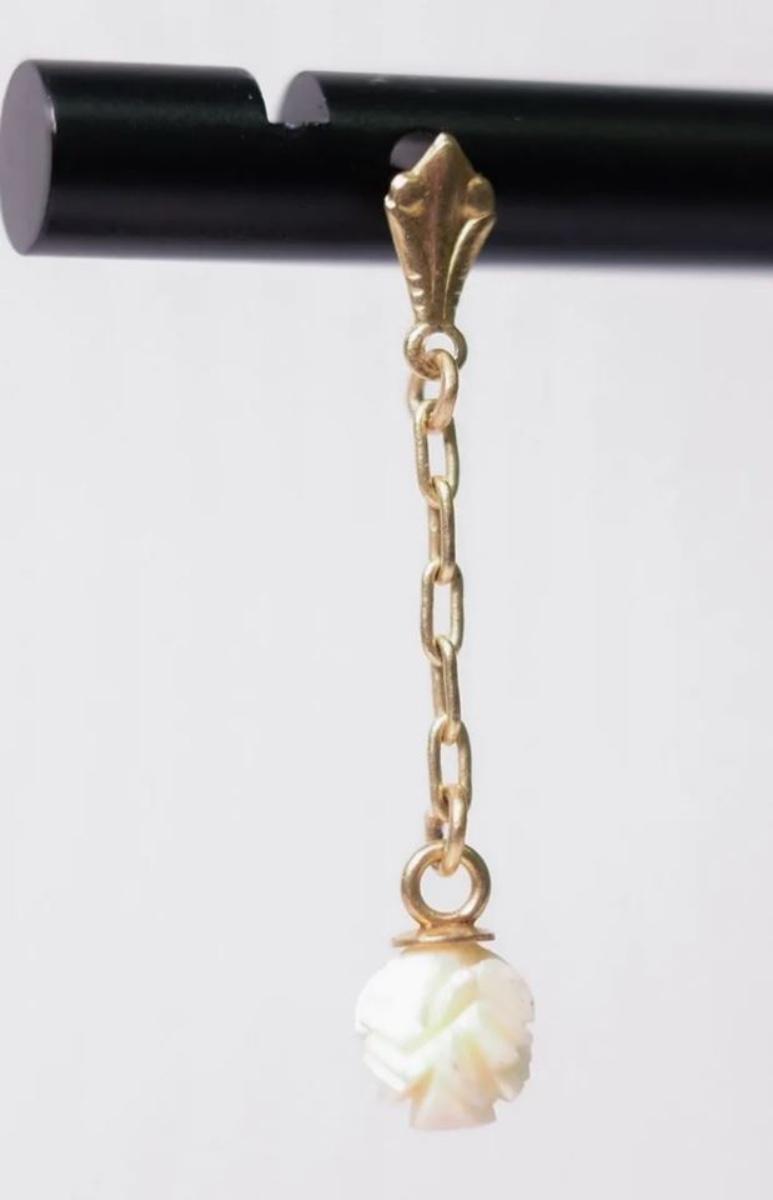 Pair of 14k yellow gold dangle post back earrings, each with carved rose ball. Stamped 14k. Approx. length 1.12 in., overall weight 0.81 grams. Note: Lacking backings.