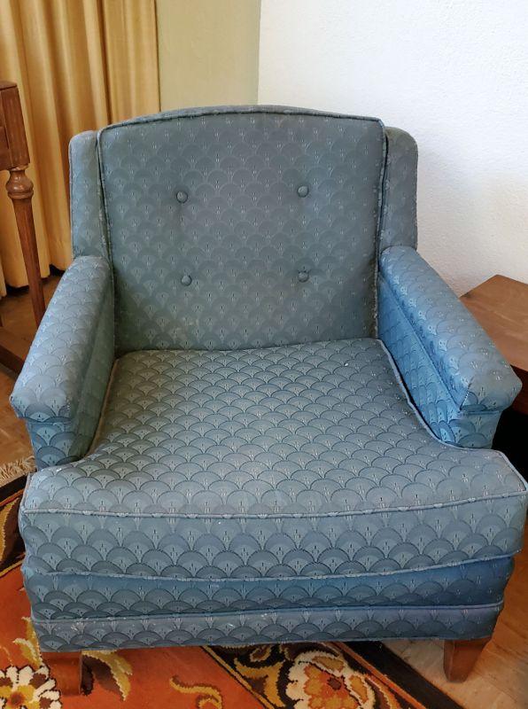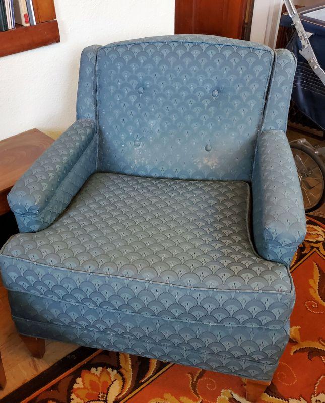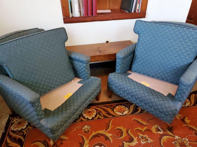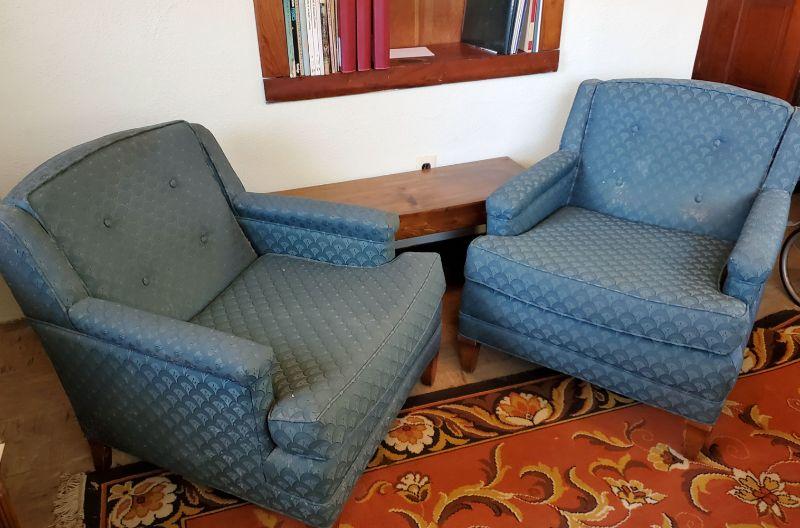Overall good condition but upholstery needs cleaning. Small, comfortable chairs. 29" wide, 34" deep and 28" tall.
