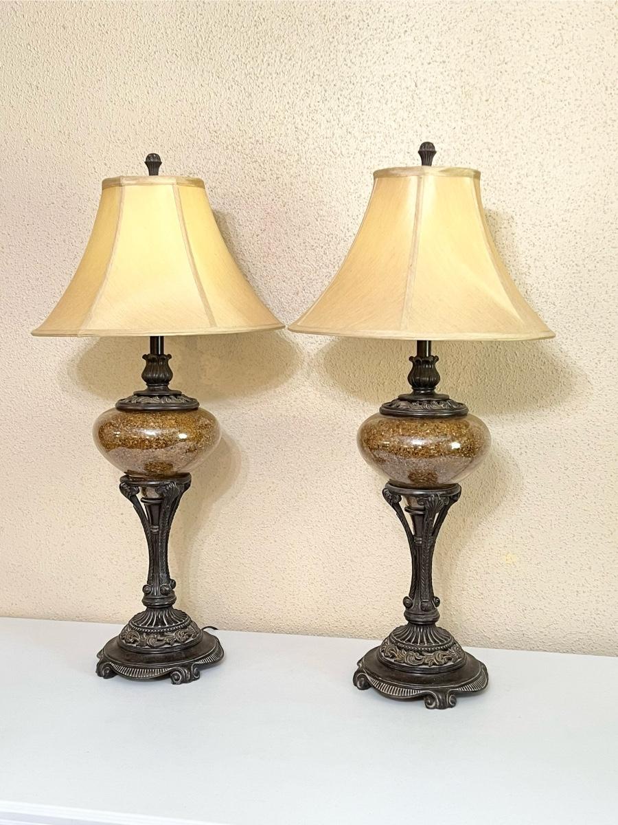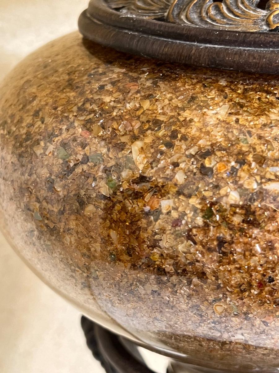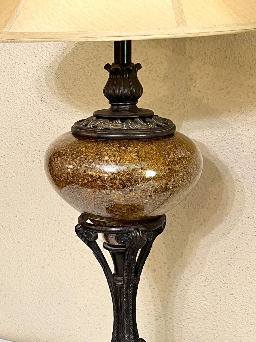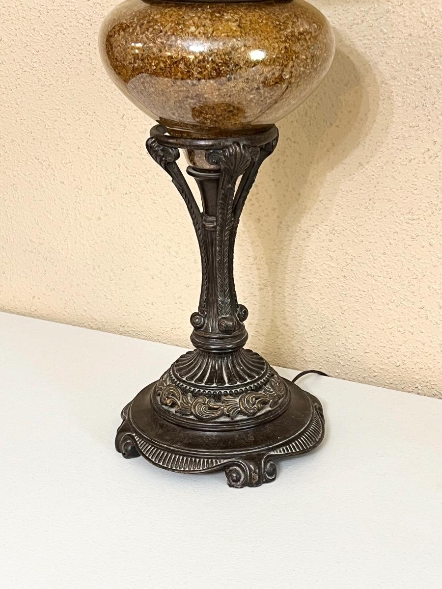 Base is made of a resin based material with a glass globe in middle ~ Does have minor spots on base, see photos ~ 37” H x 18” Round