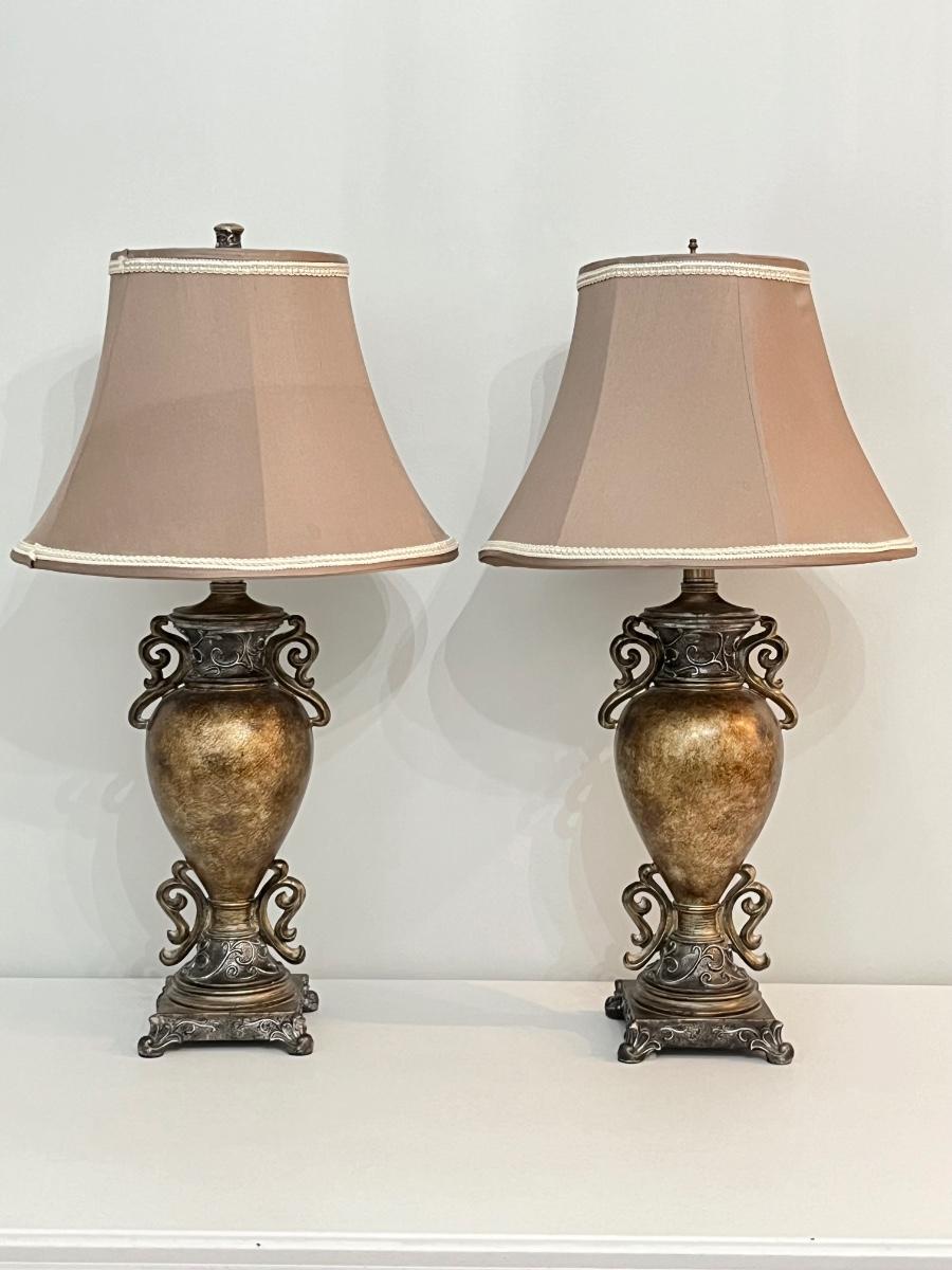 Pair (2) ~ Antiqued Bronze & Silver Ornate Urn Style Lamps