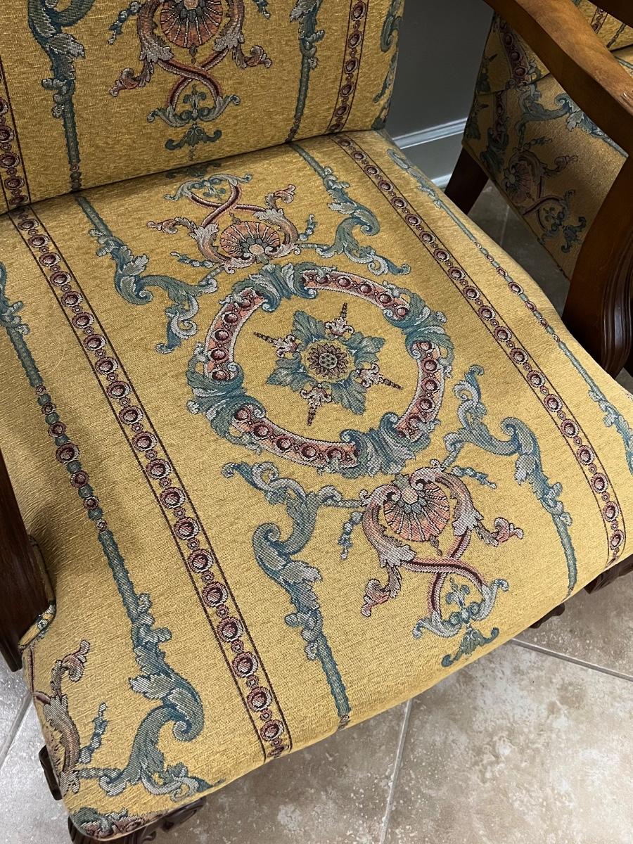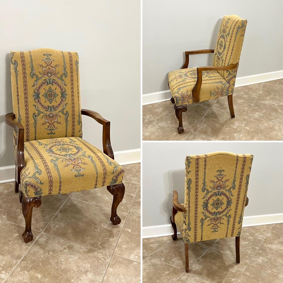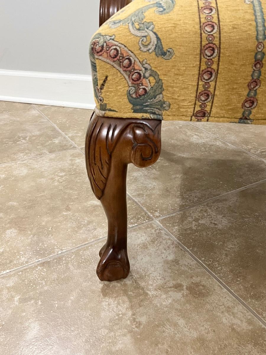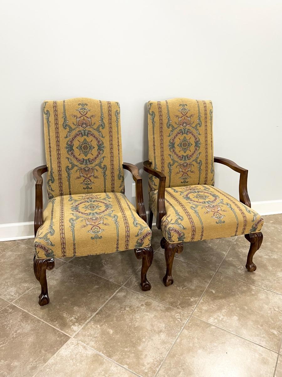 Pair (2) Mahogany Ball Clawfoot Upholstered Arm Chairs