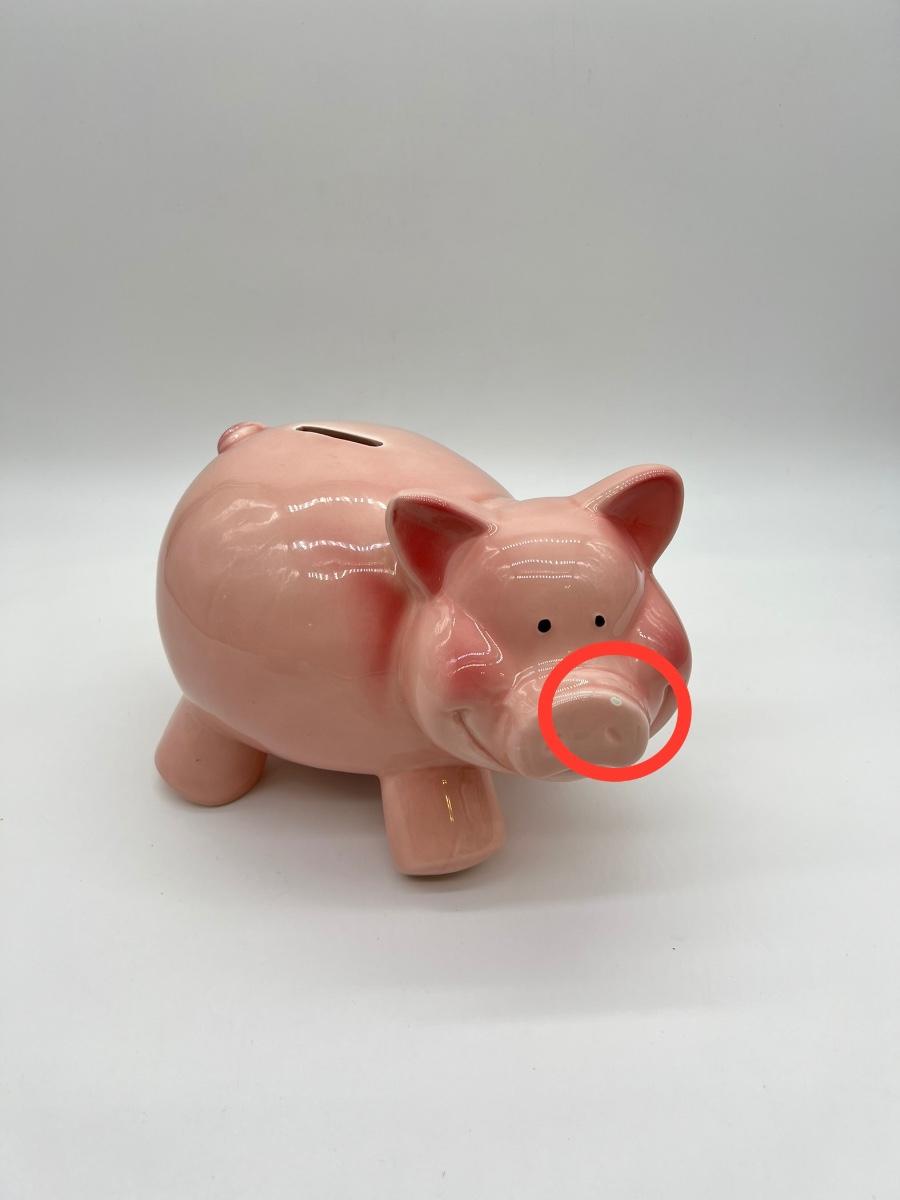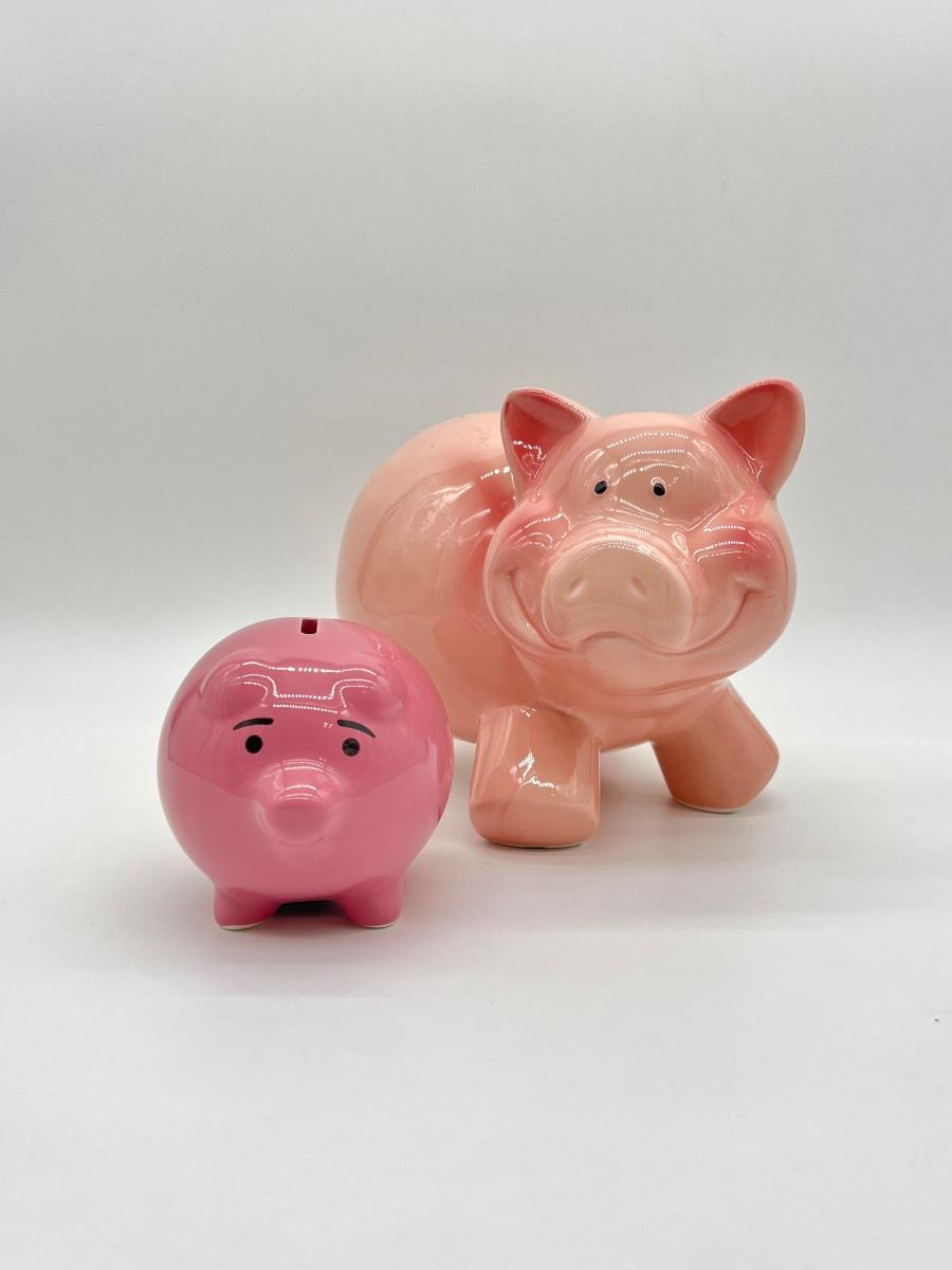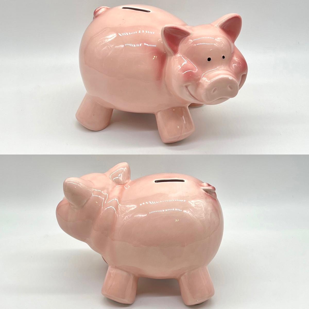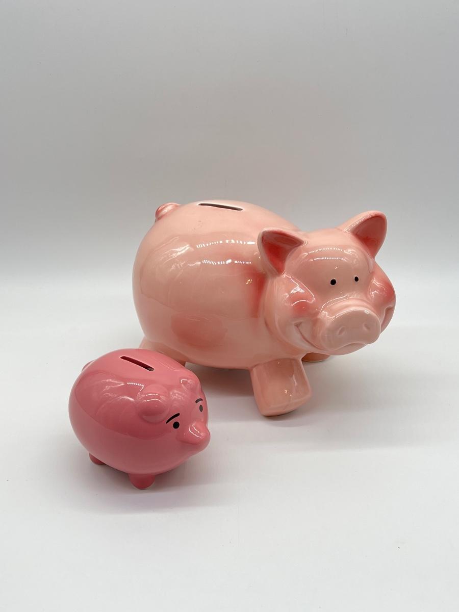 Larger piggy has minor chip on its nose. Larger piggy = 6.5” H x 6” W x 9 “ D ~ Smaller piggy = 3.5” H x 3.5” W x 4.5” D