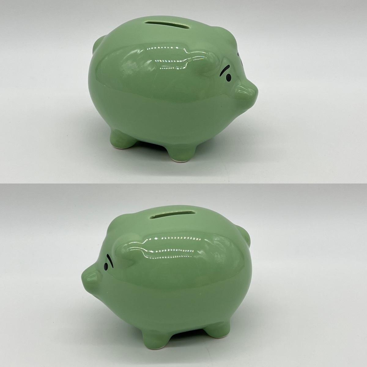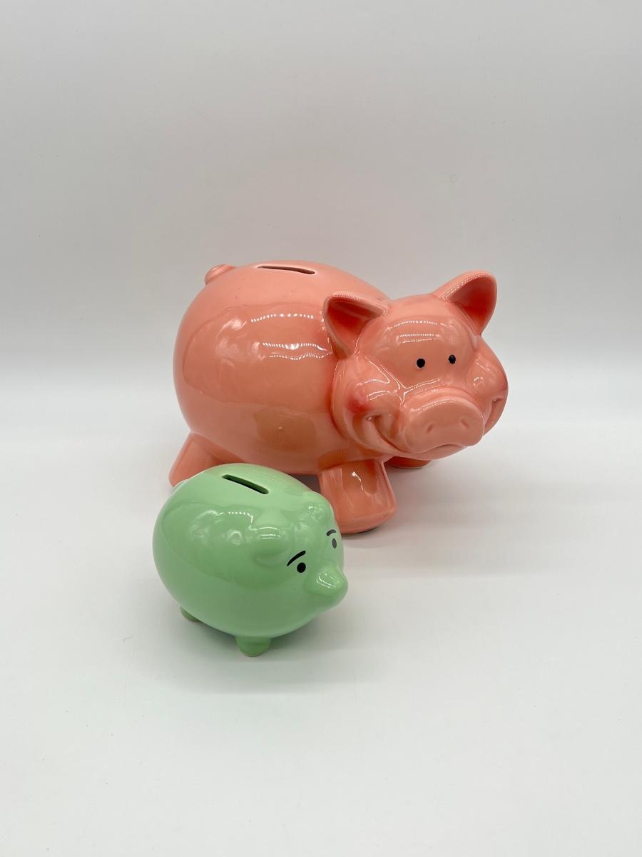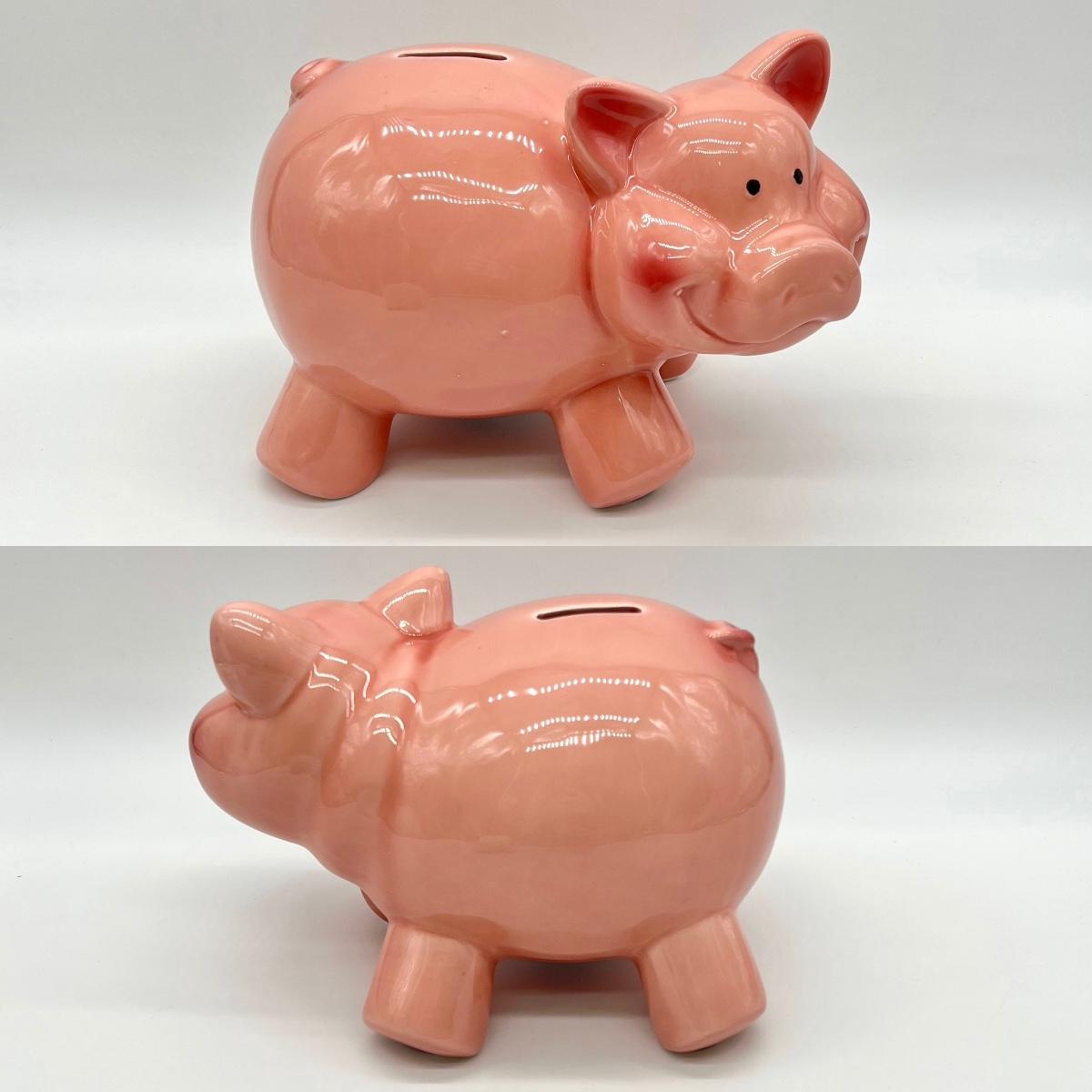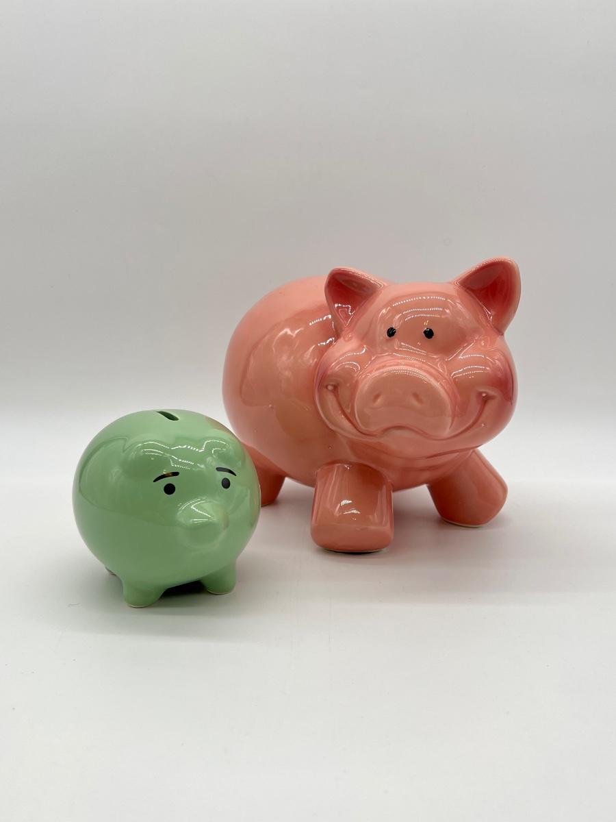 Larger piggy = 6.5” H x 6” W x 9 “ D ~ Smaller piggy = 3.5” H x 3.5” W x 4.5” D