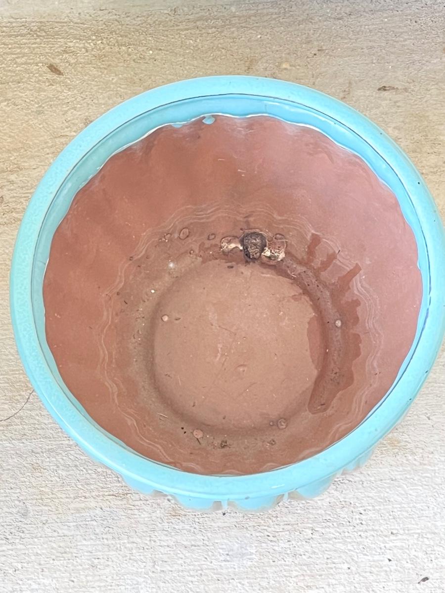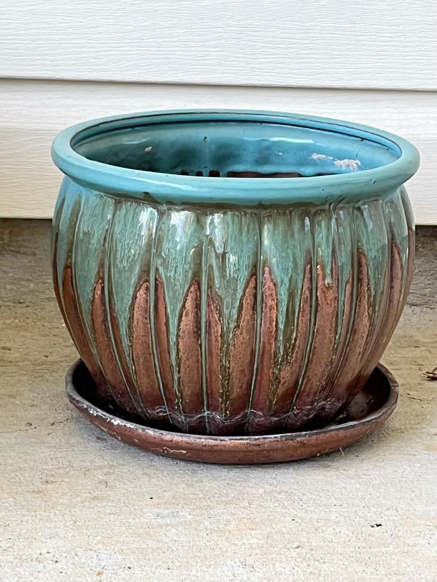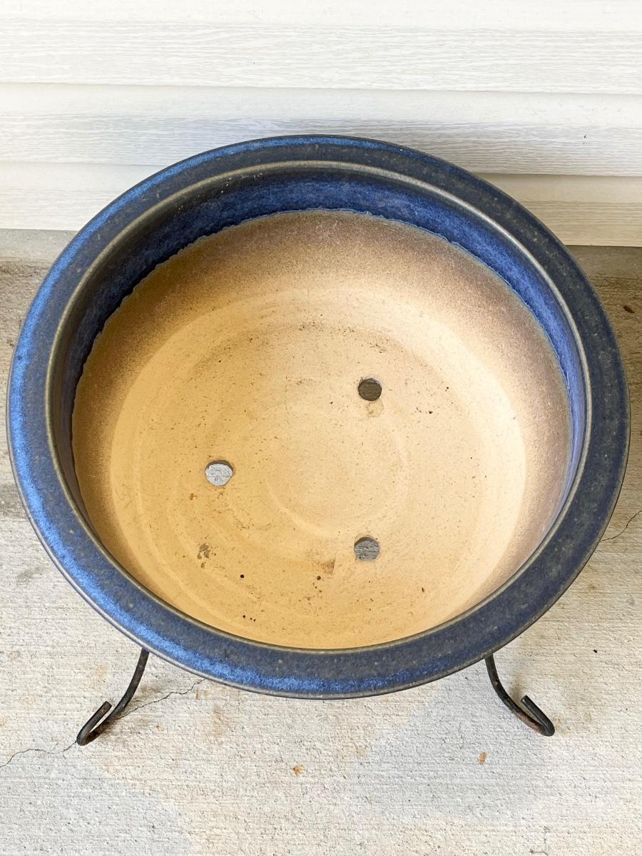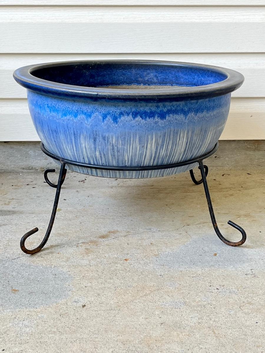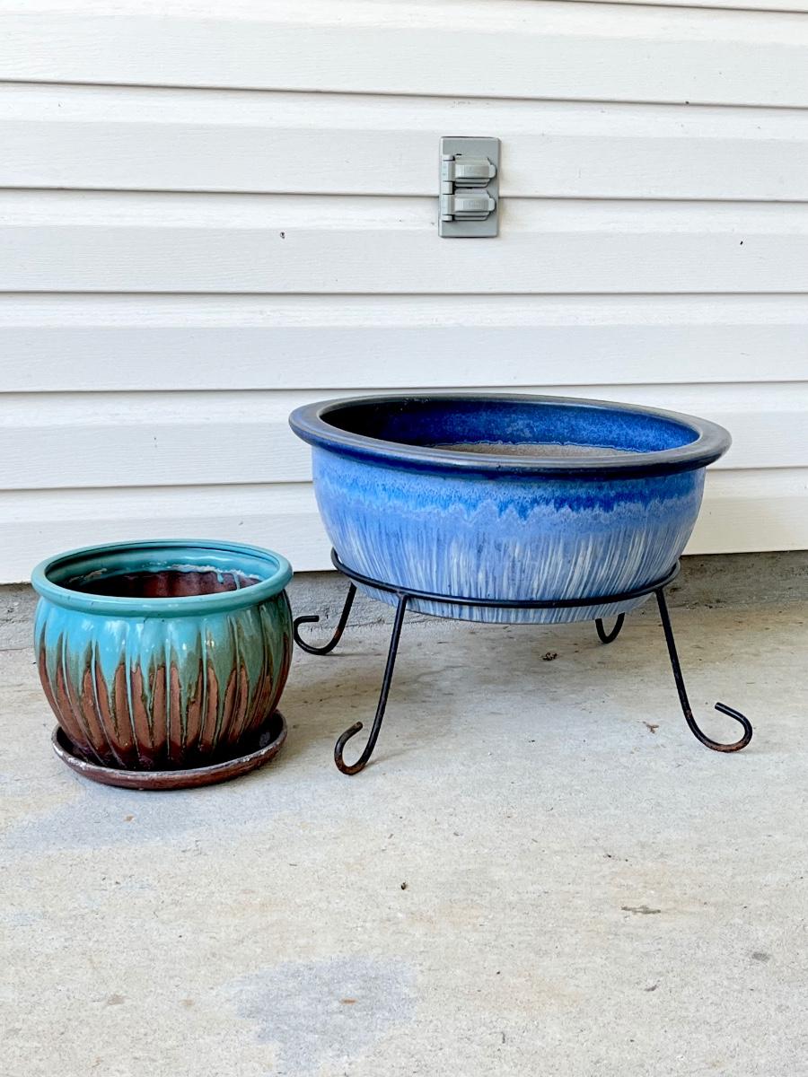 Includes = (1) Blue pot on stand 12” H 19” Round ~ Stand has minor rust as seen in photo ~ (1) Turquoise pot with attached tray 8” H x 10” Round ~