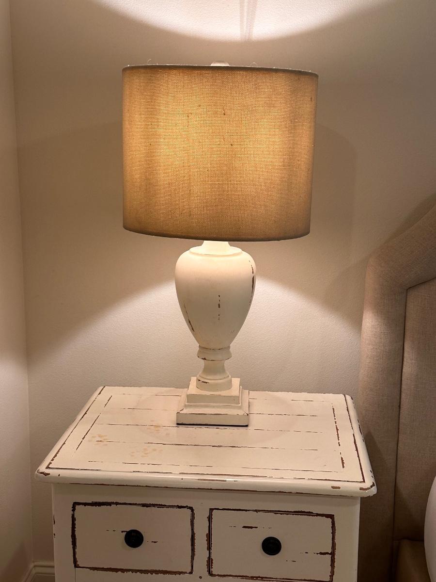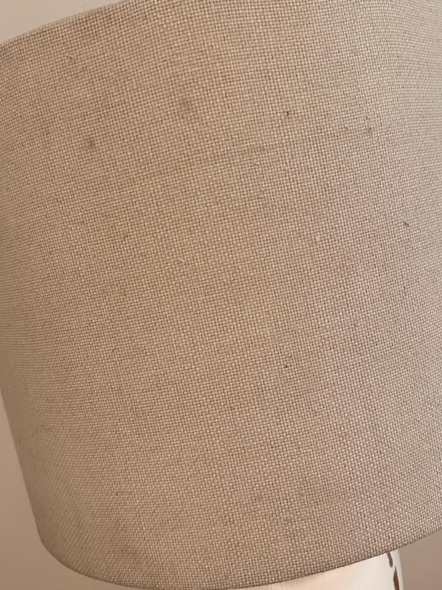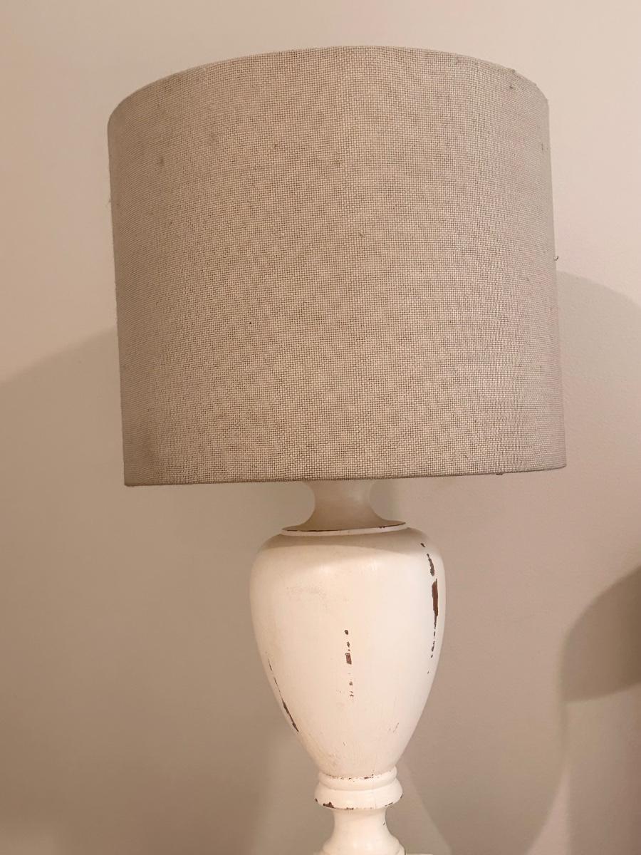 Shades are Tan ~ Distressed wooden base is off white in color ~ 31” H with a 16” Round Shade