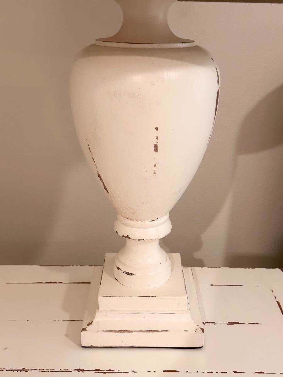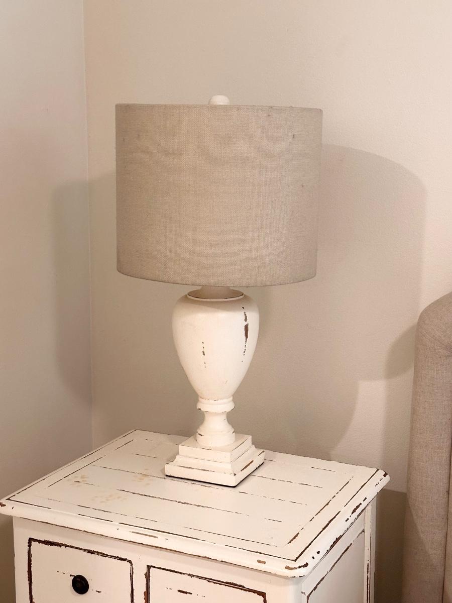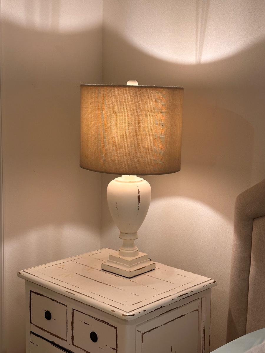 Shades are Tan ~ Distressed wooden base is off white in color ~ 31” H with a 16” Round Shade