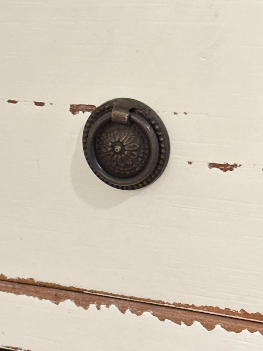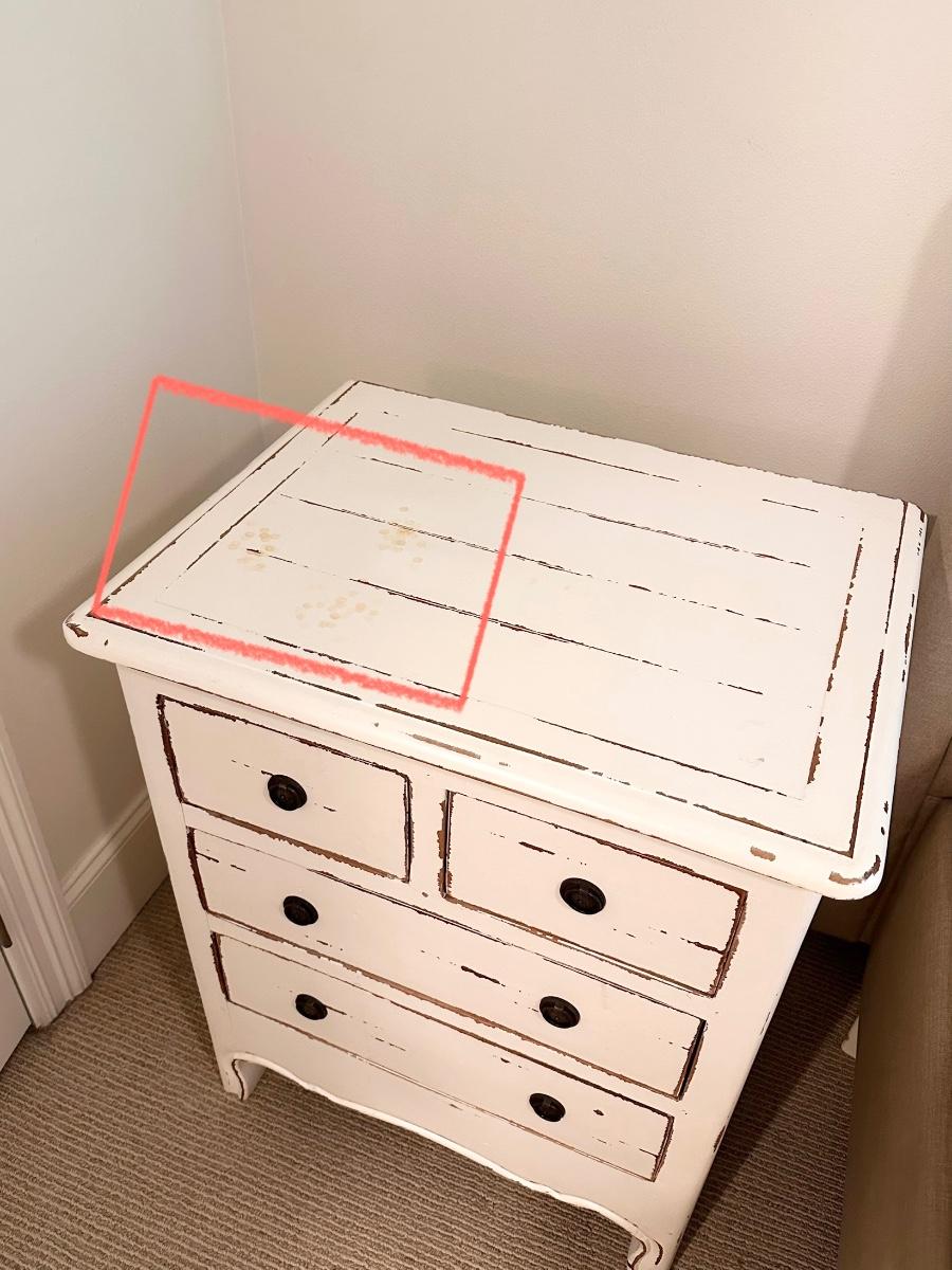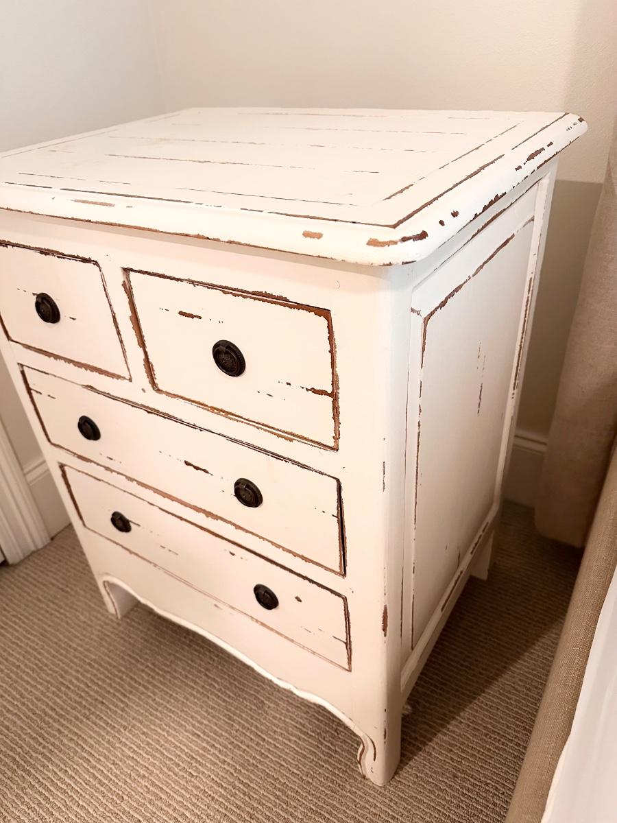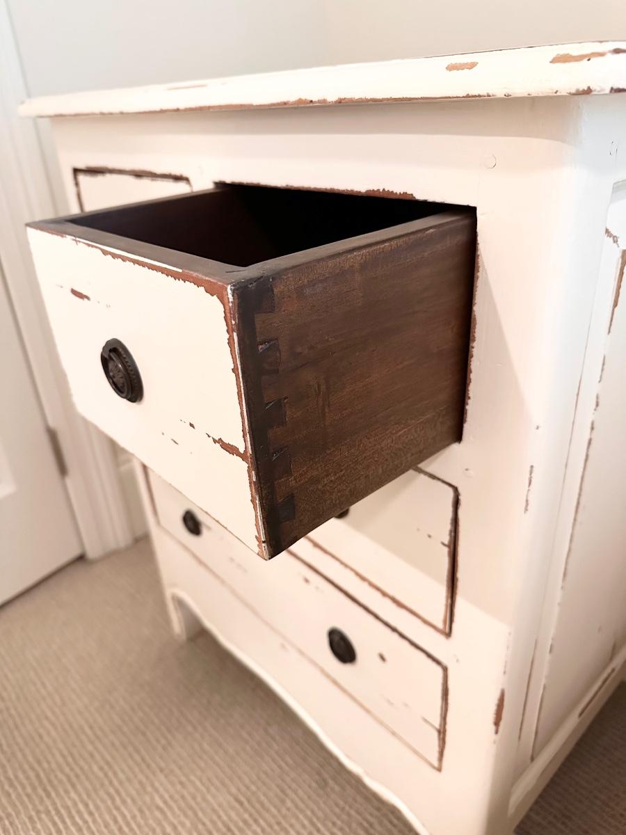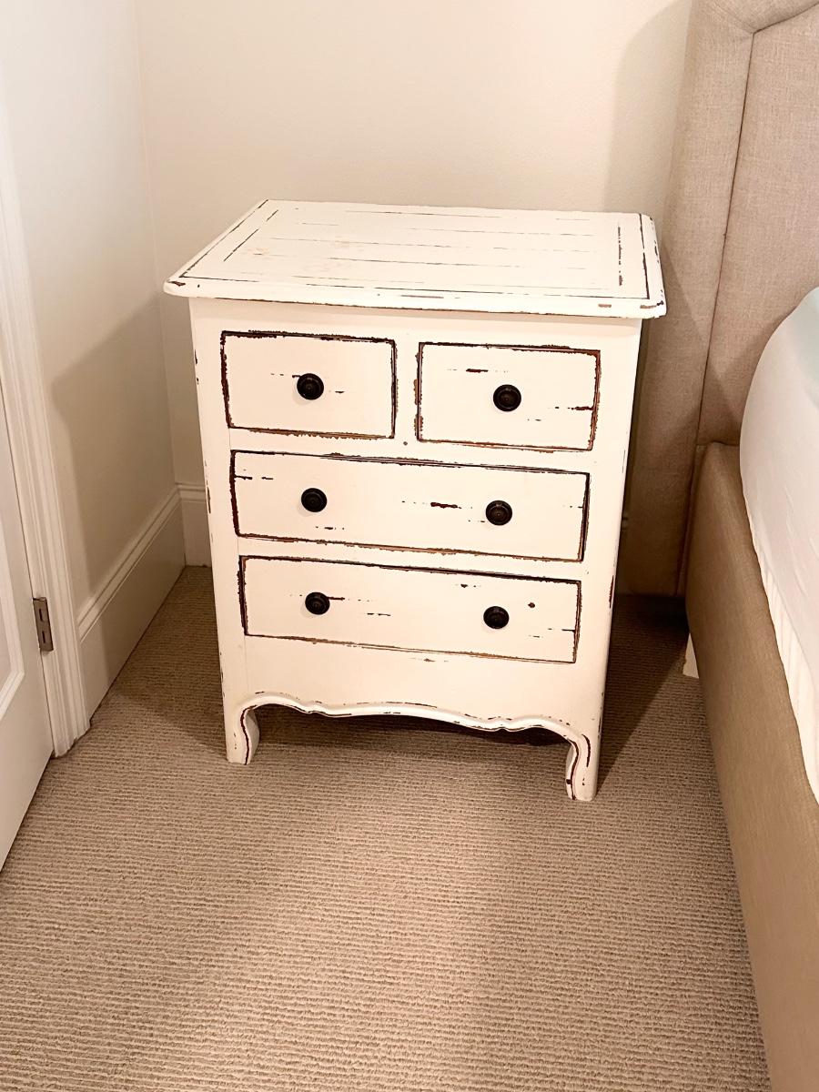 31” H x 26” W x 20” D ~ off white distressed. Solid , excellent ~ on the top of one, it has some some circles from the clock feet.
