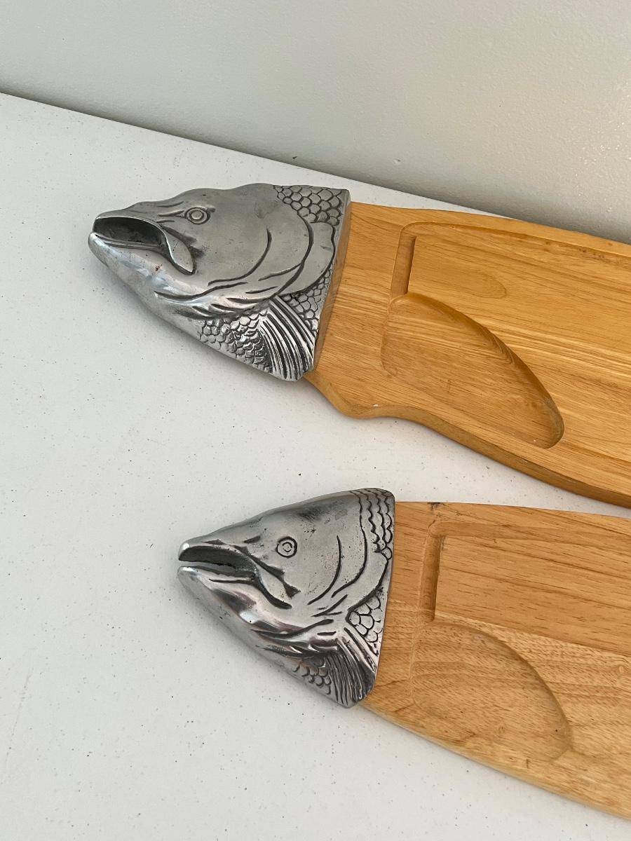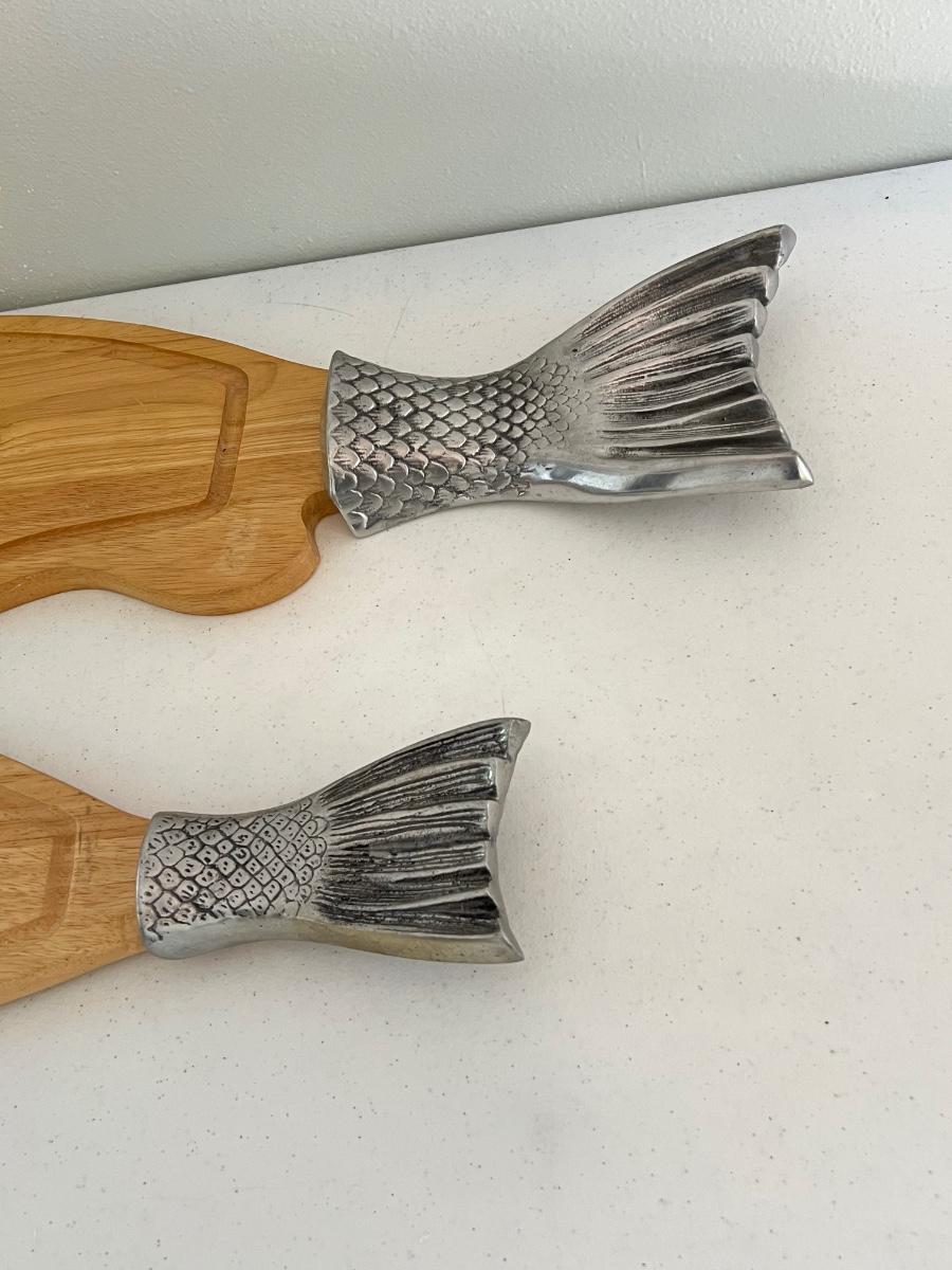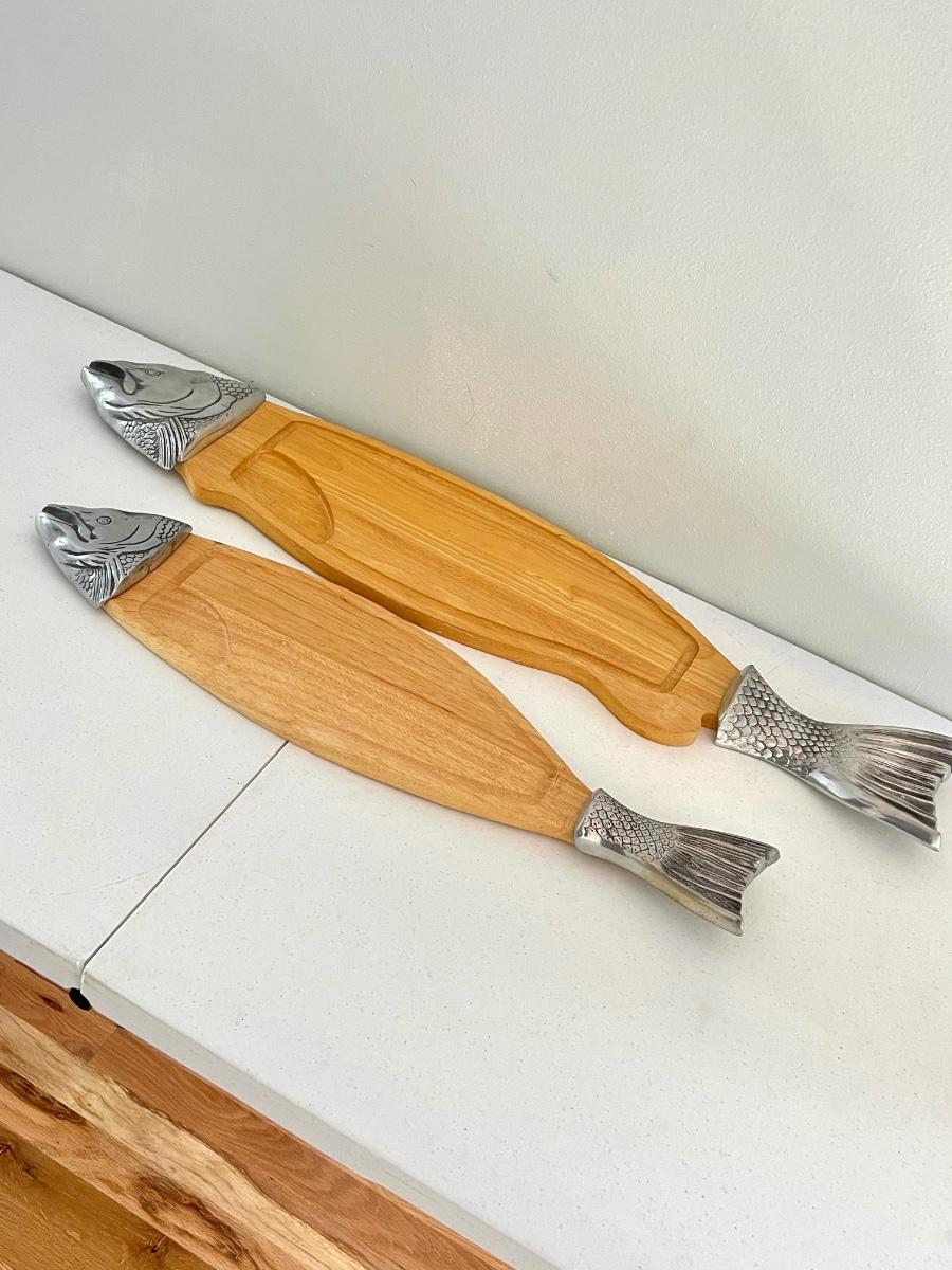 Pair (2) ~ Wood & Metal Salmon Fish Shaped Cutting Boards