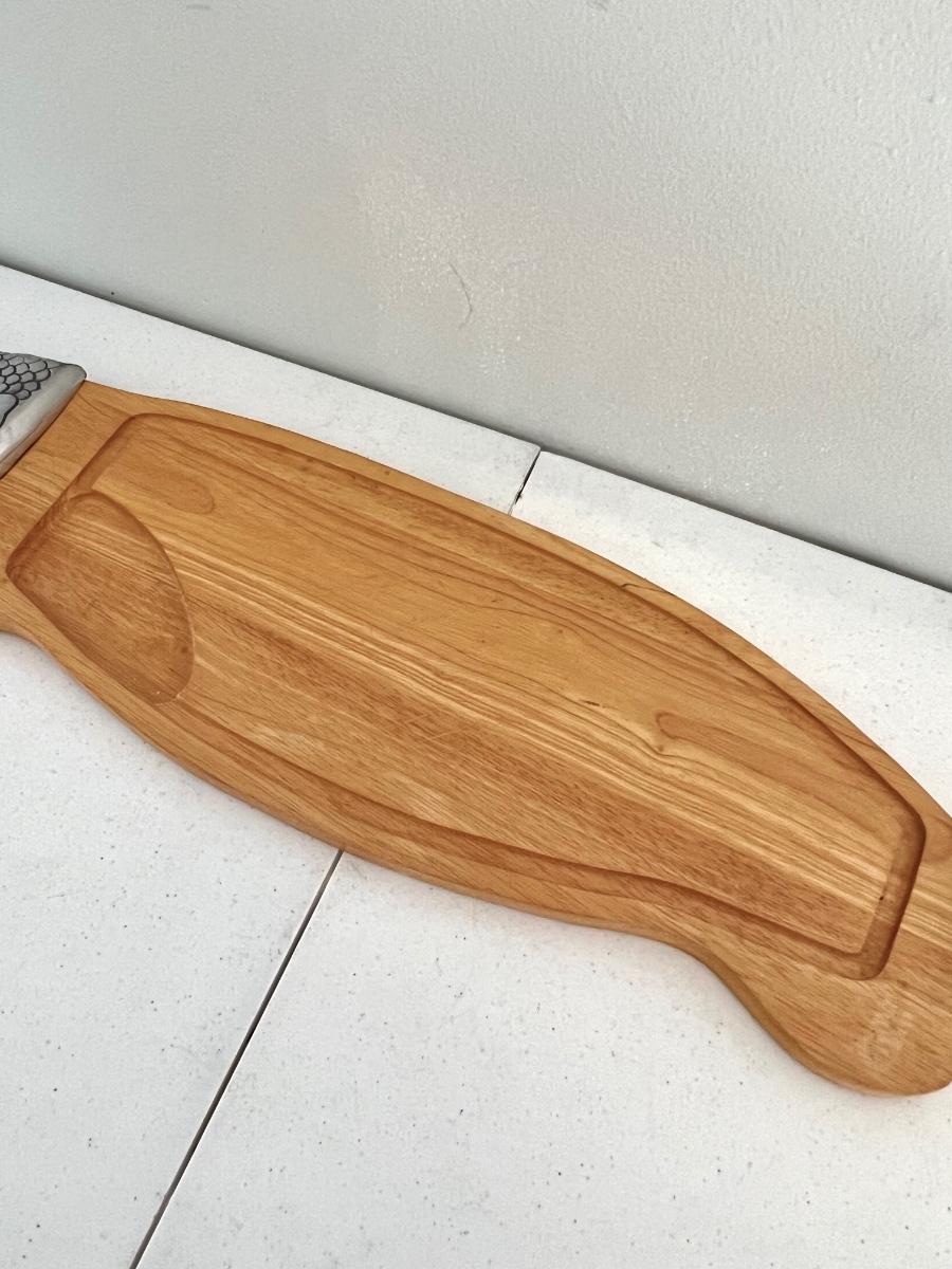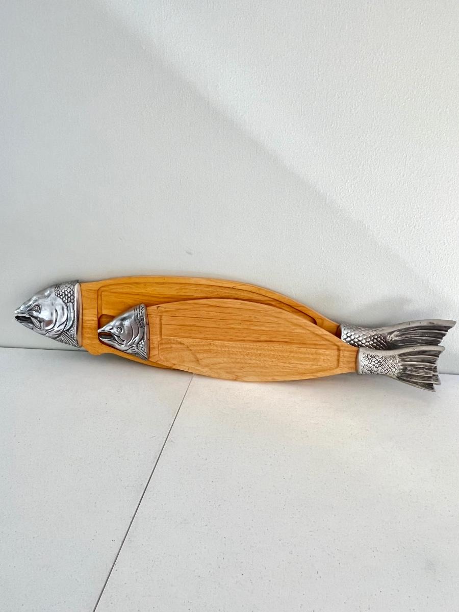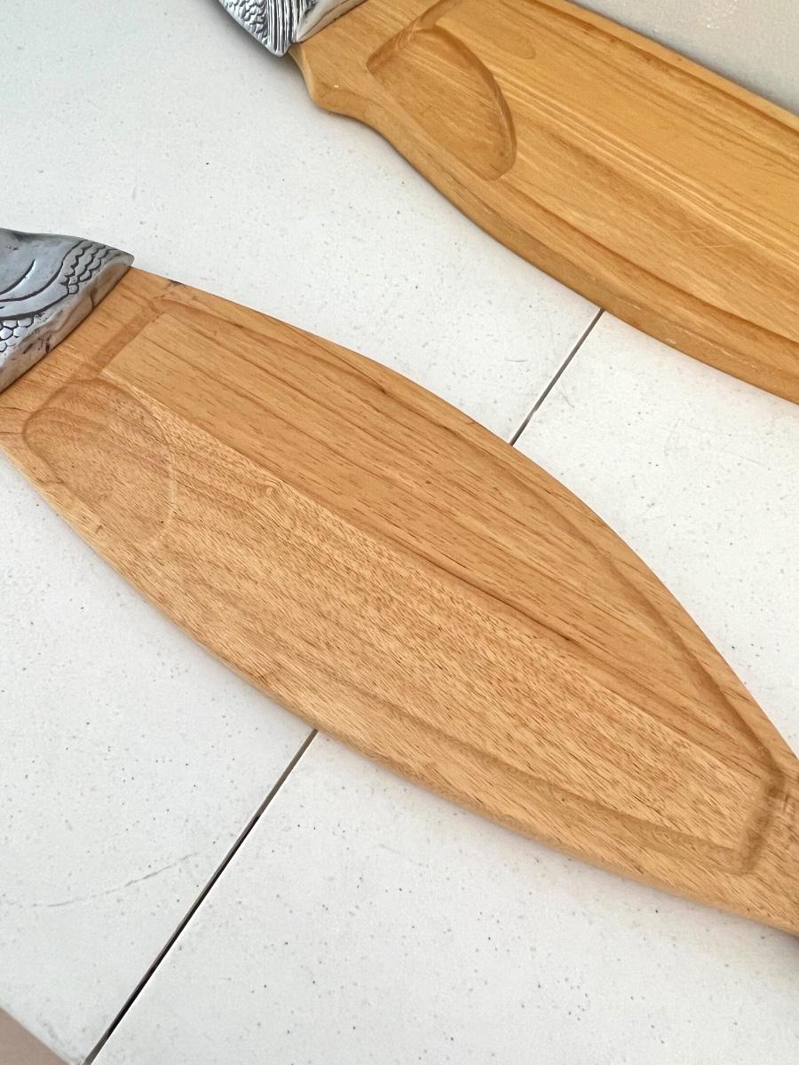 Pair (2) ~ Wood & Metal Salmon Fish Shaped Cutting Boards