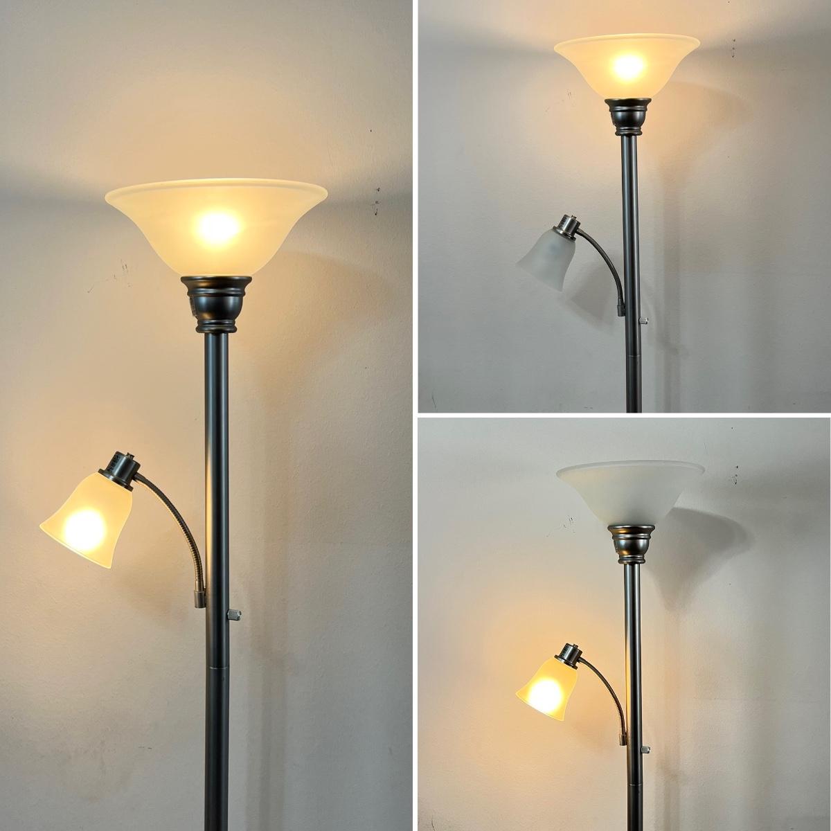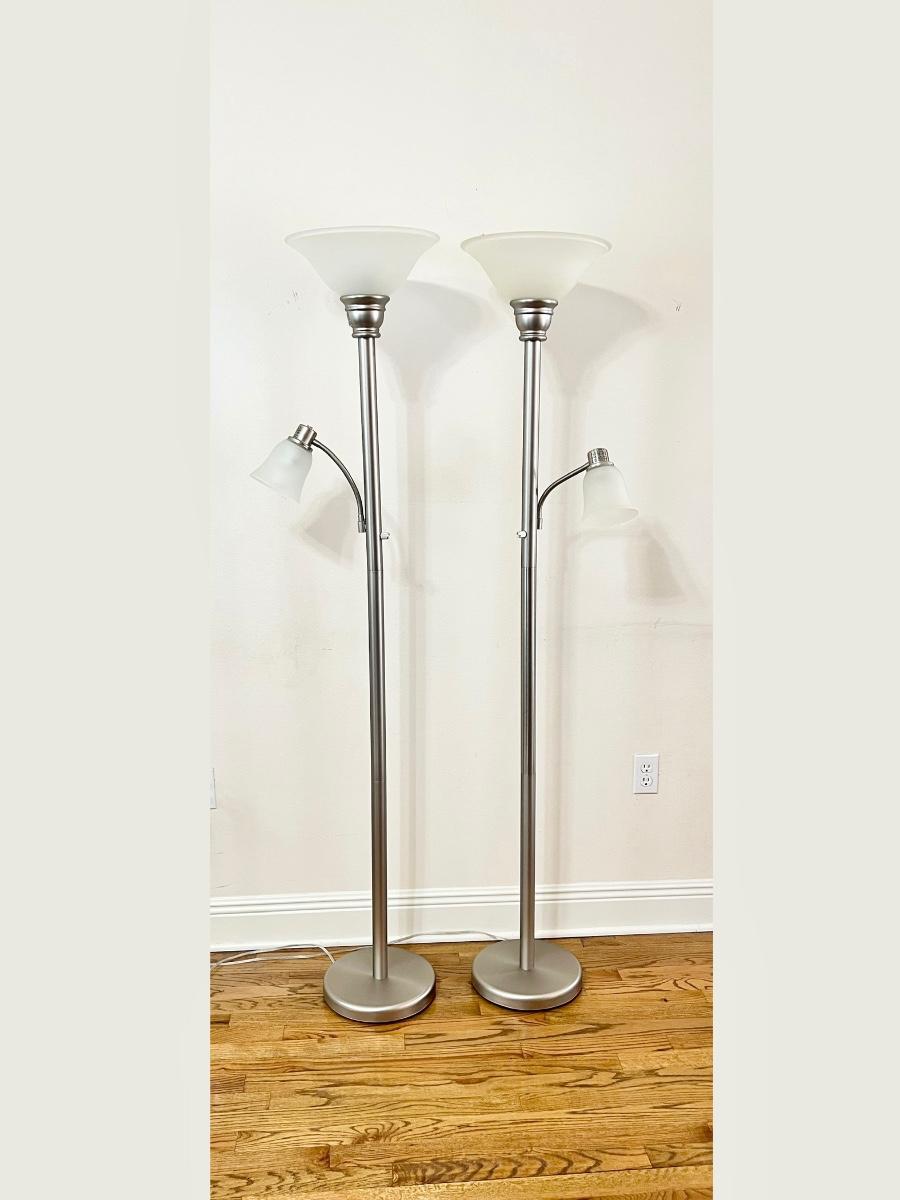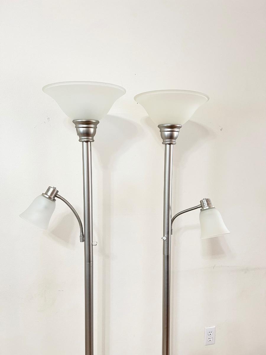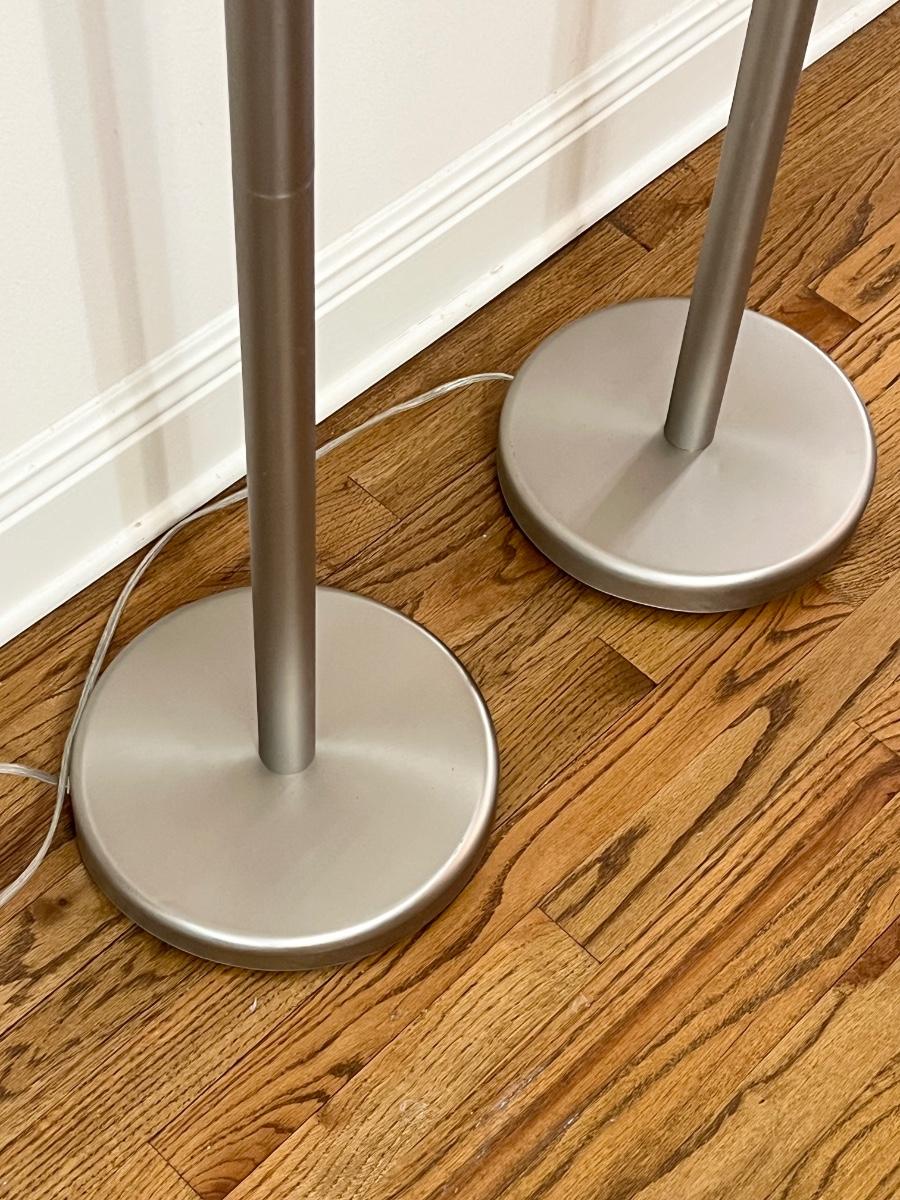 Shades are glass ~ See photo for type of bulb the lamps use ~ Both = 71” H x 13” Round