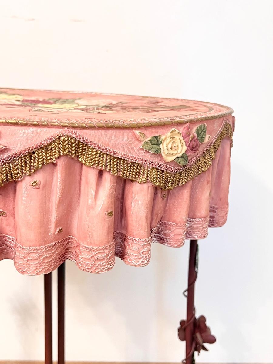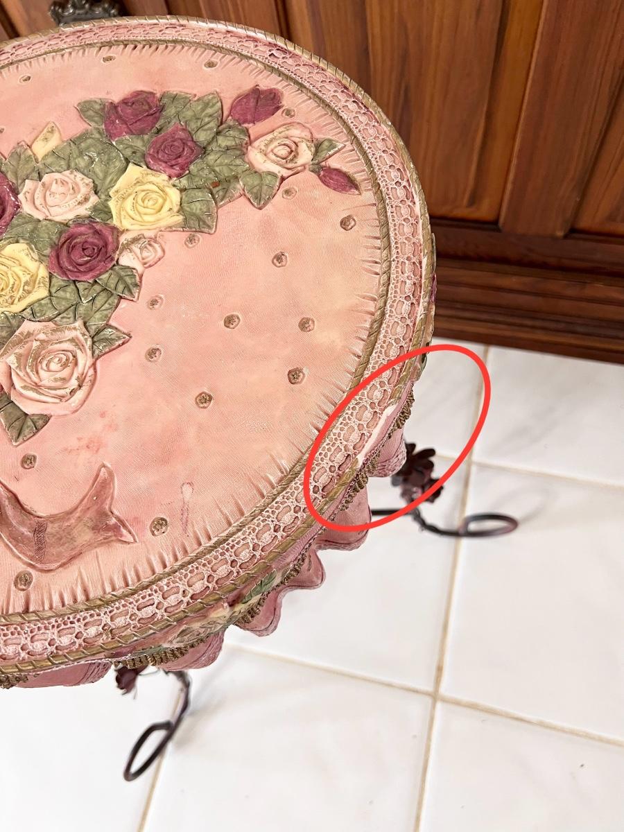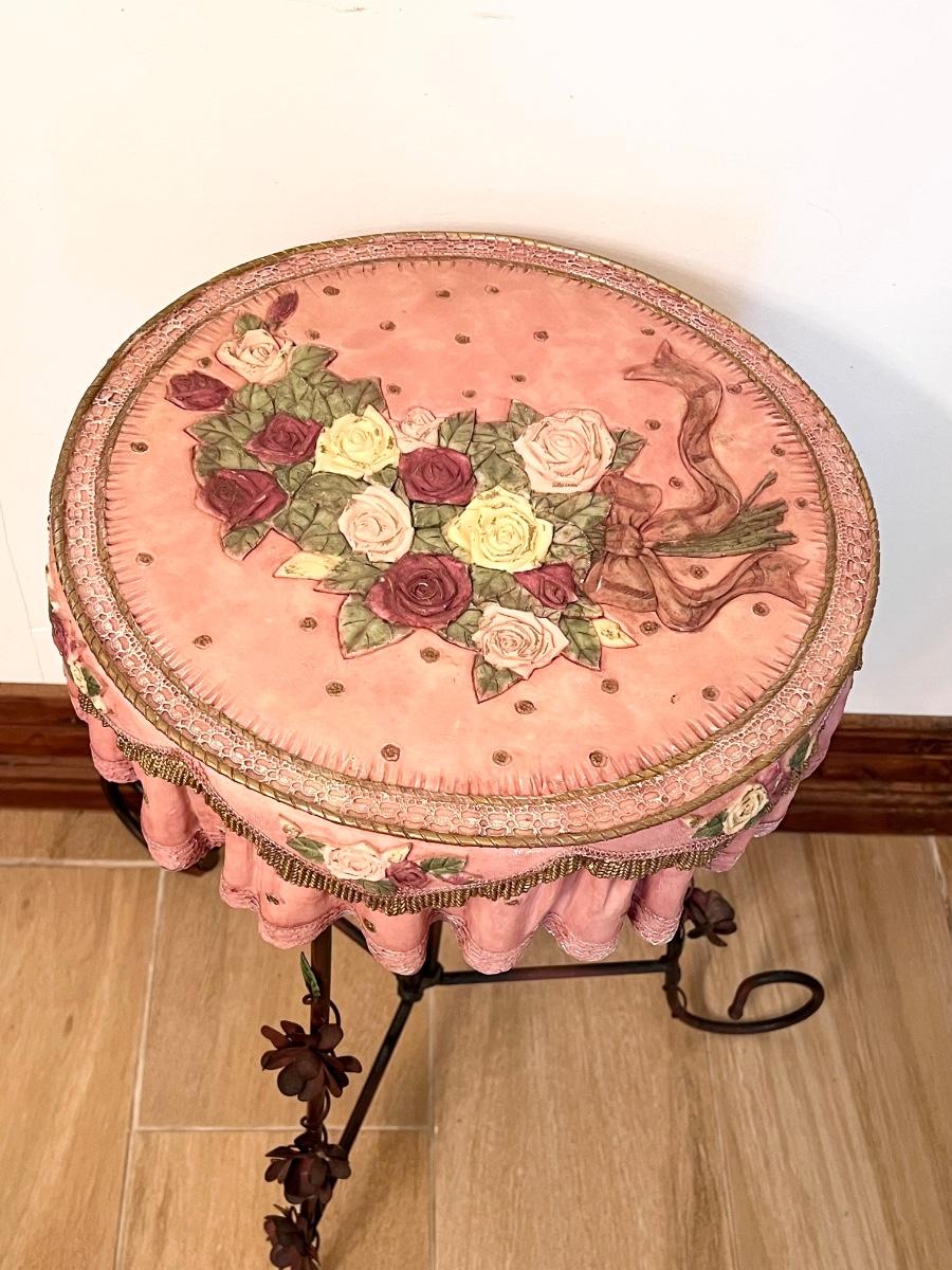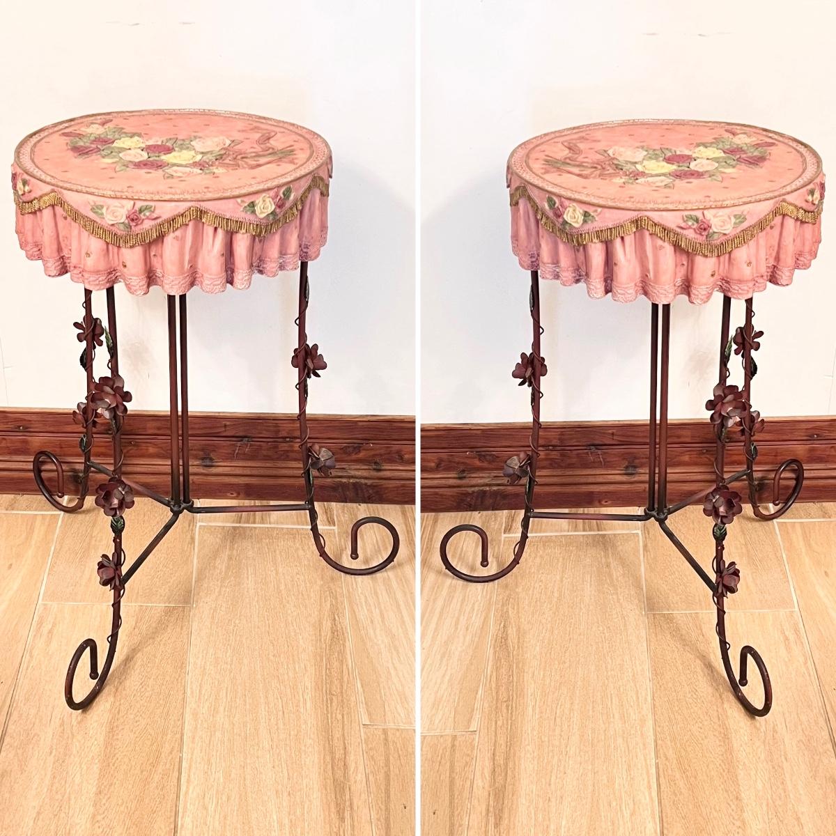 Tops can be removed from folding base ~ Base is made of metal ~ Top is a solid heavy resin based material ~ No brand ~ Both = 27” H x 22” Round at feet ~ Table Top = 15.5” Round