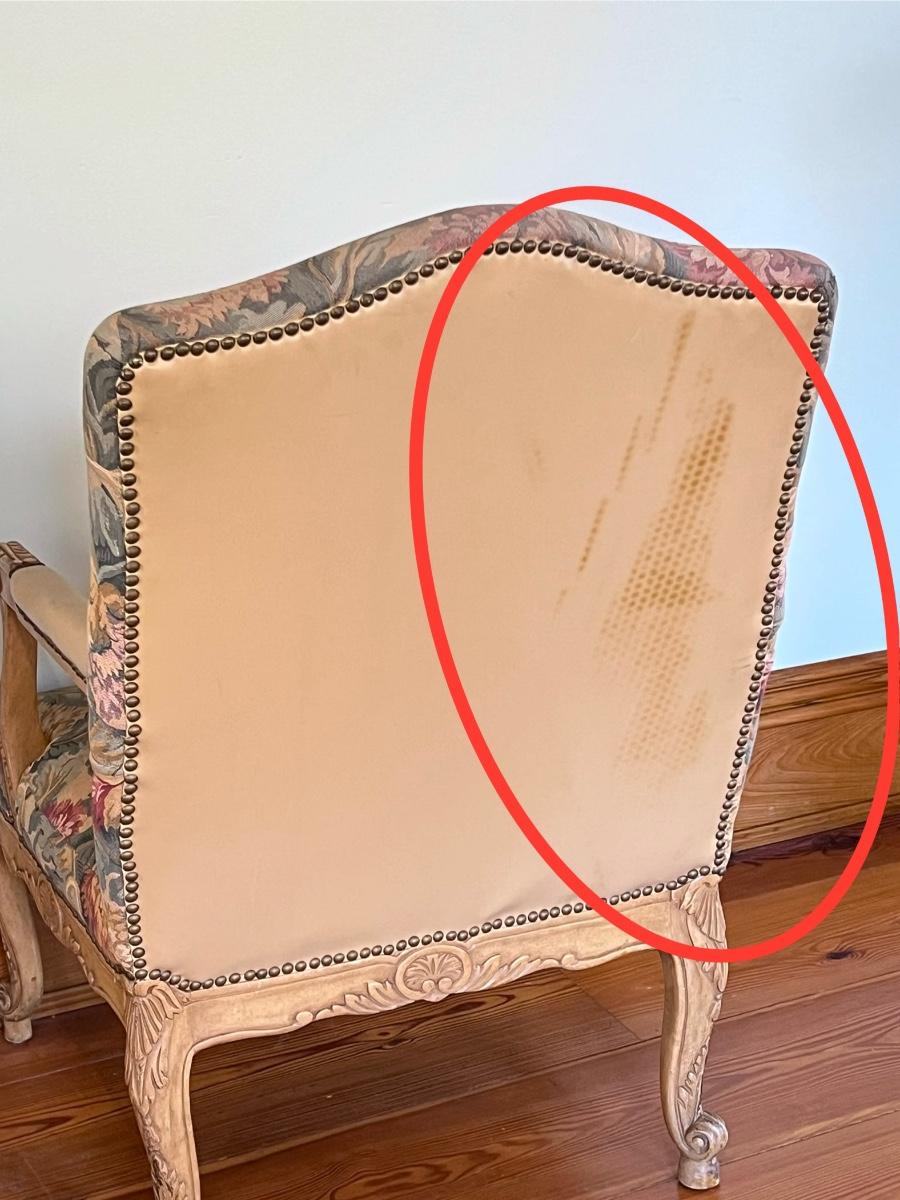 No brand ~ No pets, no smoking ~ Backs of chairs has minor damage, see photos, 1 chair has small hole & other chair some discoloration ~ 43” H x 30” W x 31” D ~ upholstery has been sanitized, deodorized and disinfected.